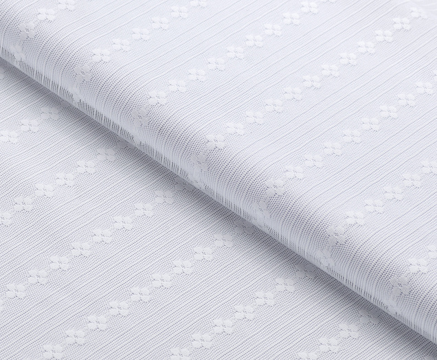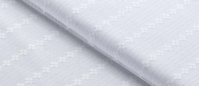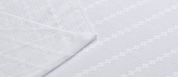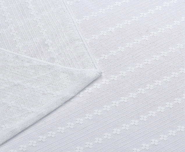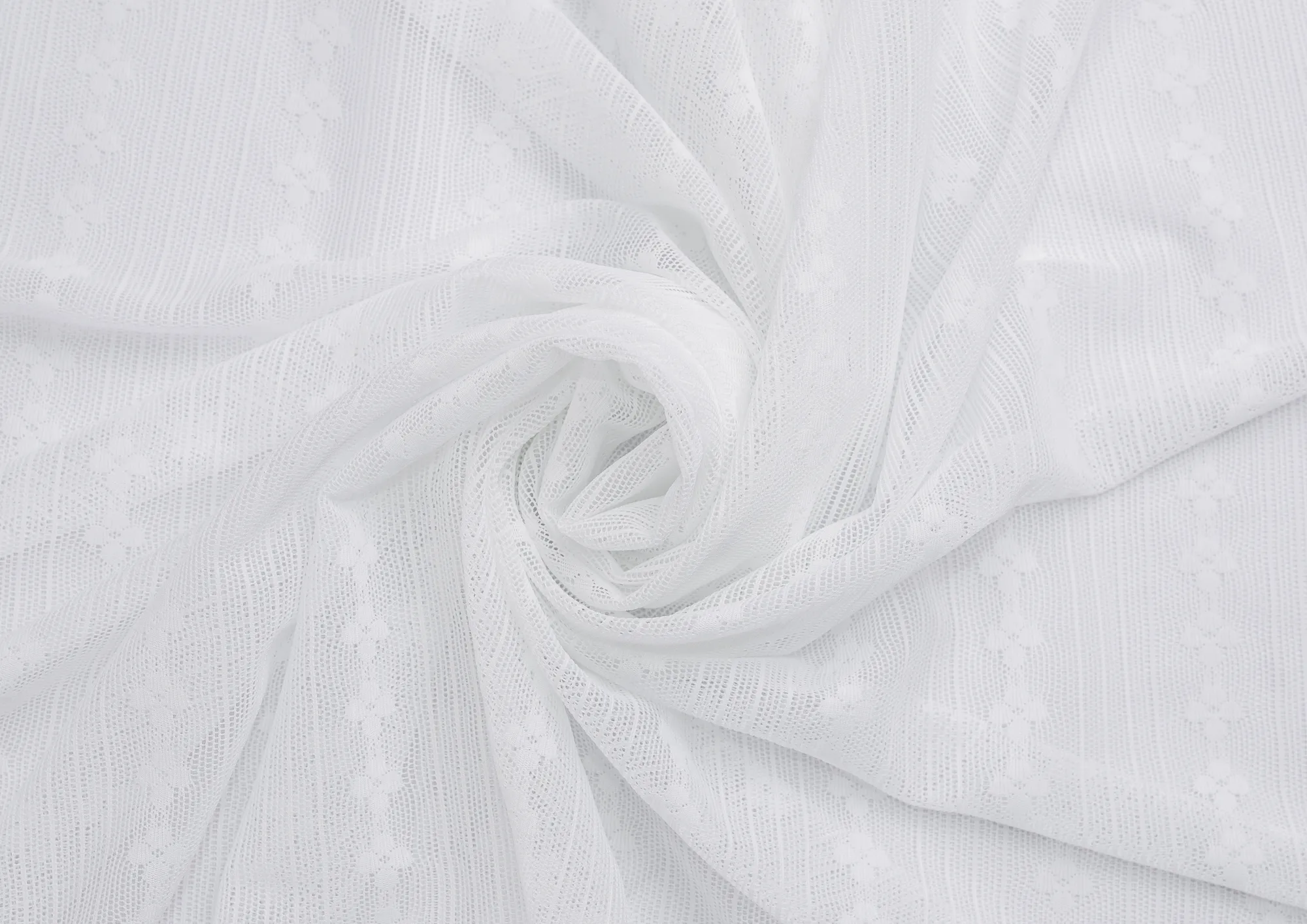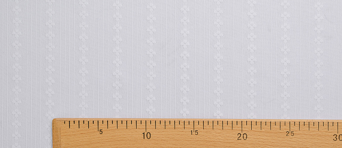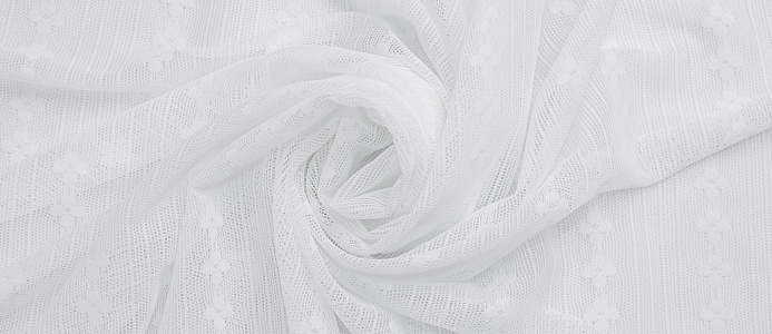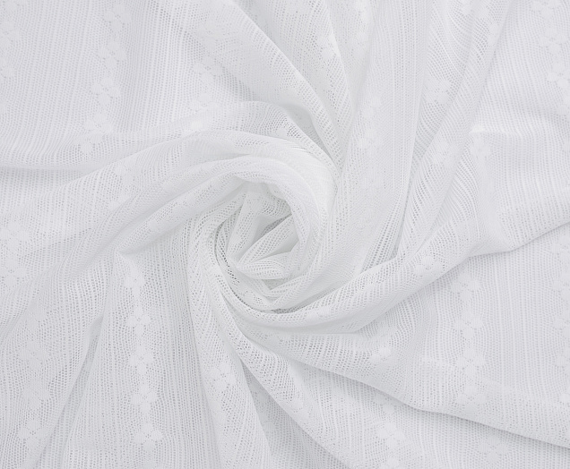 Тонкая эластичная сетка. Мягкая, приятная на ощупь. Сетка прекрасно драпируется. Полосы расположены вдоль длины полотна. Ширина между цветочными полосами 35 мм, между узкими 5 мм, d цветка 10 мм. Сетчатая ткань используется для рукоделия, пошива нижнего белья, нарядной одежды и аксессуаров.
