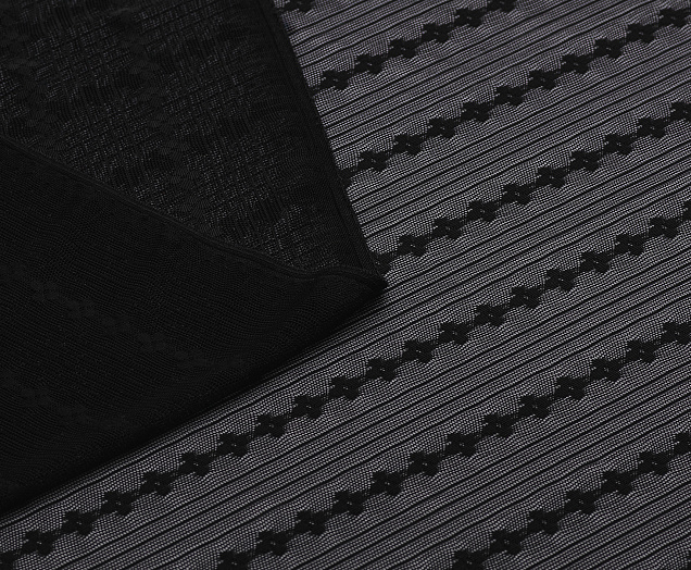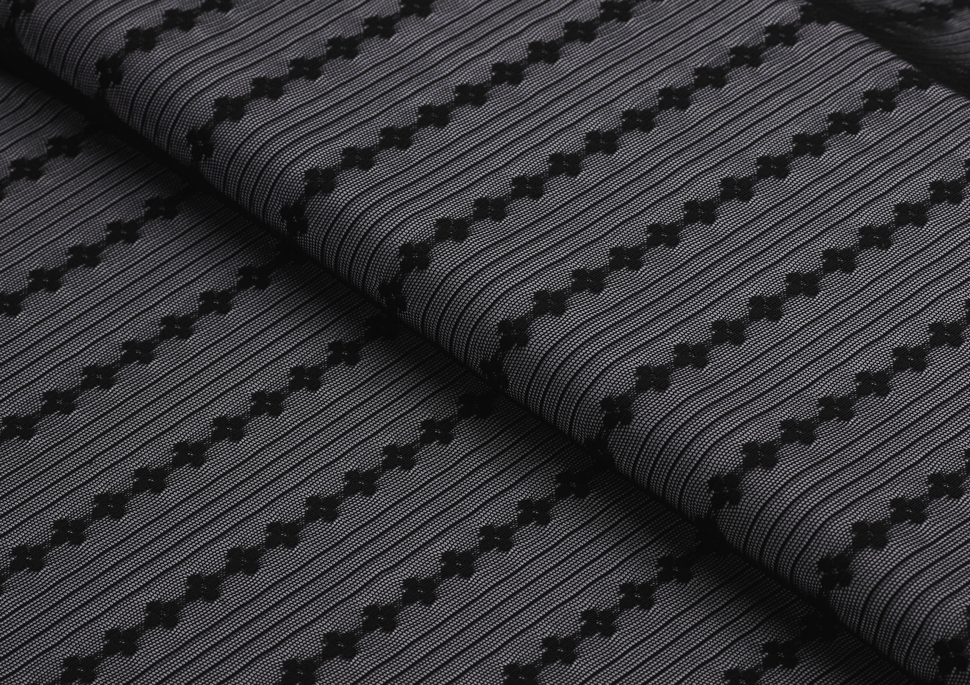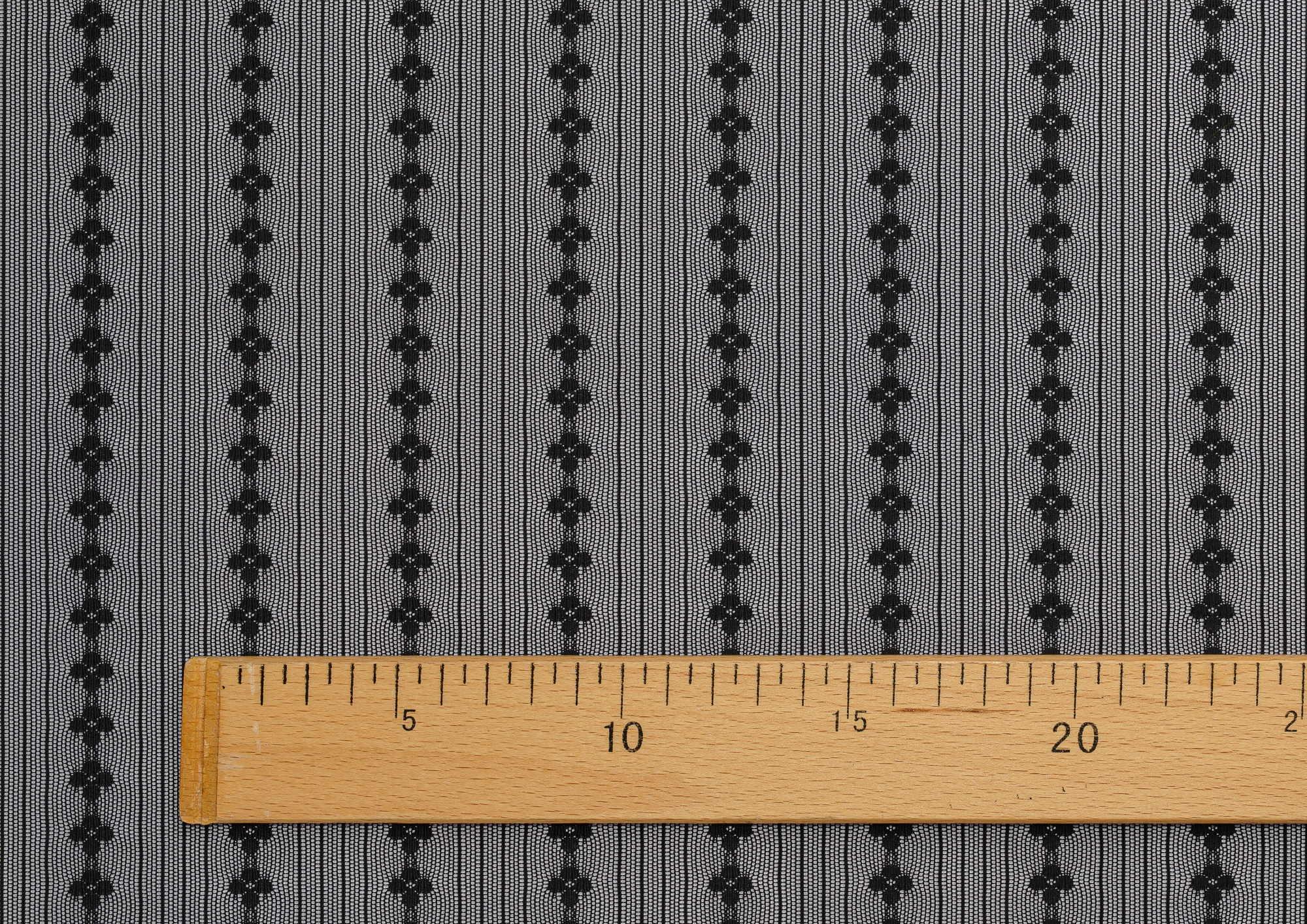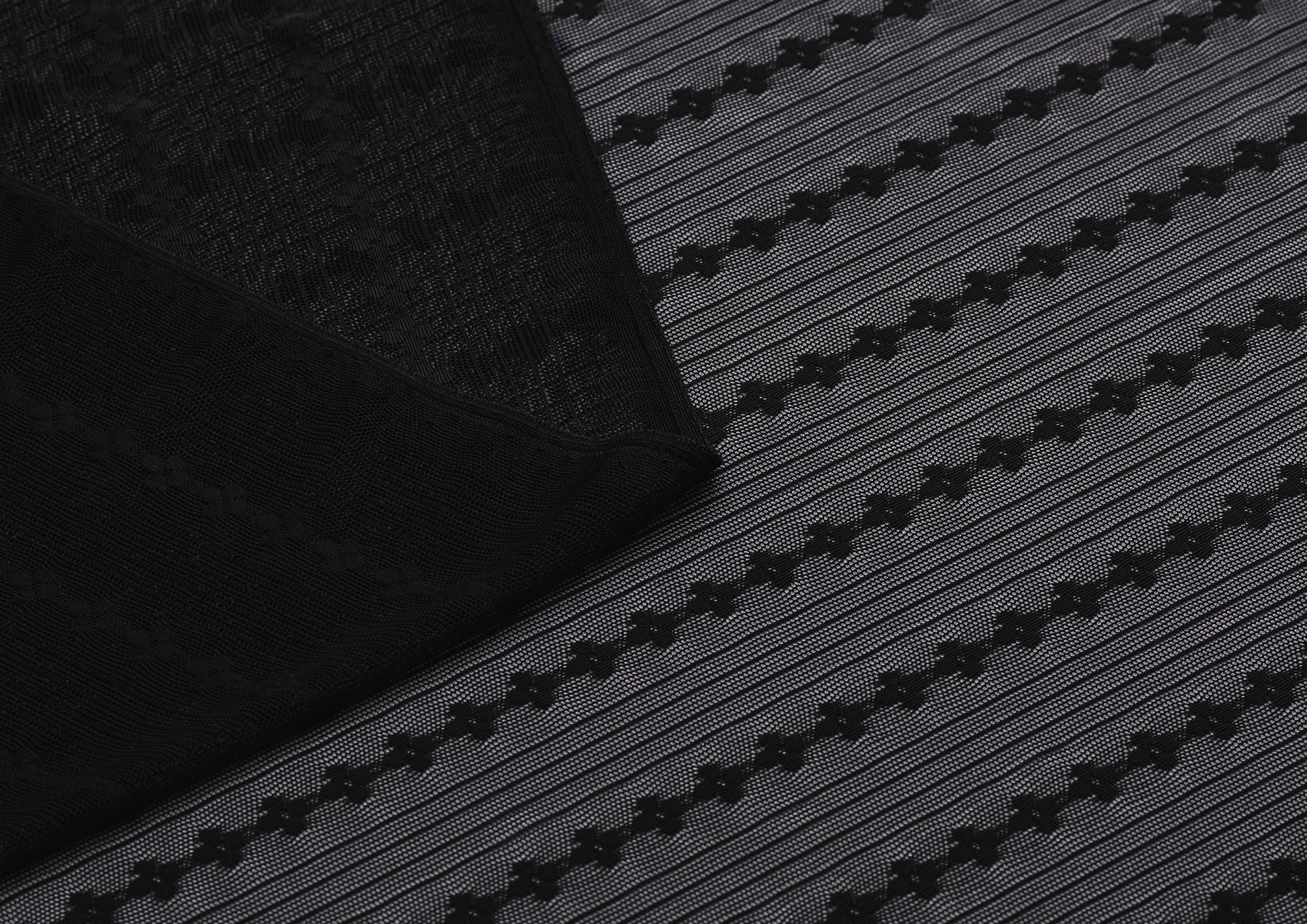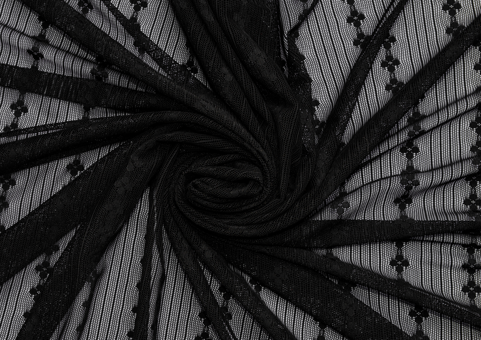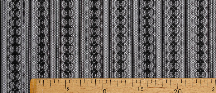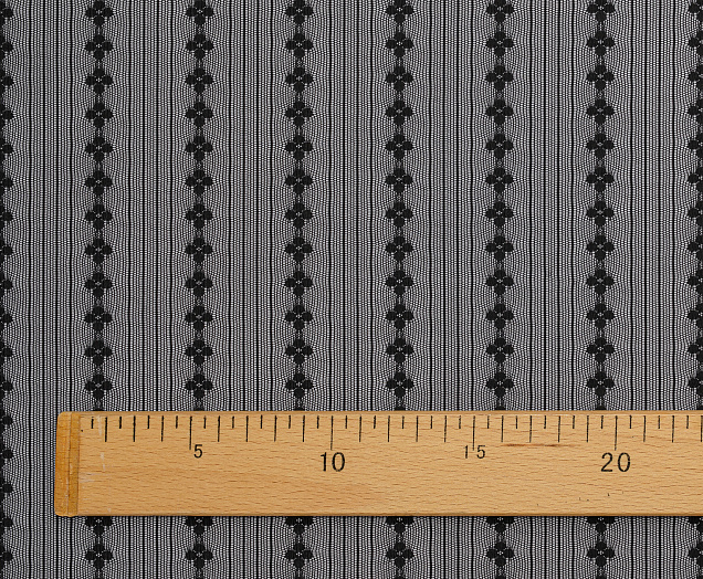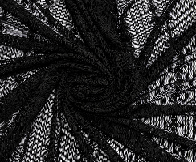 Тонкая эластичная сетка. Мягкая, приятная на ощупь. Сетка прекрасно драпируется. Полосы расположены вдоль длины полотна. Ширина между цветочными полосами 35 мм, между узкими 5 мм, d цветка 10 мм. Сетчатая ткань используется для рукоделия, пошива нижнего белья, нарядной одежды и аксессуаров.