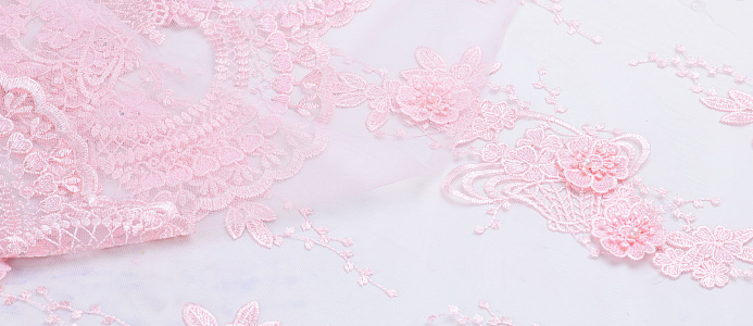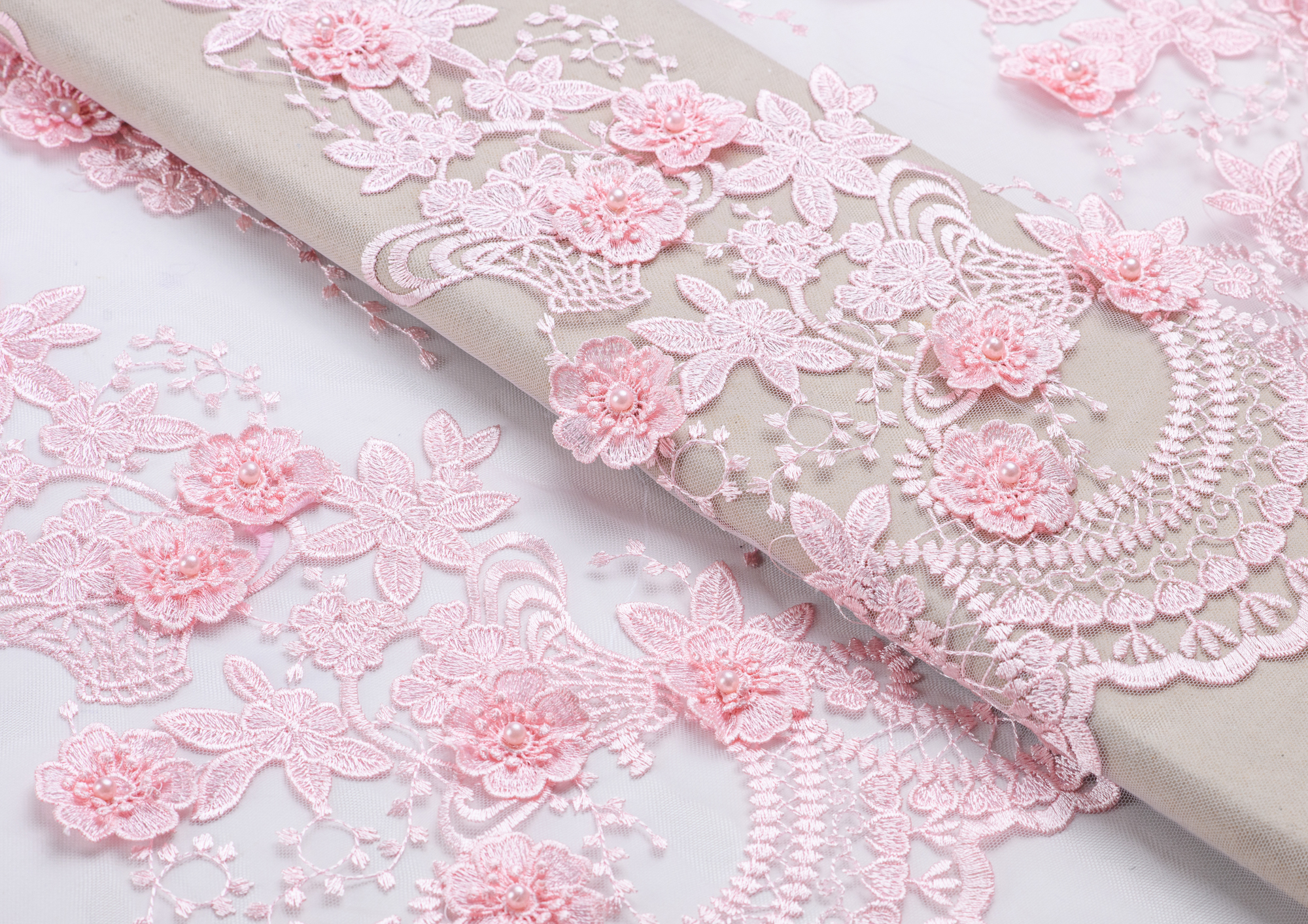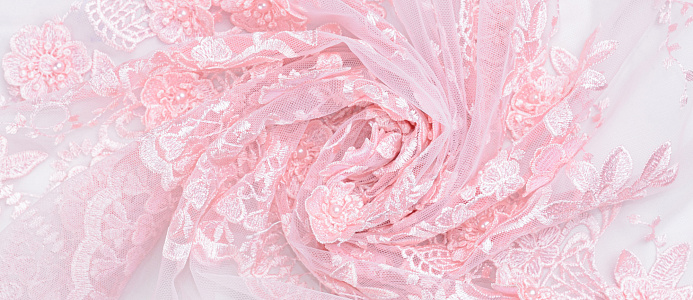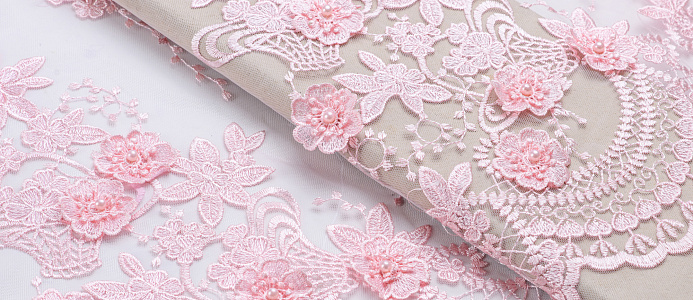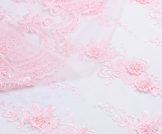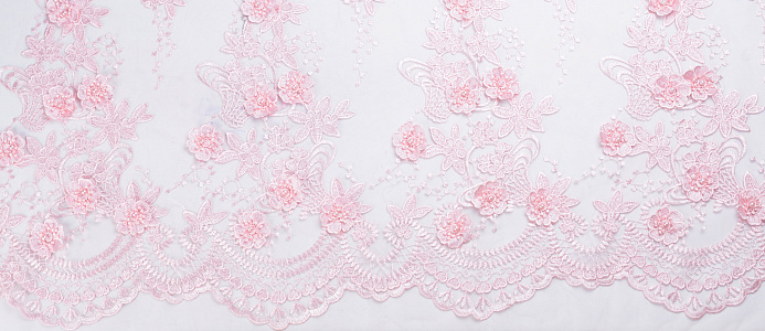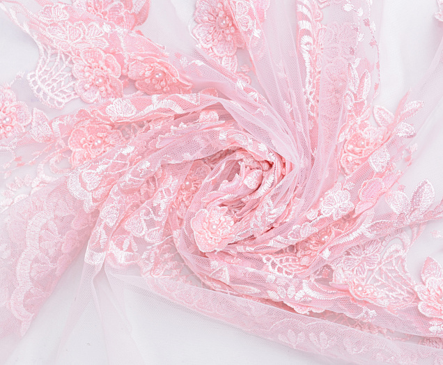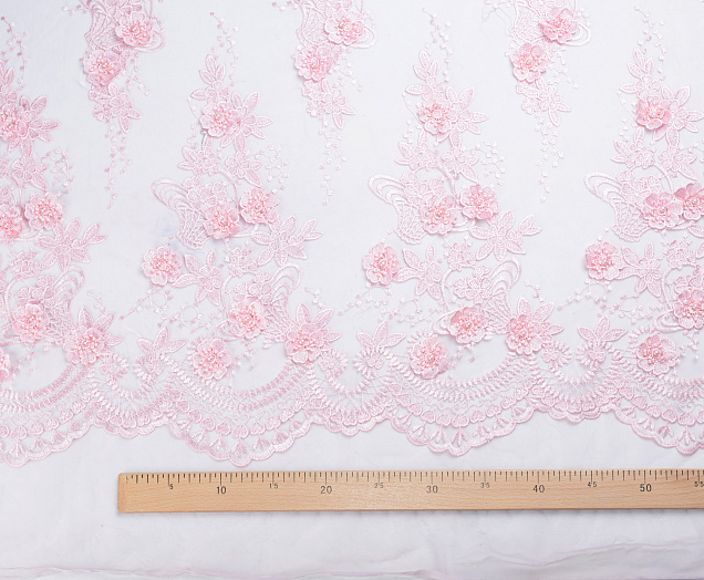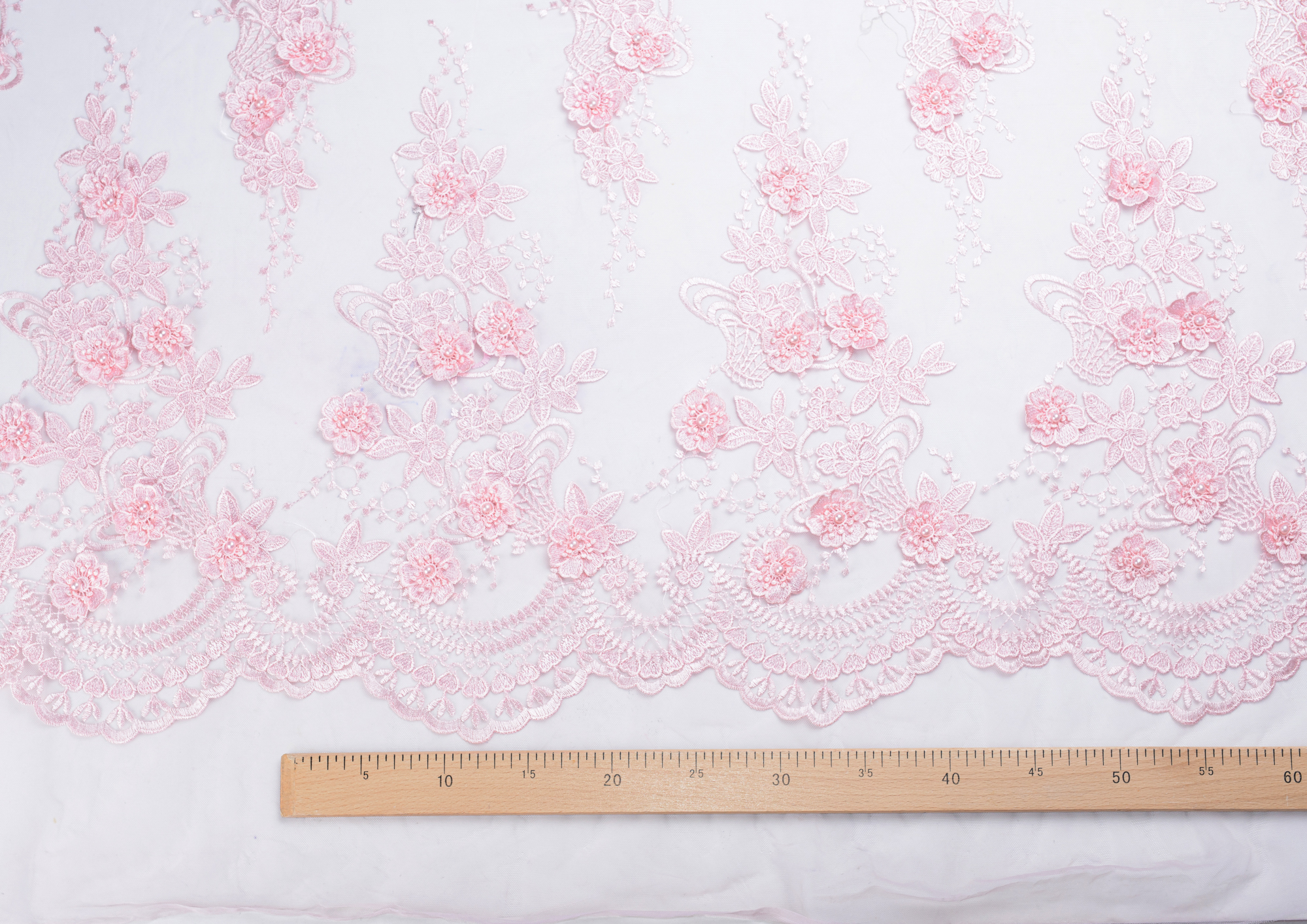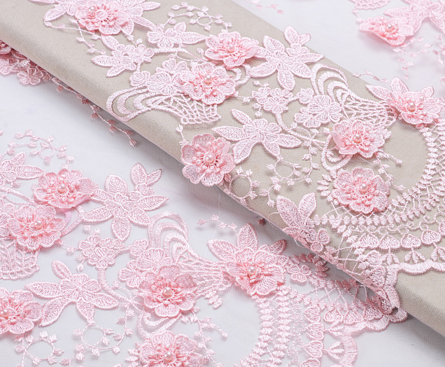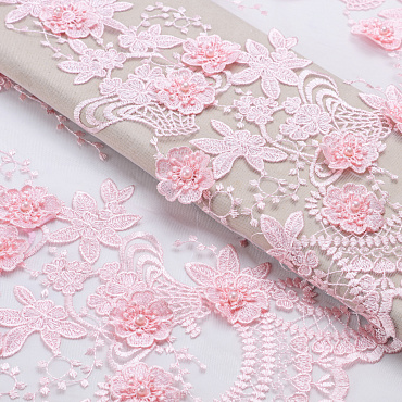 Кружево с бусинами в тон полотна, эластичное, фестоны с двух сторон (вырезные), выполнена на тонкой сеточке. По всем полотну равномерно расположен цветочный орнамент 3d. При пошиве требует подклада. Из кружево шьют нарядные, вечерние, торжественные платья, костюмы.
