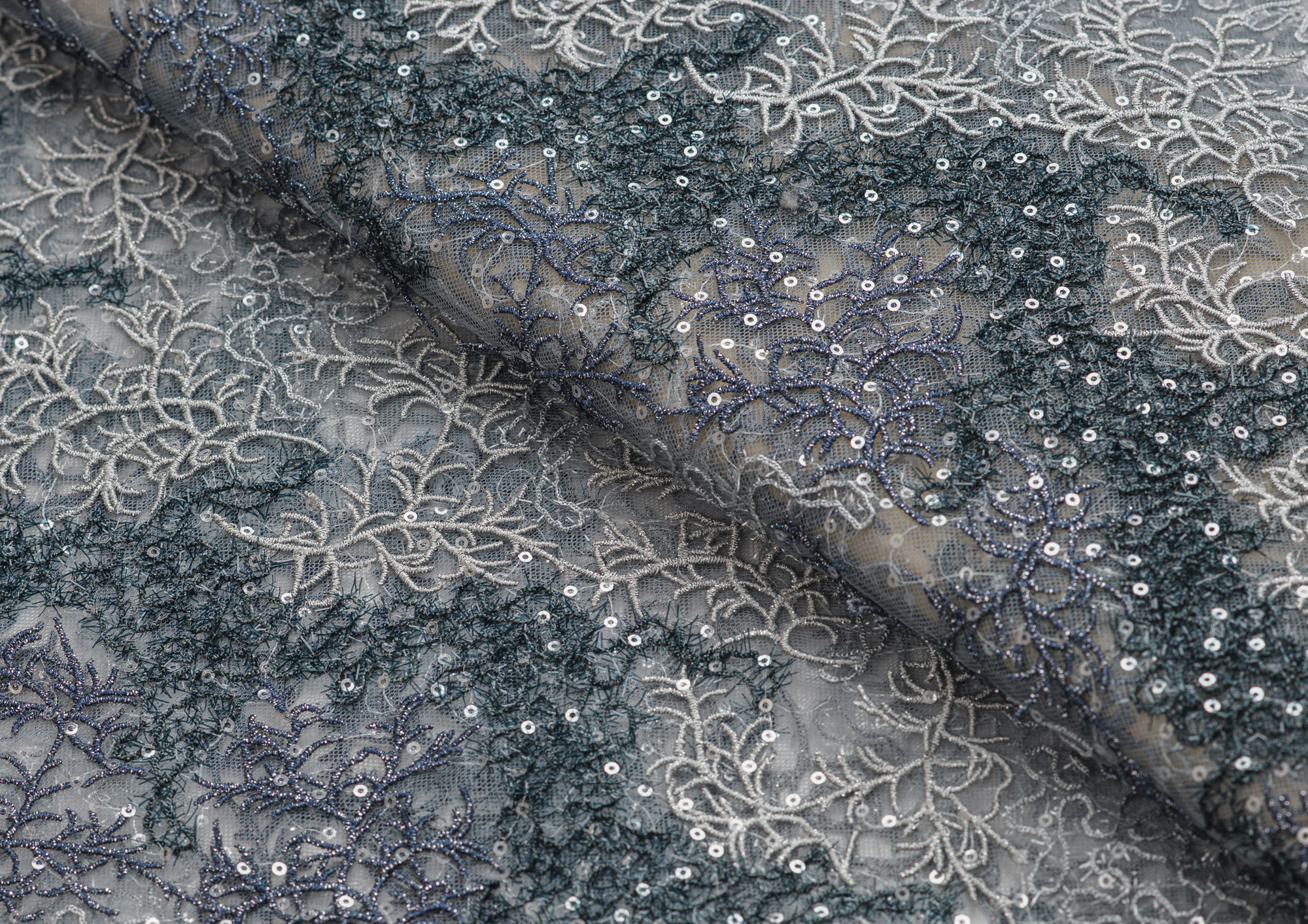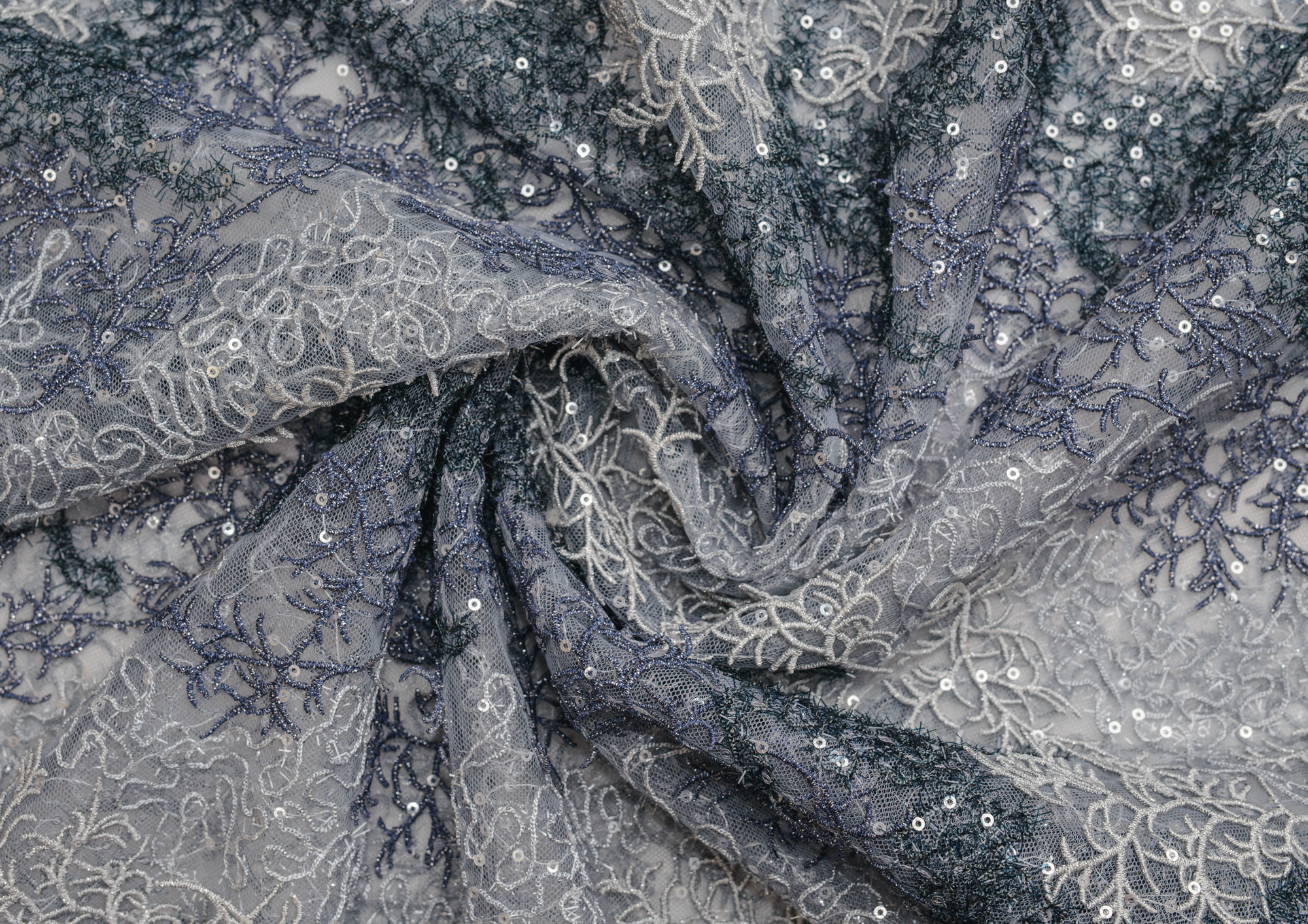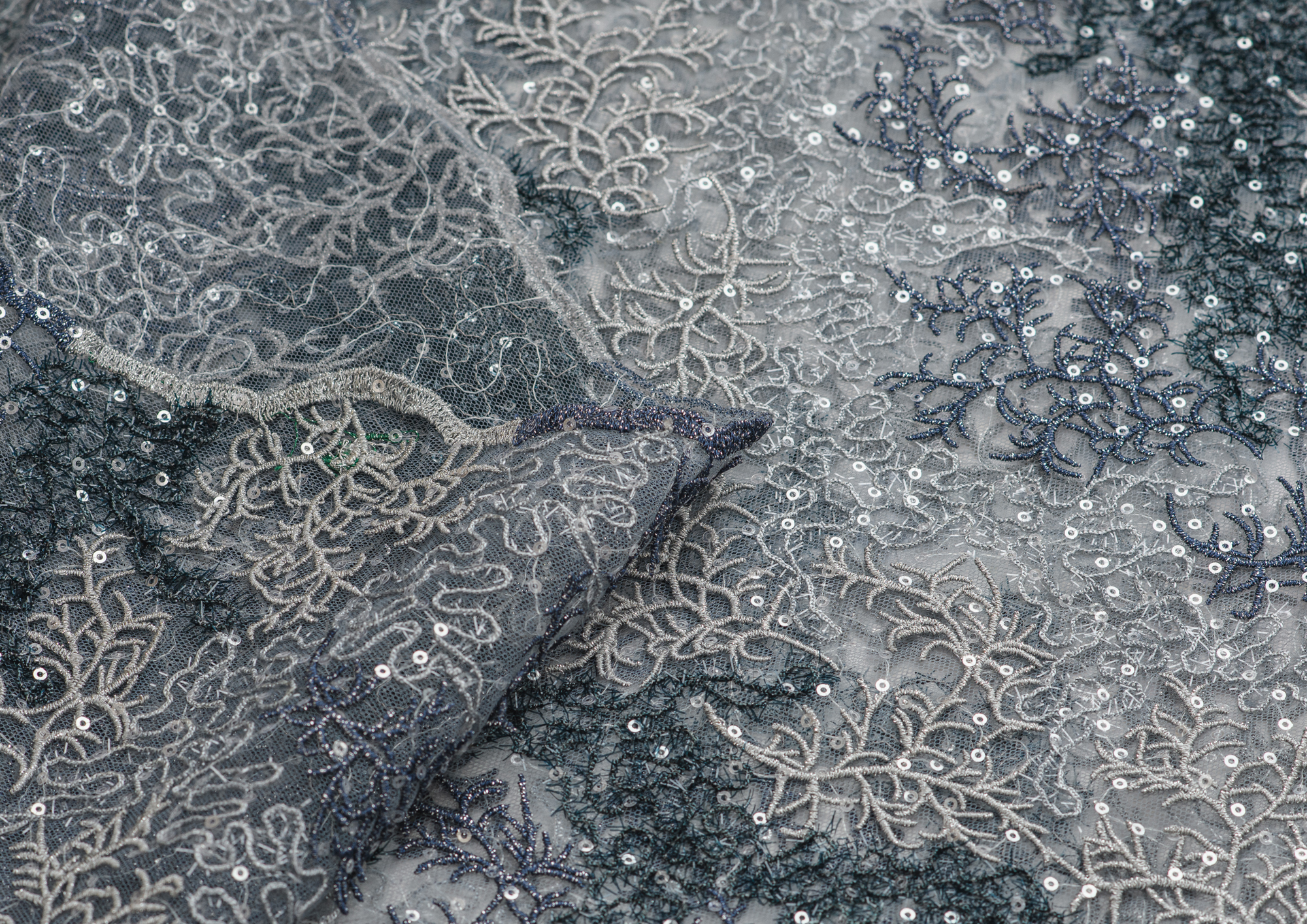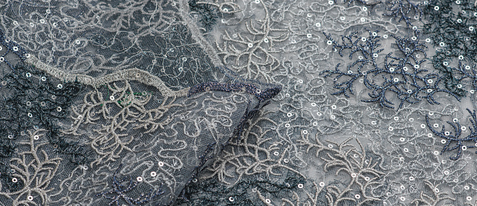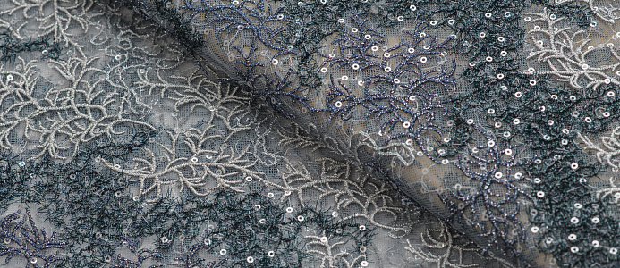 Ткань кружево с пайетками 2-х цветное цв. серо-синий