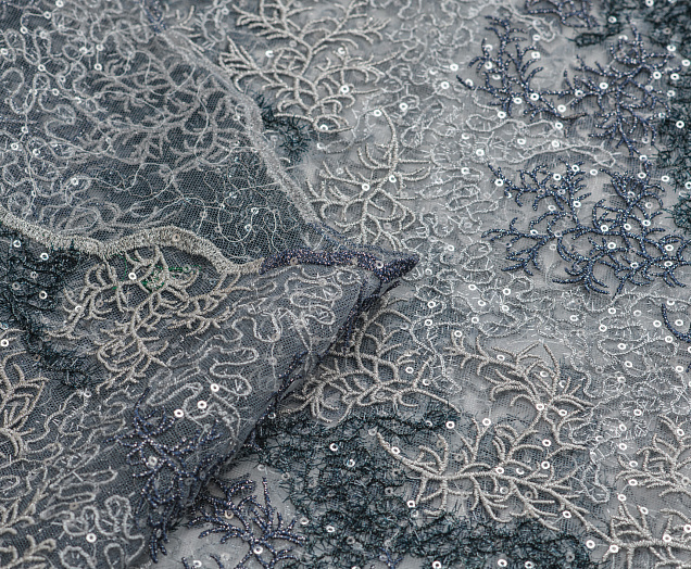 Кружево на сеточке . Всё полотно расшито пайетками . Кружево имеет 3D  эффект ,красивое сочетание серых оттенков . Под изделие необходим подклад .  Изделия из кружева всегда смотряться нарядно . Отлично подойдет для пошива театрального и вечерего платья, костюма .