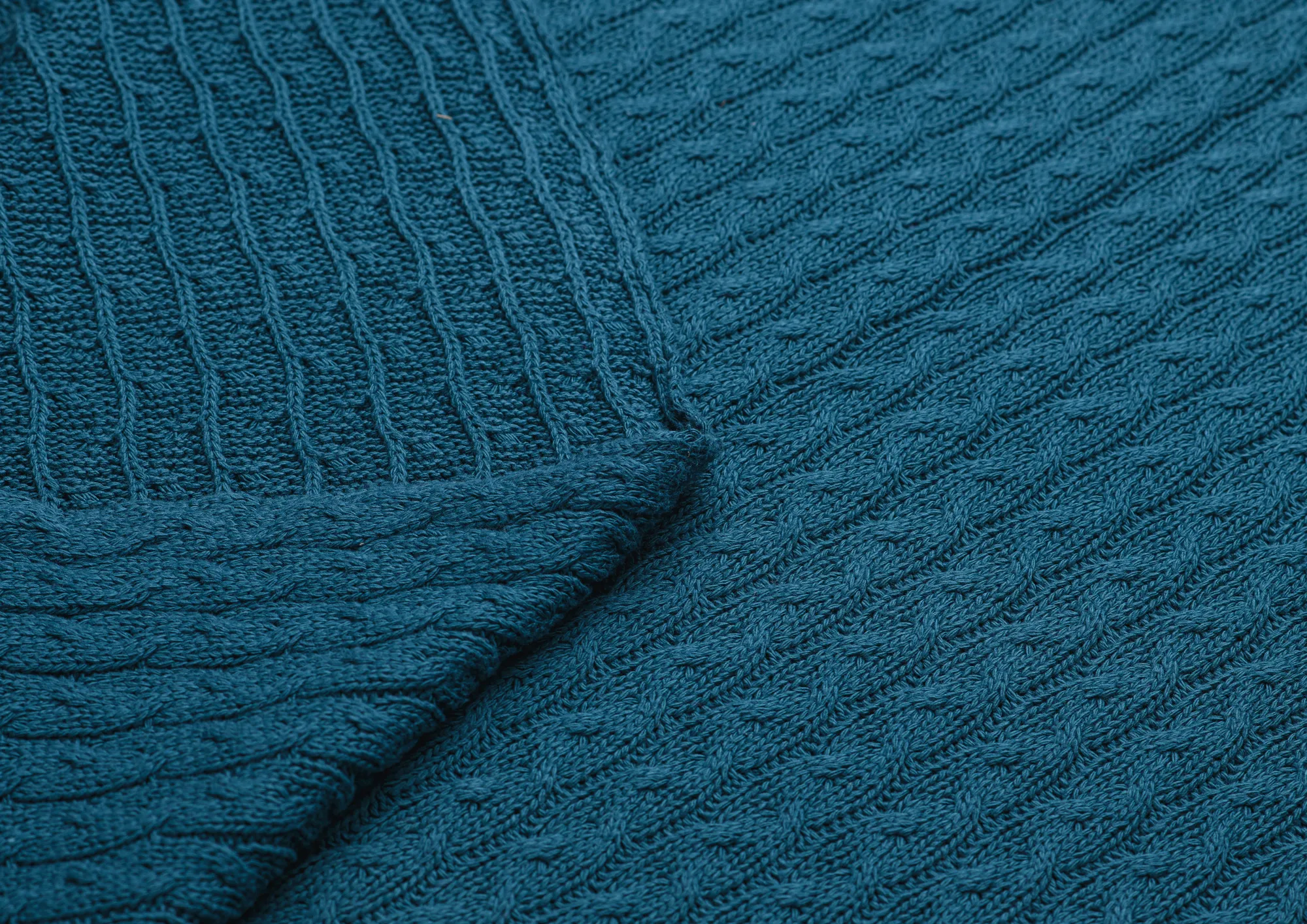 Натуральное вязаное полотно косичкой. Хорошо воздухопроницаемая. Рисунок идет вдоль полотна. Позволяет носить изделие в теплую и холодную погоду.  Ткань приятная к телу. Подойдет для пошива платья, кардигана, свитера, а так же в изготовлении пледов, декоративных подушек и т.д.