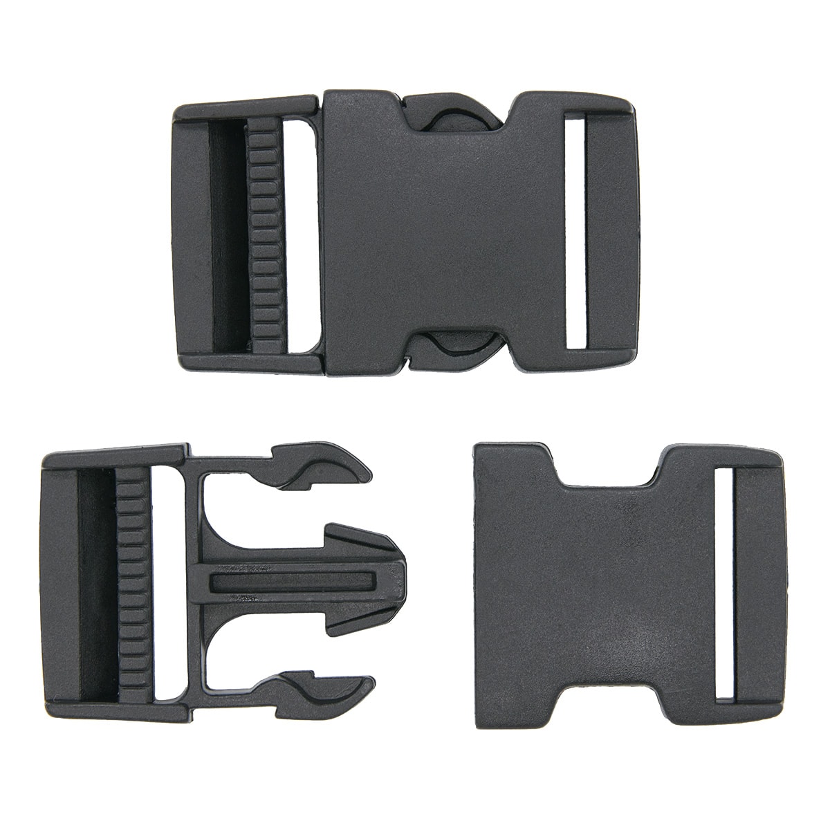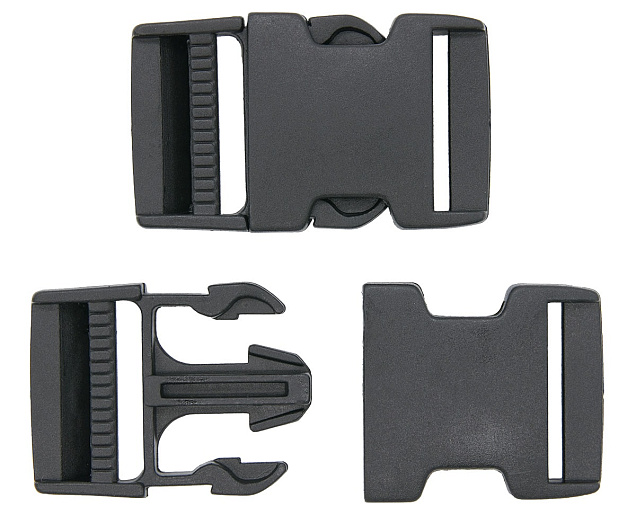 Пластиковый фастекс – застежка, которая быстро соединяет концы ремней. Соединение будет прочным благодаря внутренней стыковке деталей. Чтобы расстегнуть фастекс, просто нажмите на боковые кнопки.
