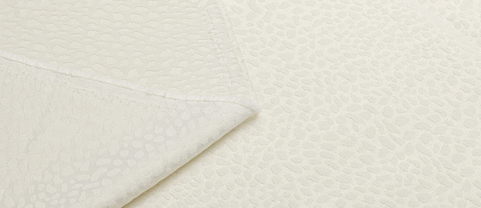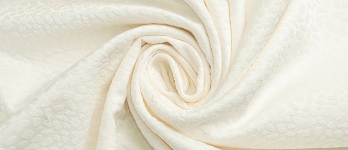 Креповая ткань с рельефным рисунком. Полотно средней плотности, хорошо держит форму, отлично драпируется. Используется в пошиве праздничных нарядов, театральных костюмов, выпускных платьев.  Ткань переливается на свету,  в изделии выглядит очень эффектно .