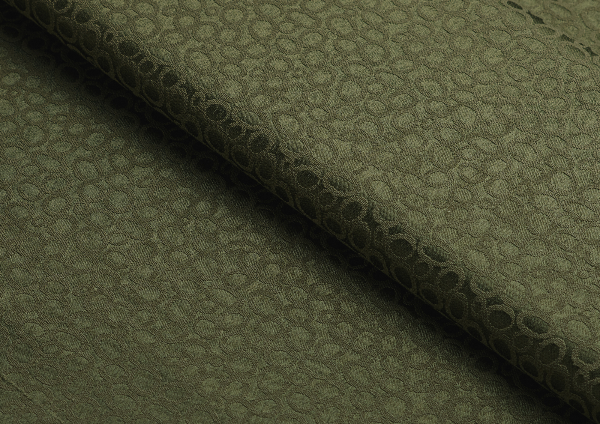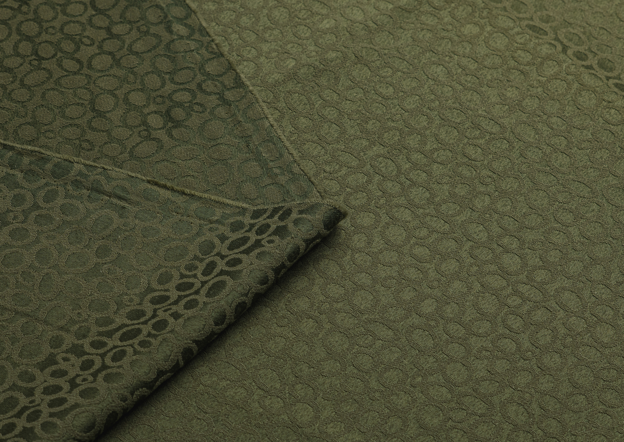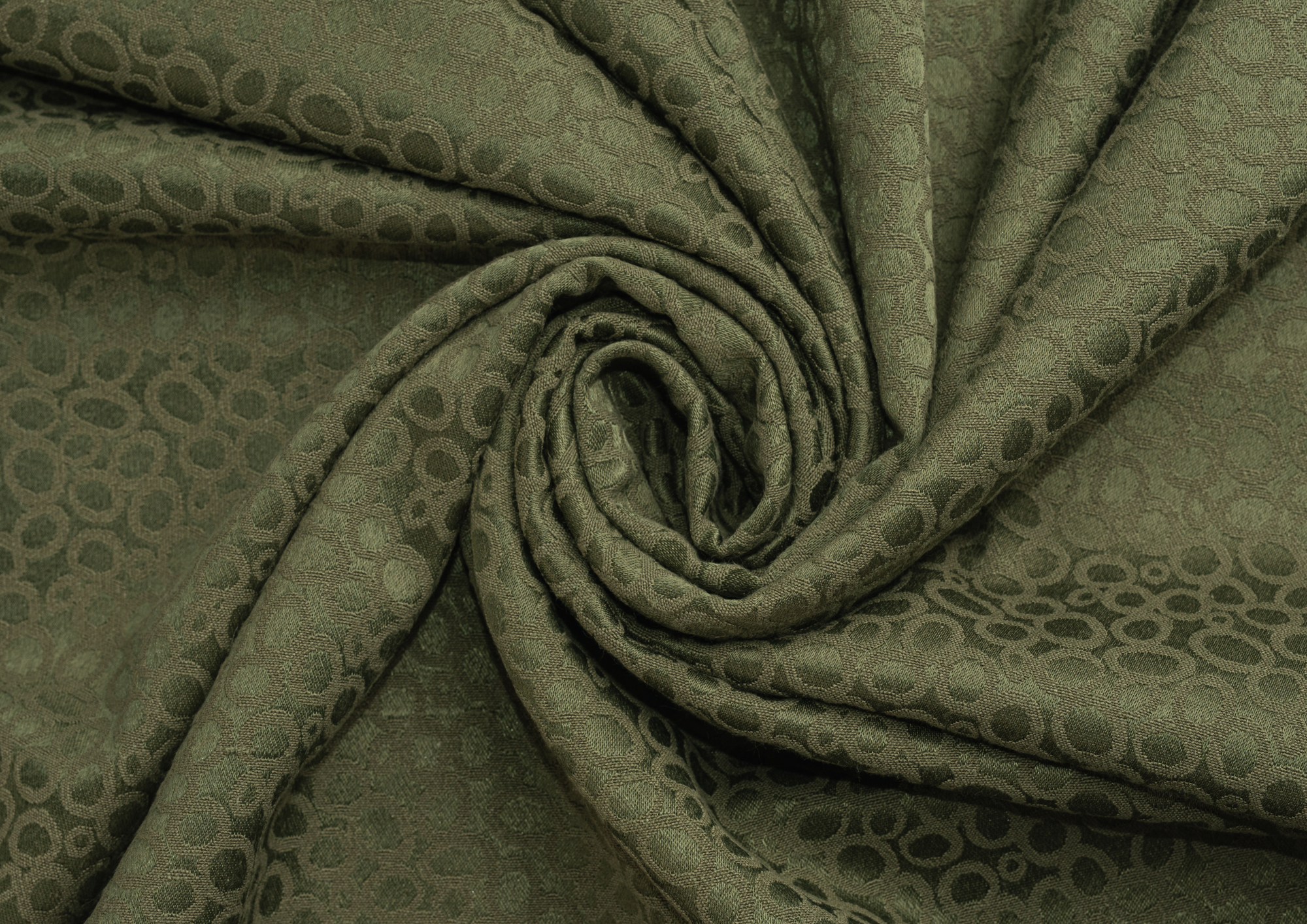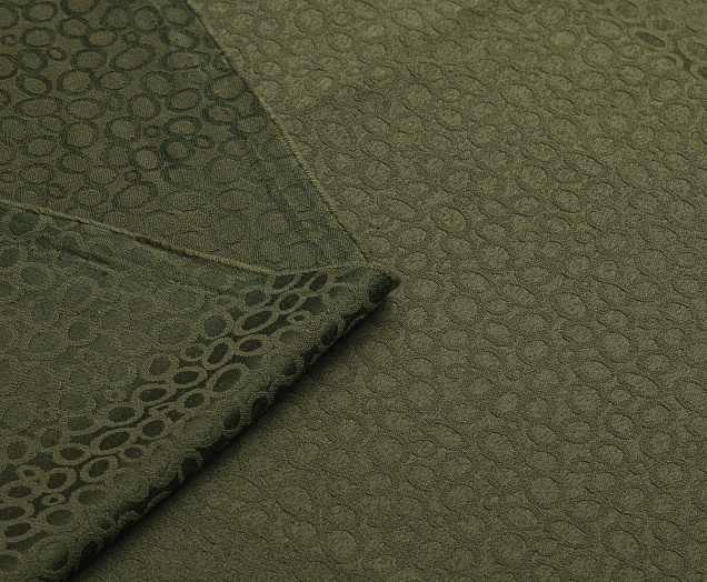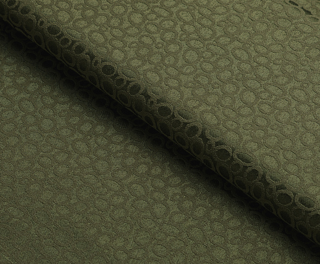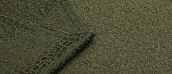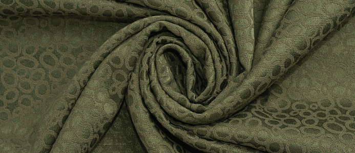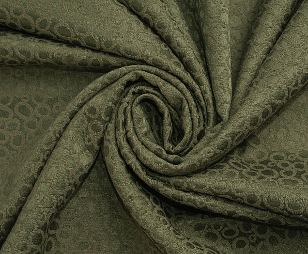 Креповая ткань с рельефным рисунком. Полотно средней плотности, хорошо держит форму, отлично драпируется. Используется в пошиве праздничных нарядов, театральных костюмов, выпускных платьев.  Ткань переливается на свету,  в изделии выглядит очень эффектно.
