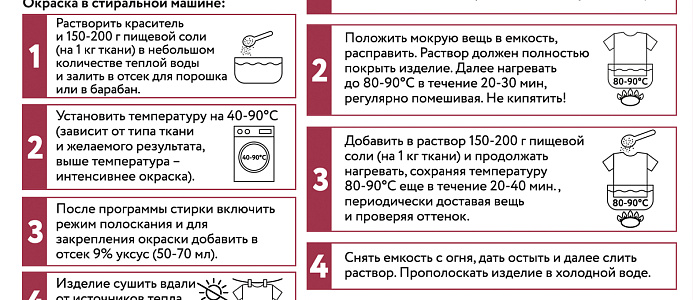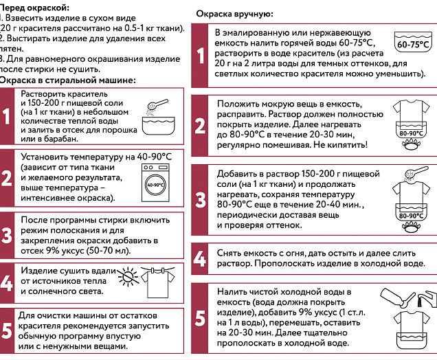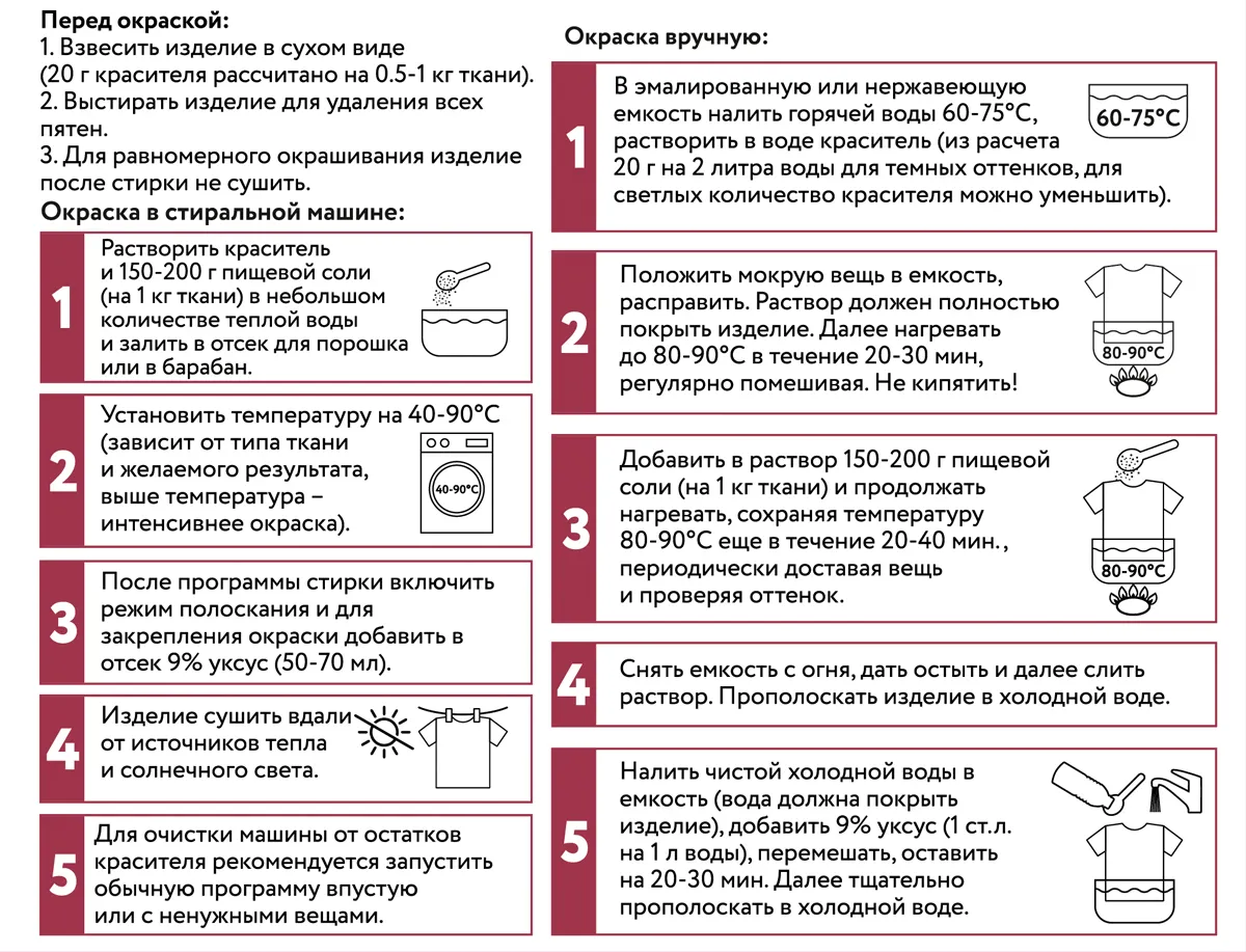 Внимание! Интенсивность и оттенок выбранного цвета зависит от типа ткани, ее состава, количества красителя, а также от температуры окрашивания. По возможности всегда проводите предварительное окрашивание на образце ткани или на ненужной вещи.