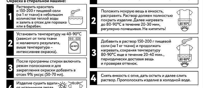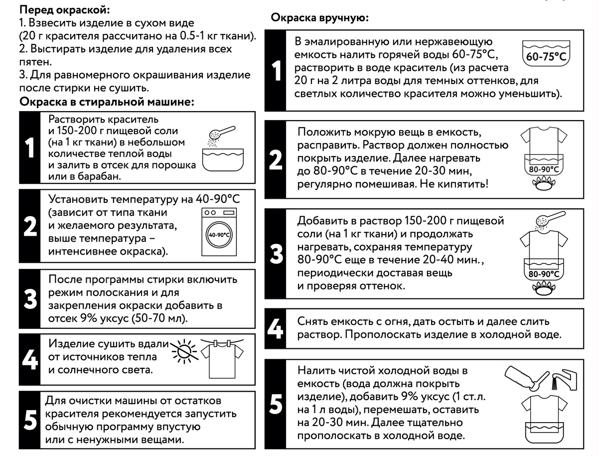 Внимание! Интенсивность и оттенок выбранного цвета зависит от типа ткани, ее состава, количества красителя, а также от температуры окрашивания. По возможности всегда проводите предварительное окрашивание на образце ткани или на ненужной вещи.