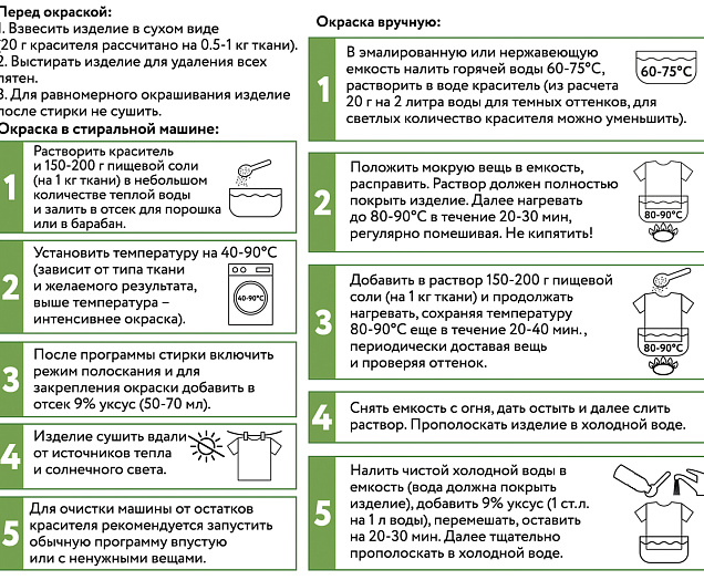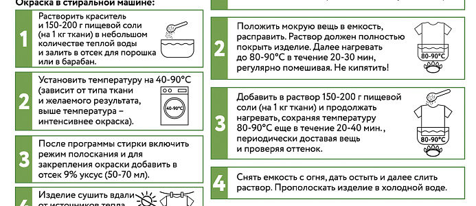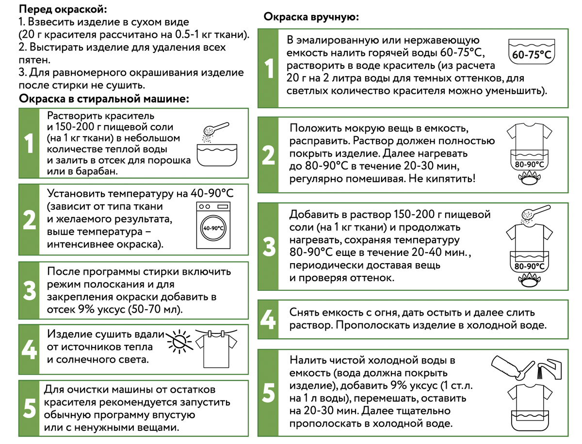 Внимание! Интенсивность и оттенок выбранного цвета зависит от типа ткани, ее состава, количества красителя, а также от температуры окрашивания. По возможности всегда проводите предварительное окрашивание на образце ткани или на ненужной вещи.