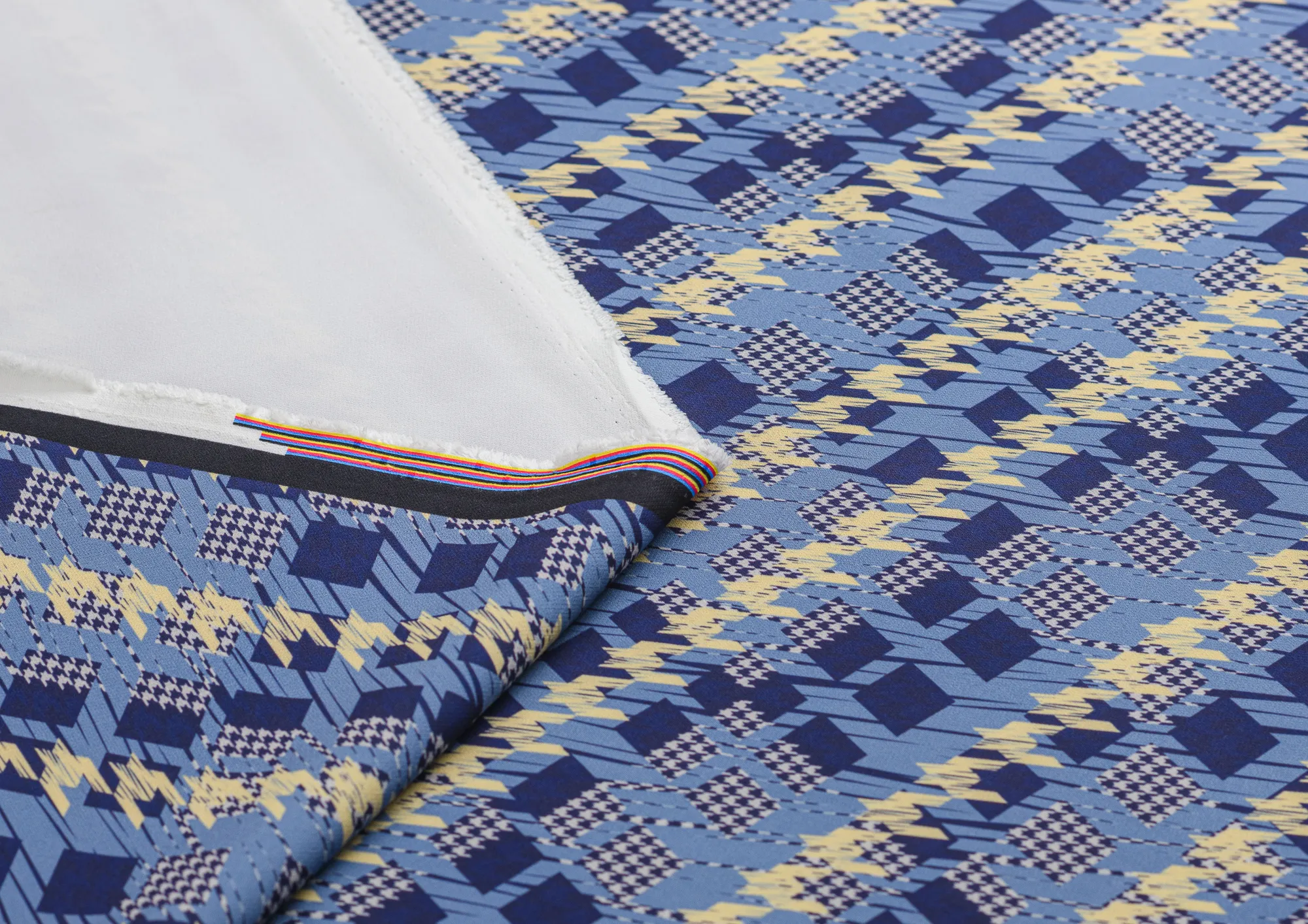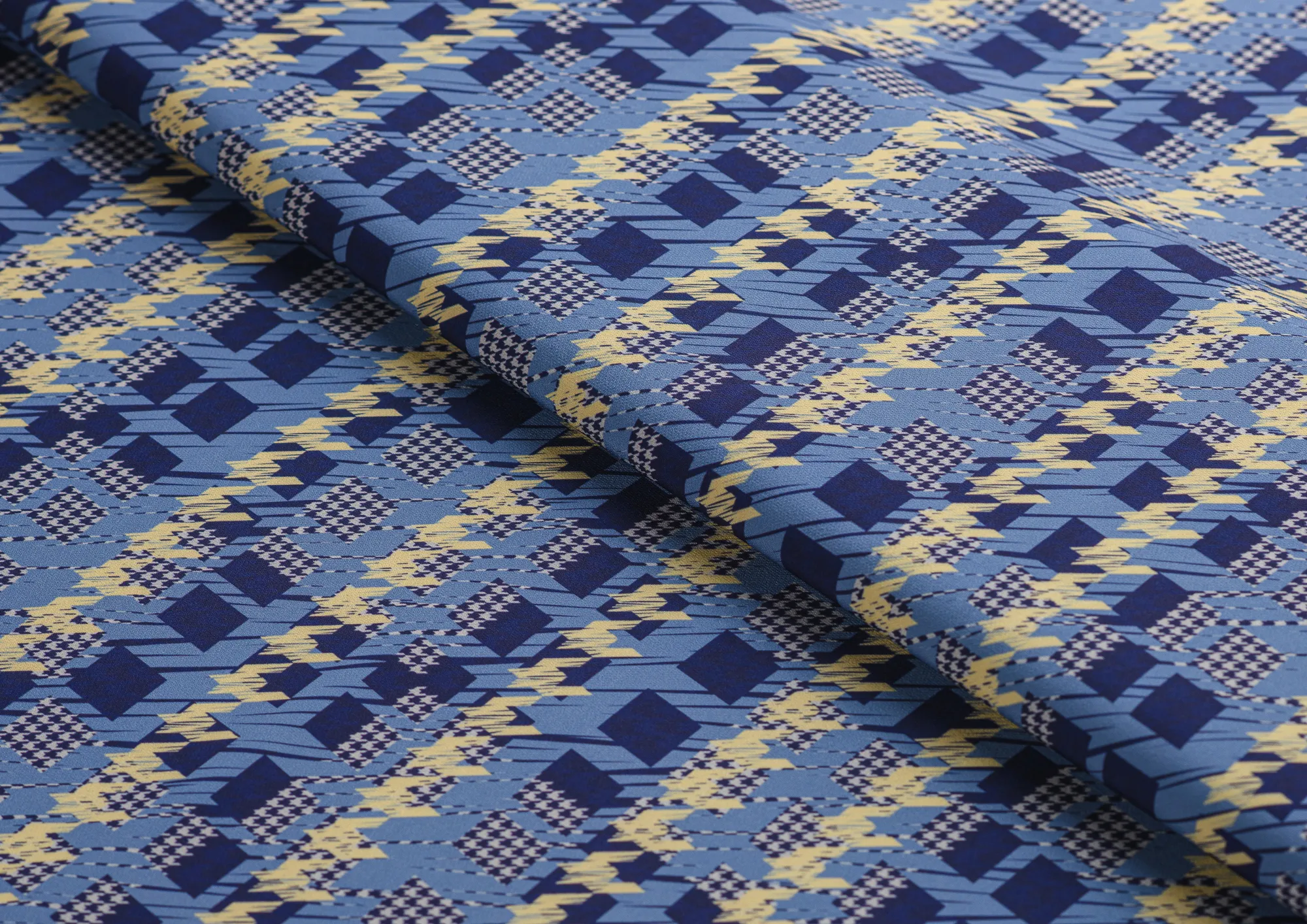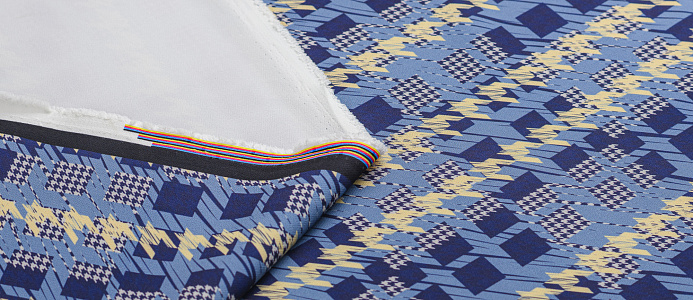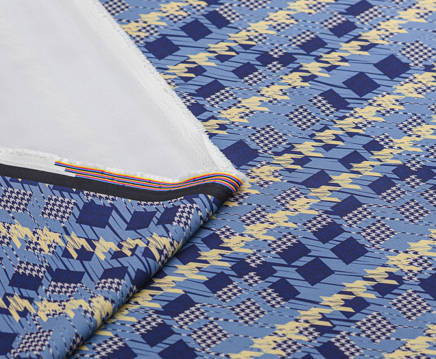 Ткань костюмная Барби Гусиная лапка принт Сине-желтая абстракция