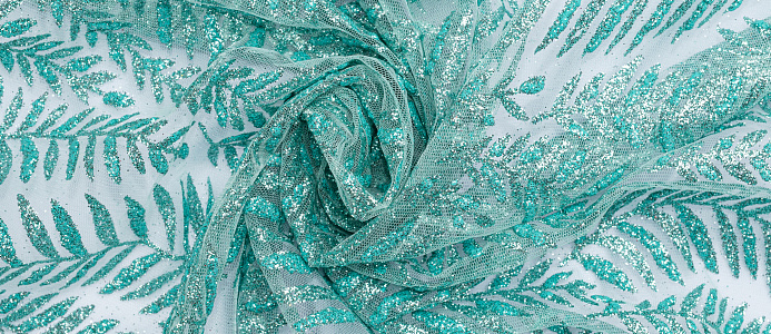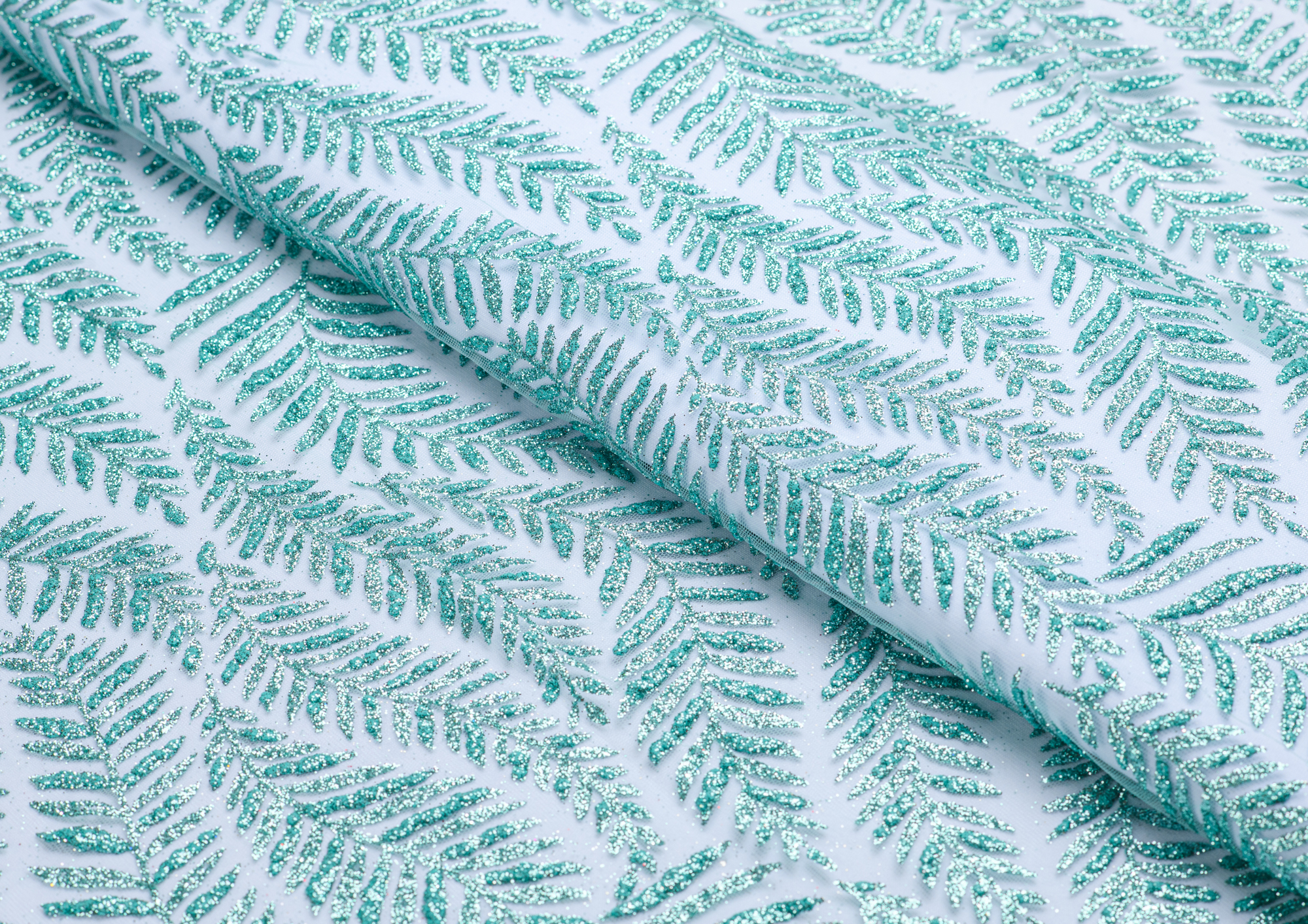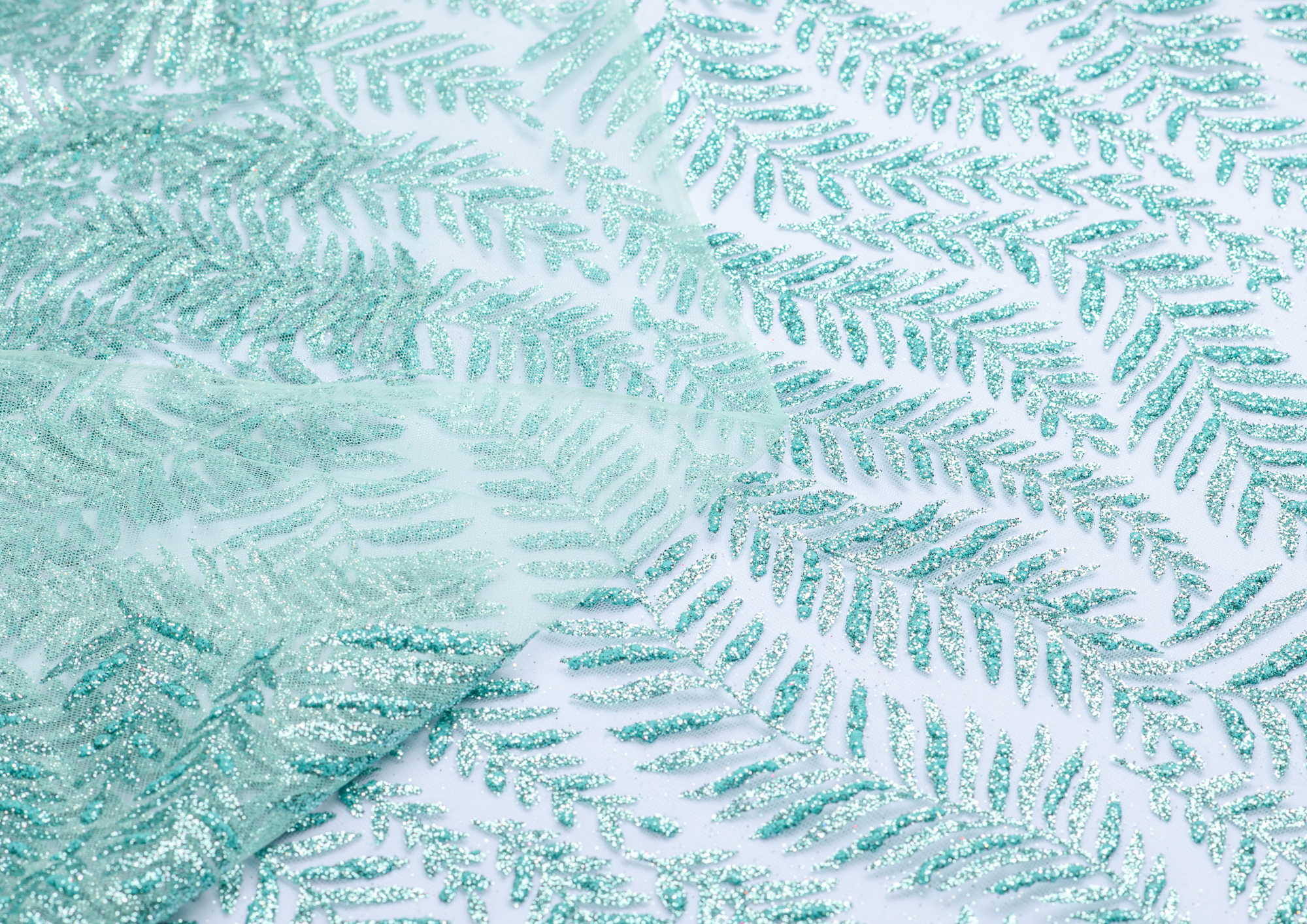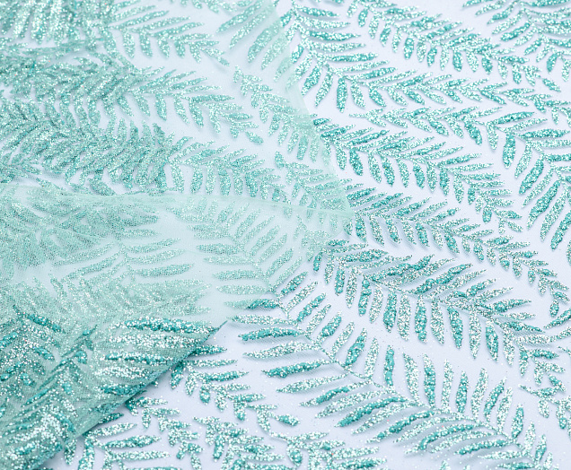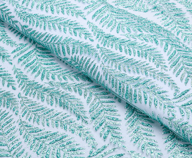 Ткань кружево с глиттером "Веточки" цв. бирюзовый