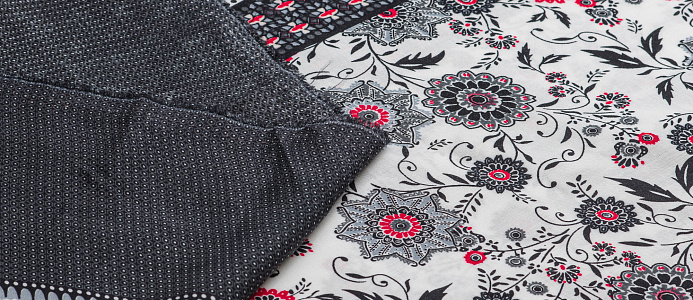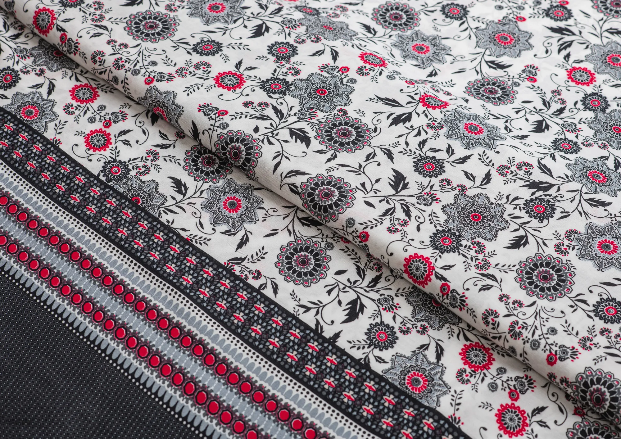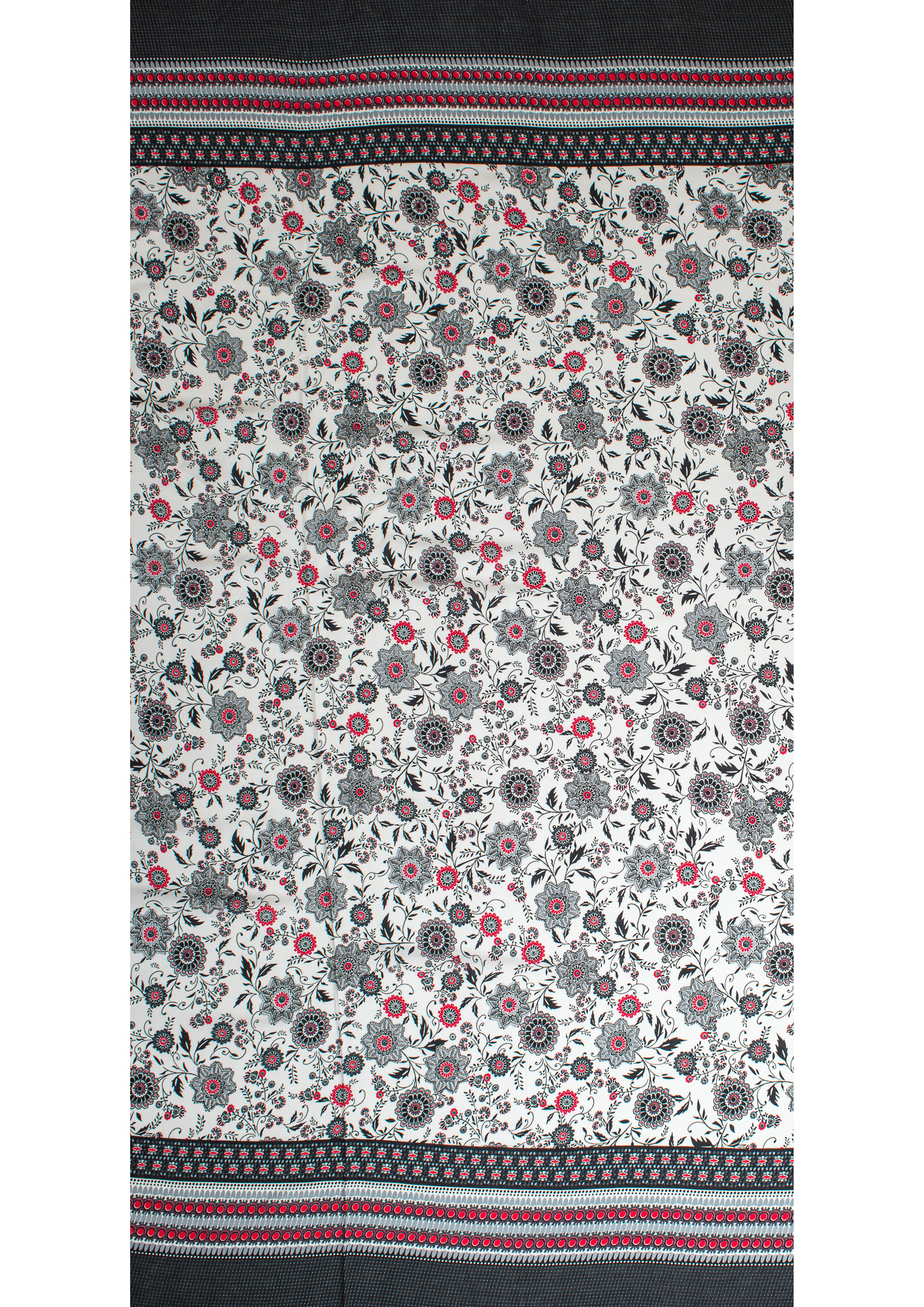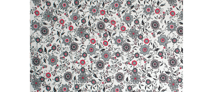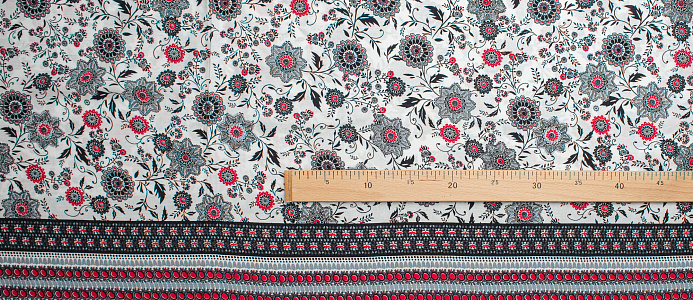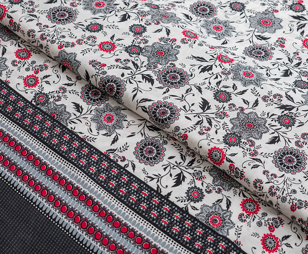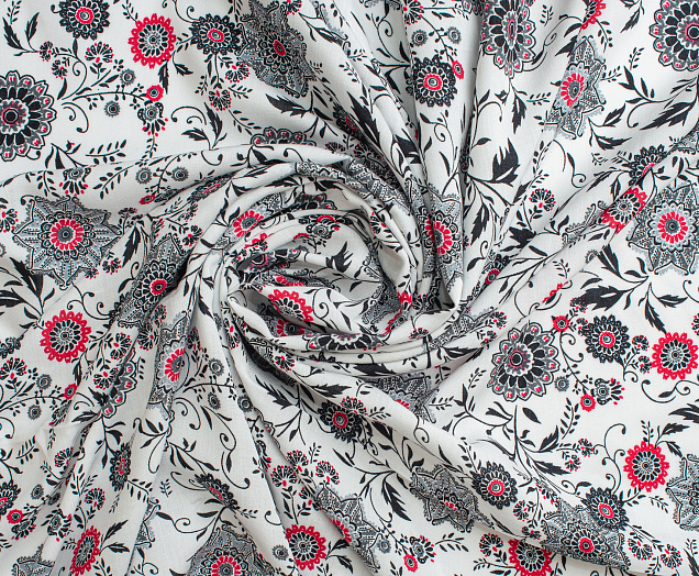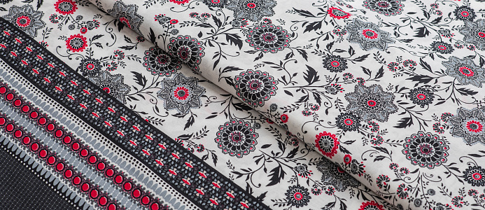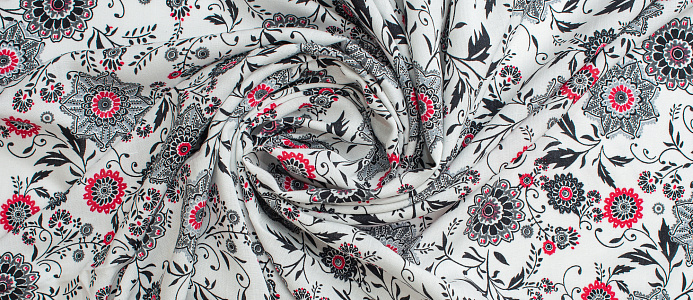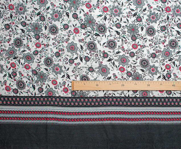Легкая , мягкая , приятная на ощупь ткань . Поверхность шелковистая . По всей поверхности расположен цветочный принт, вдоль обоих кромок идут полоски с орнаментом шириной 23 см .  Ткань воздухопроницаемая, хорошо подходит для жаркой погоды. Отлично драпируется , образовывая мягкие складки. Подходит для пошива платьев, сарафанов, халатов, юбок.