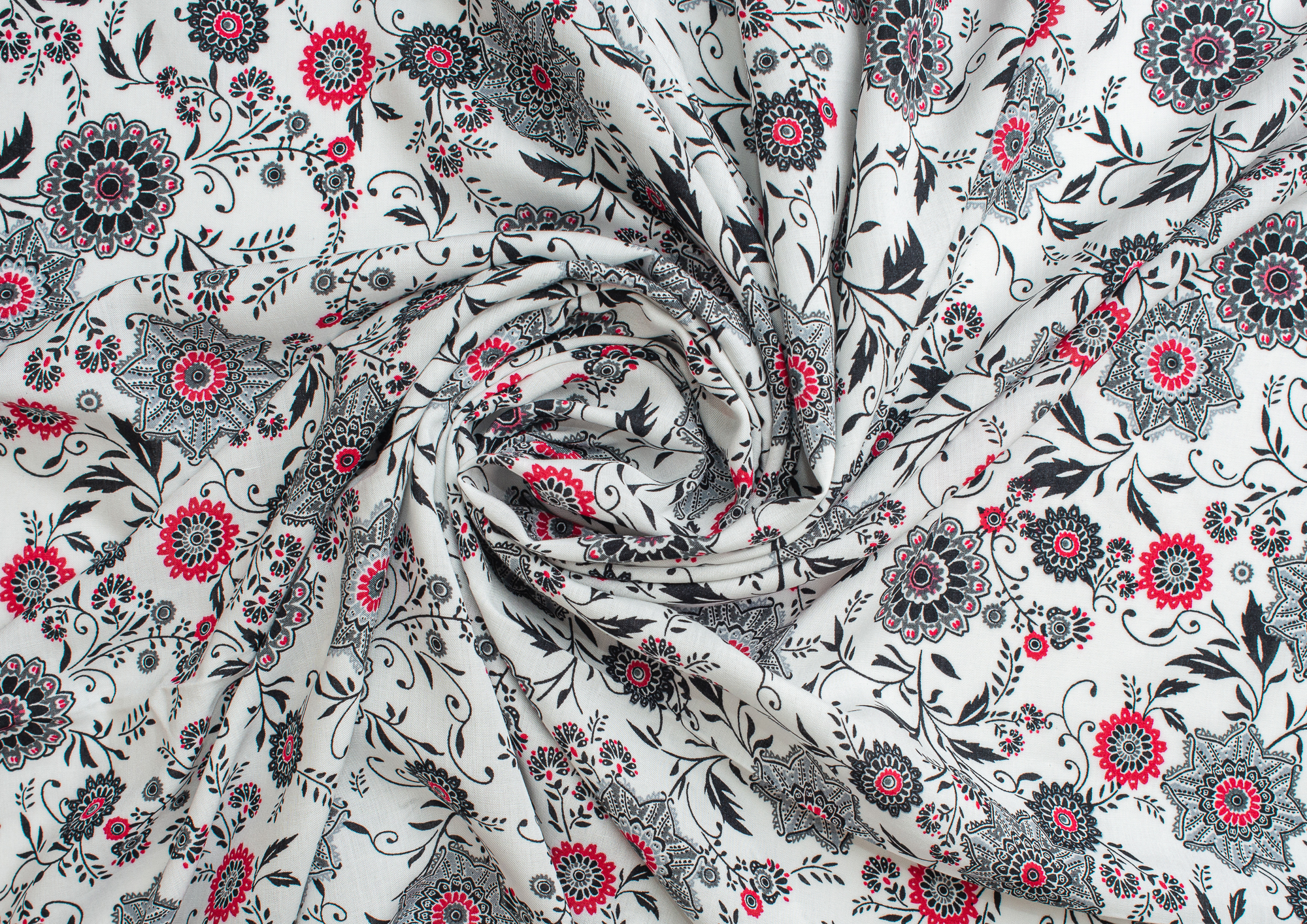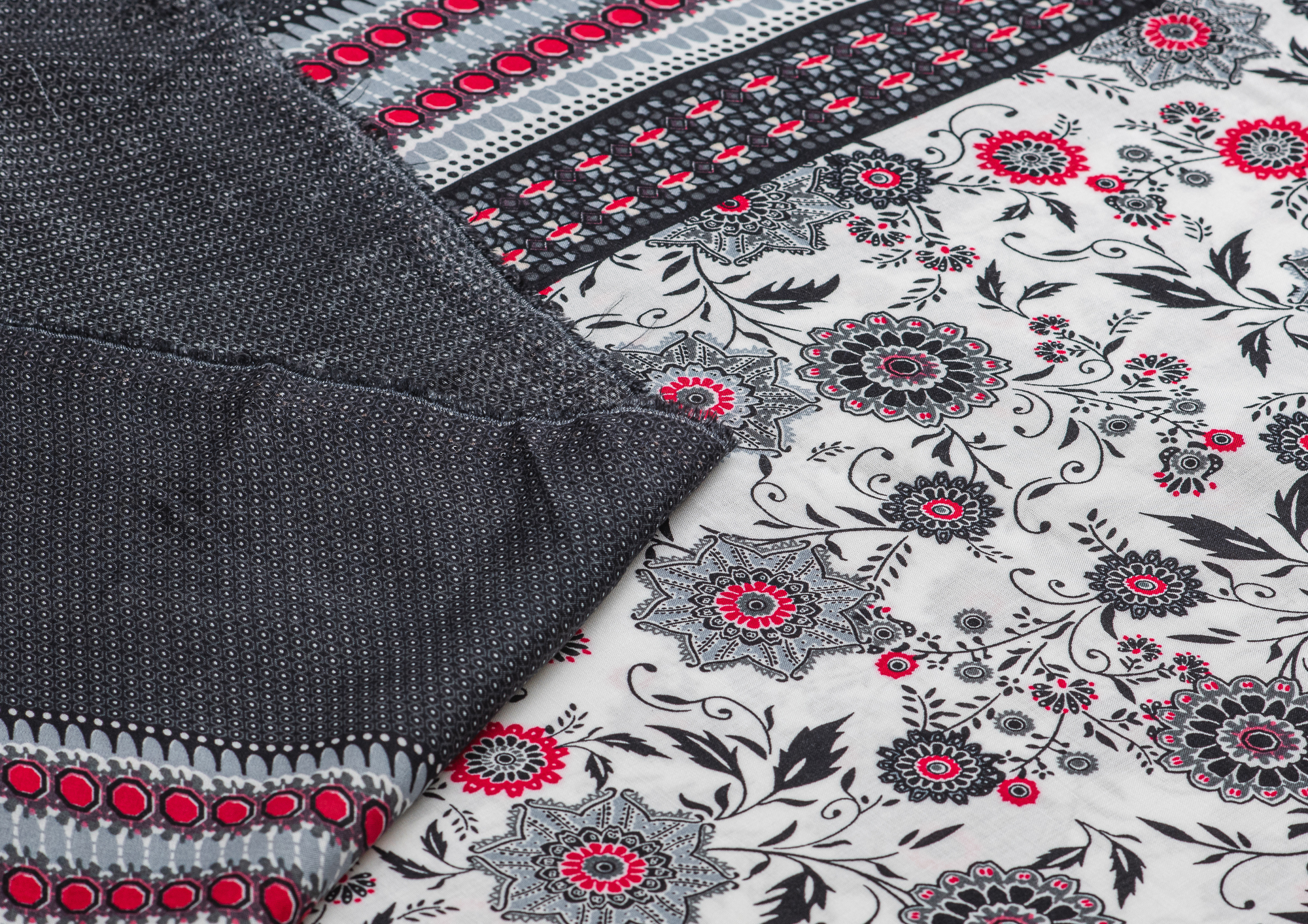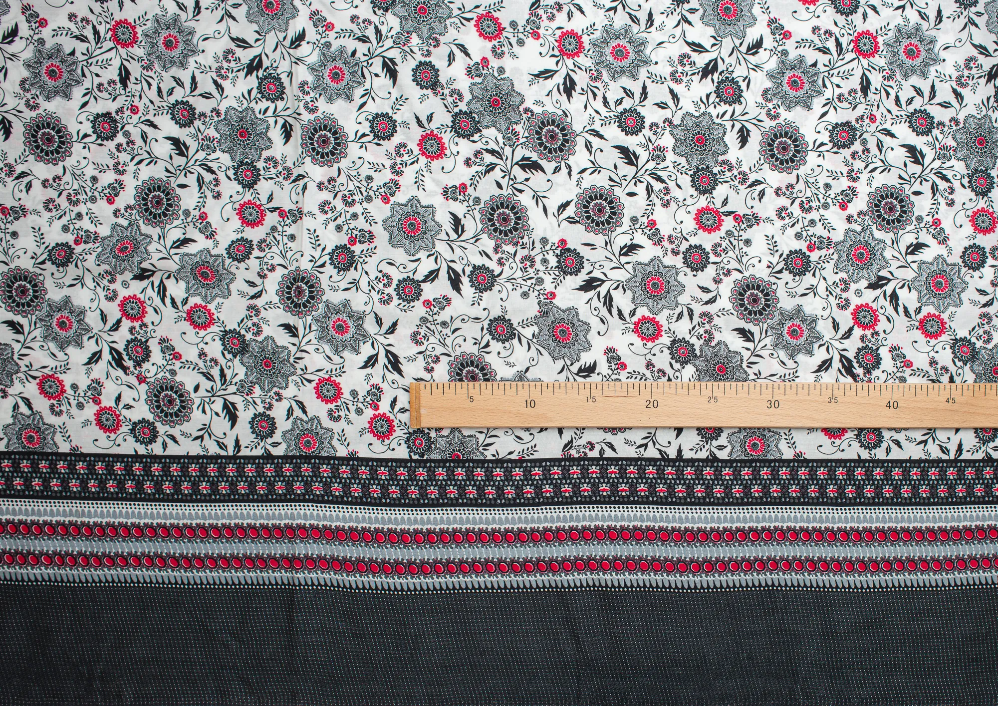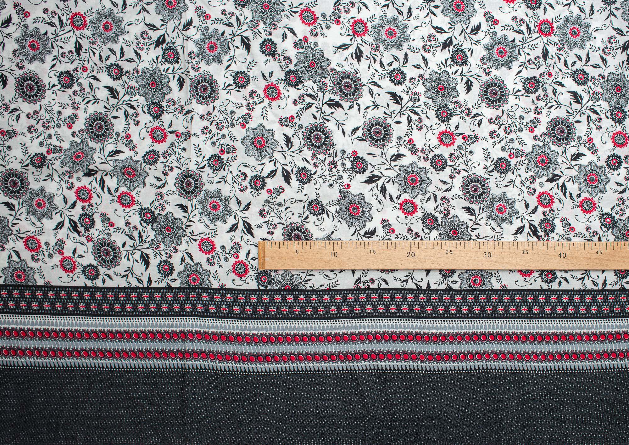 Легкая , мягкая , приятная на ощупь ткань . Поверхность шелковистая . По всей поверхности расположен цветочный принт, вдоль обоих кромок идут полоски с орнаментом шириной 23 см .  Ткань воздухопроницаемая, хорошо подходит для жаркой погоды. Отлично драпируется , образовывая мягкие складки. Подходит для пошива платьев, сарафанов, халатов, юбок.
