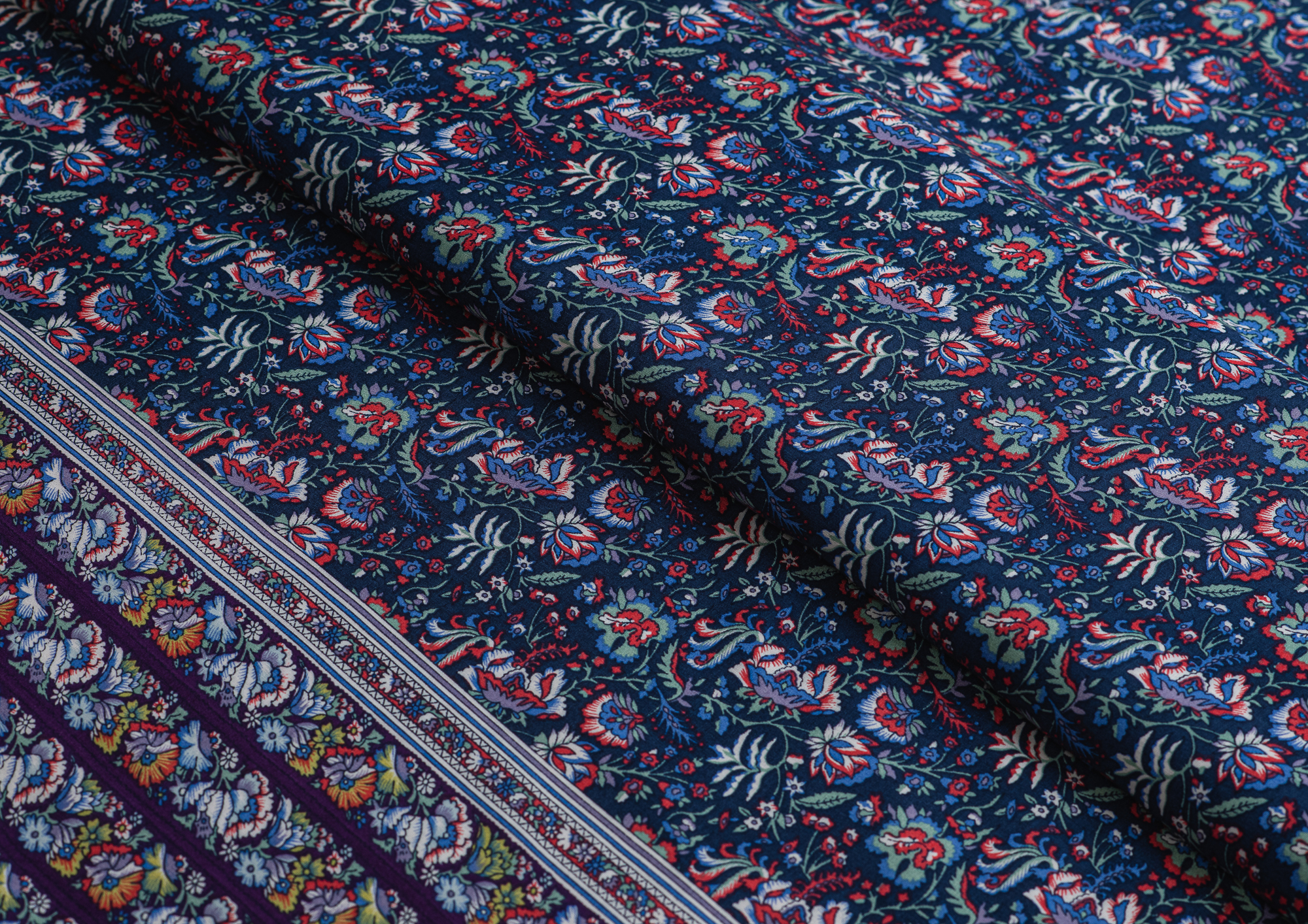 Легкая , мягкая , приятная на ощупь ткань . Поверхность шелковистая . По всей поверхности расположен цветочный принт, вдоль обоих кромок идут полосски шириной 23 см .  Ткань воздухопроницаемая, хорошо подходит для жаркой погоды. Отлично драпируется , образовывая мягкие складки. Подходит для пошива платьев, сарафанов, халатов, юбок.