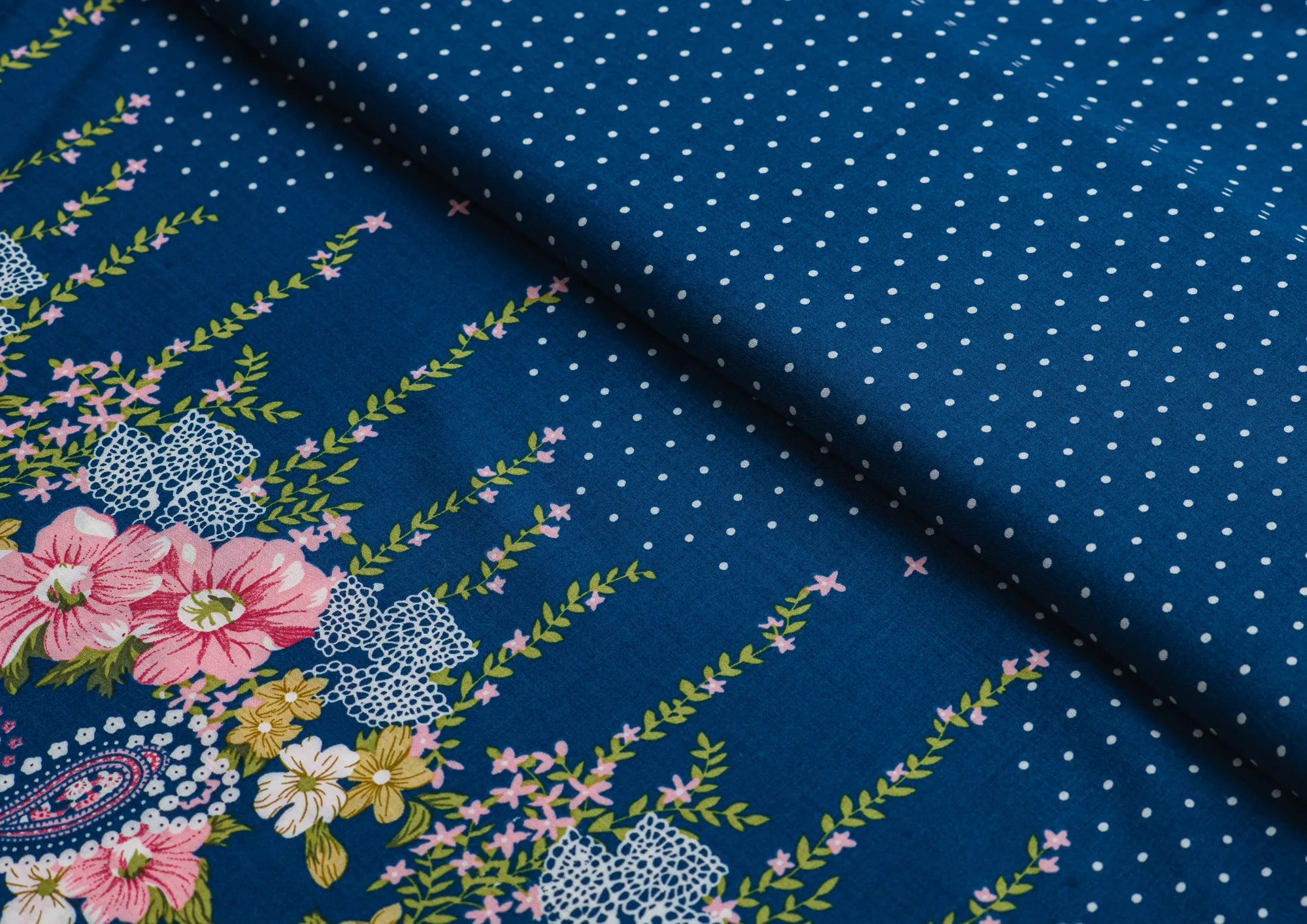 Легкая , мягкая , приятная на ощупь ткань . Поверхность шелковистая . По всей поверхности расположен принт горошек 3 мм , вдоль обоих кромок расположен цветочный принт шириной 40 см .  Ткань воздухопроницаемая, хорошо подходит для жаркой погоды. Отлично драпируется , образовывая мягкие складки. Подходит для пошива платьев, сарафанов, халатов, юбок.