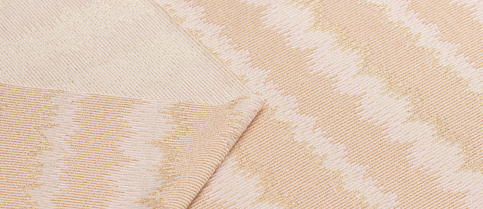Тонкое трикотажное полотно средней плотности с люрексом. Лицевая сторона рельефная с переливами и жаккардовым рисунком, изнаночная сторона ровная. Материал эластичный по всем направлениям. Рисунок зиг-заг расположен вдоль полотна. В изделии смотриться дорого и элегантно.