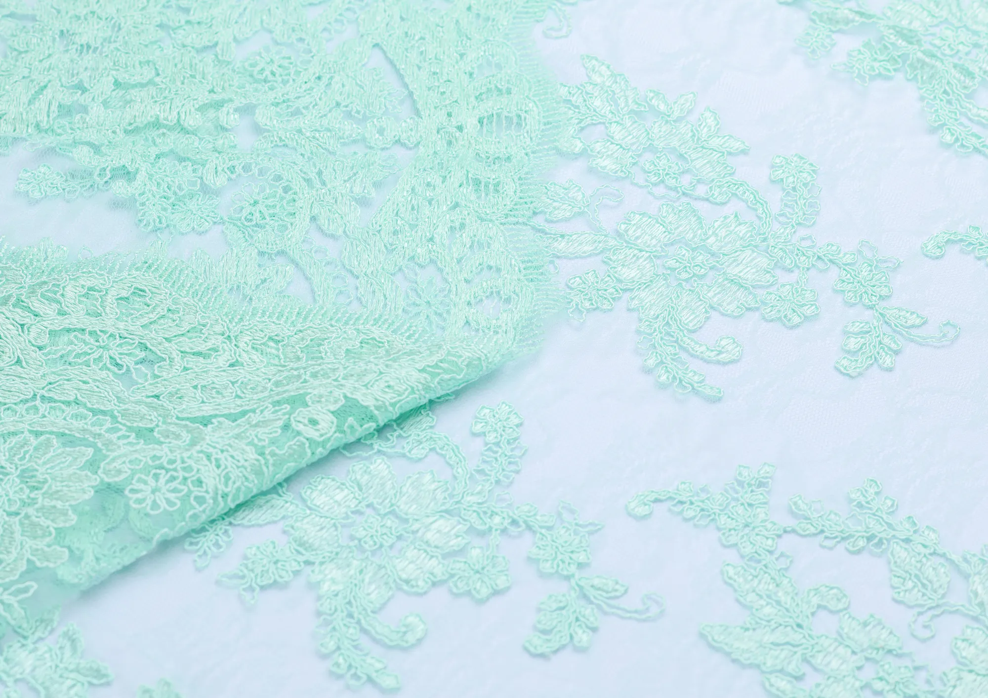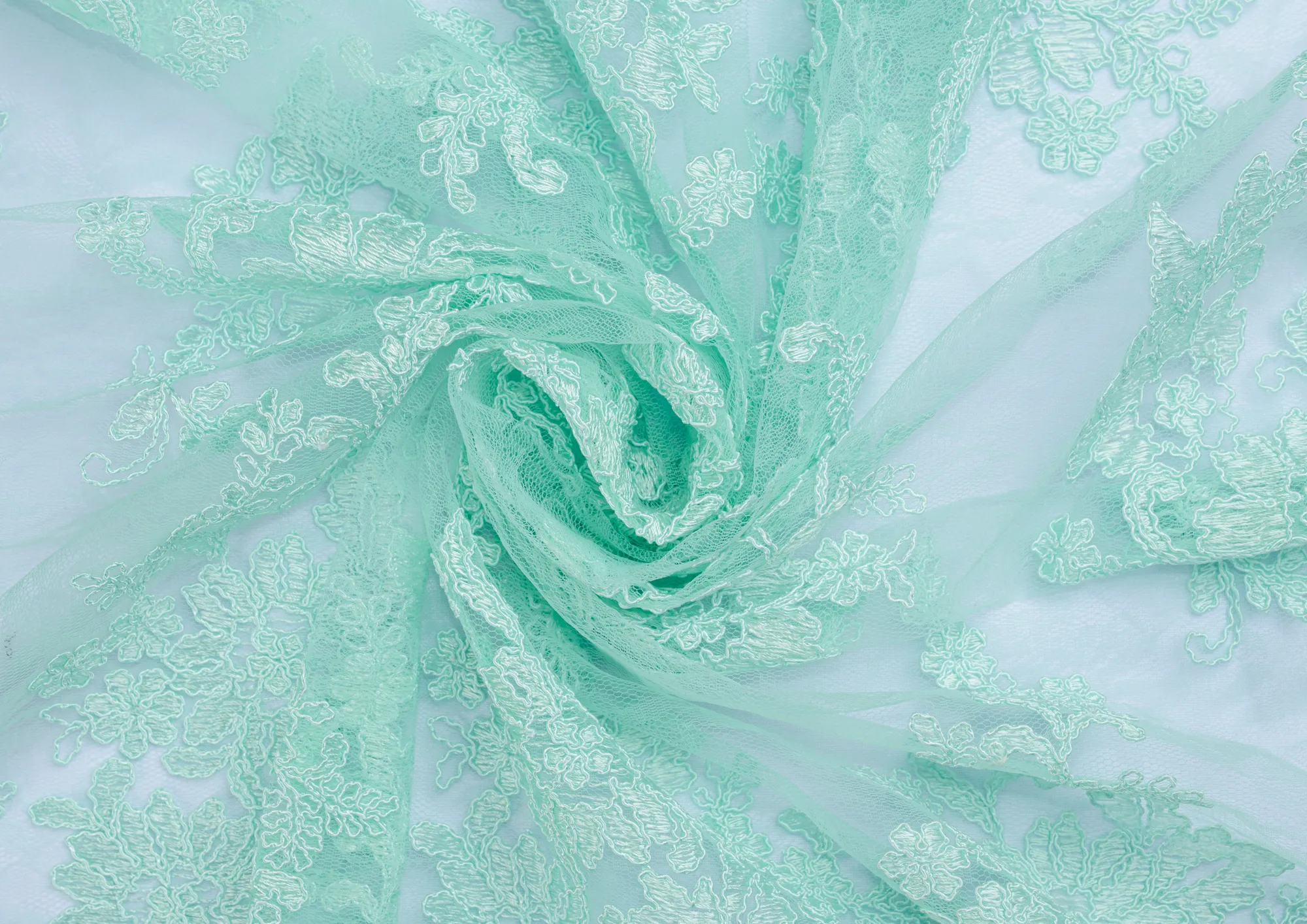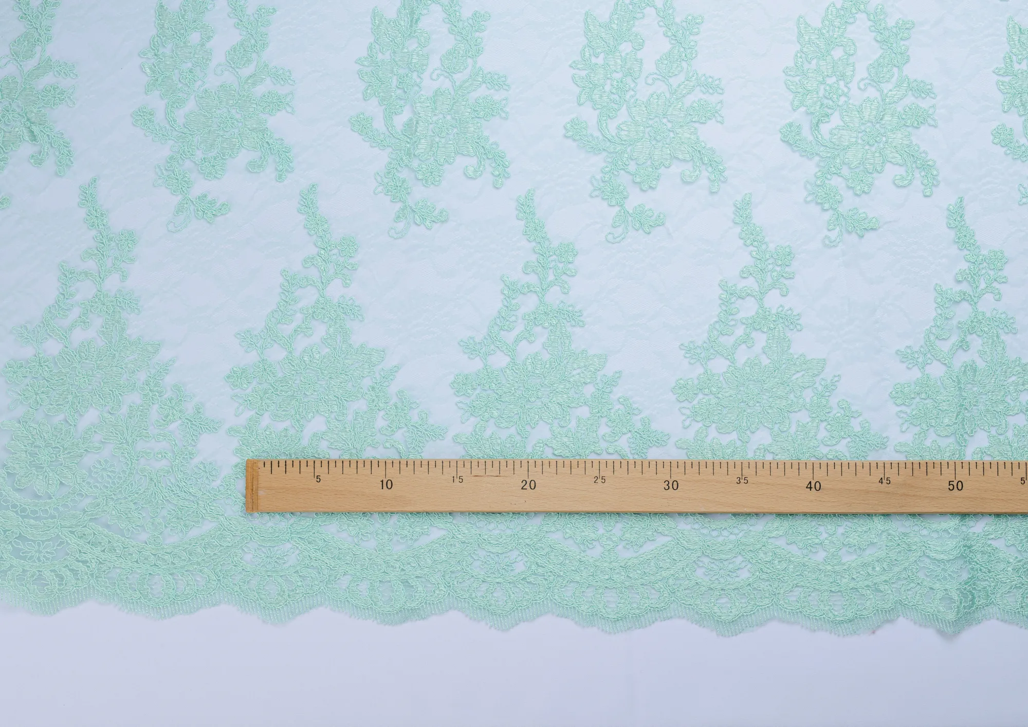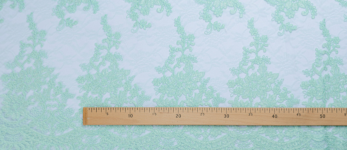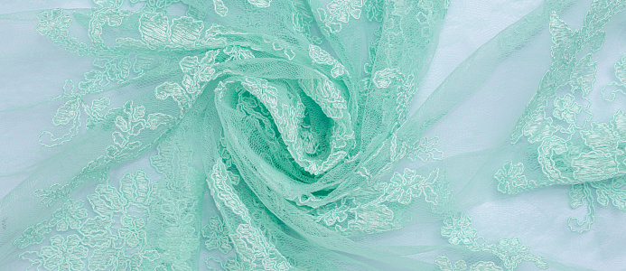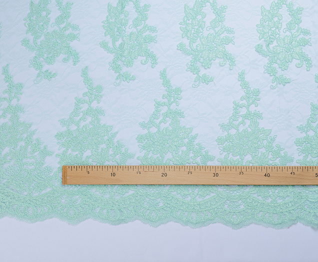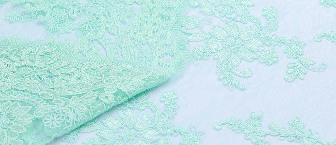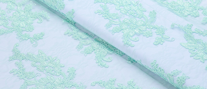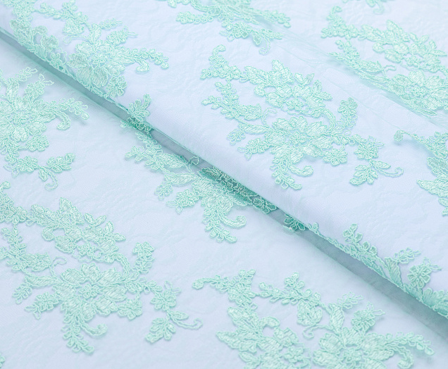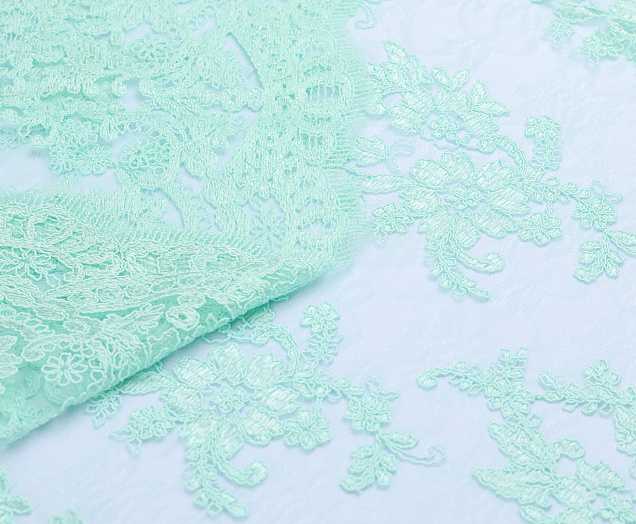 Кружево в тон полотна, фестоны с двух сторон, выполнена на тонкой сеточке. По всем полотну равномерно расположен цветочный орнамент 3d. При пошиве требует подклада. Из кружево шьют нарядные, вечерние, торжественные платья, костюмы.