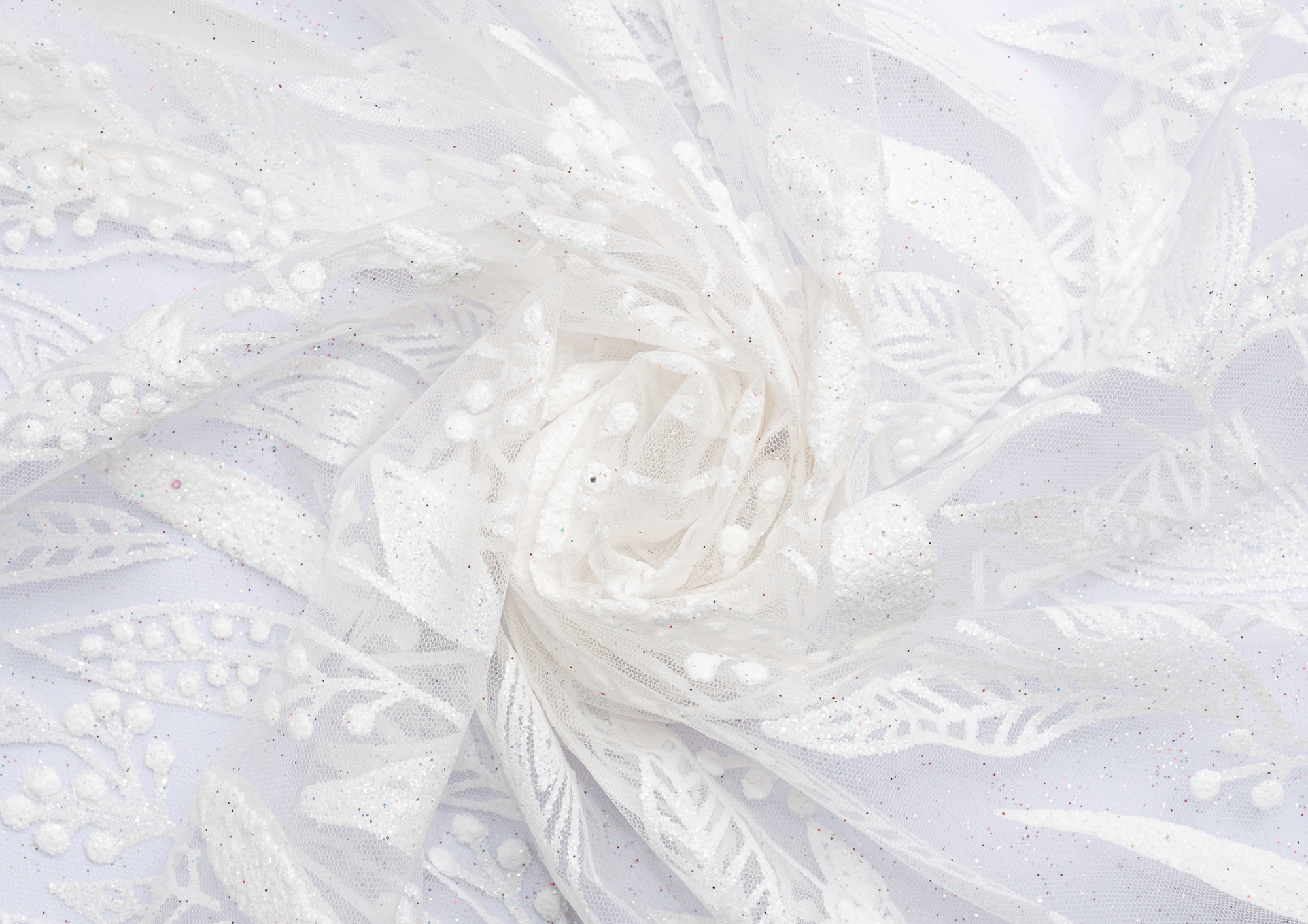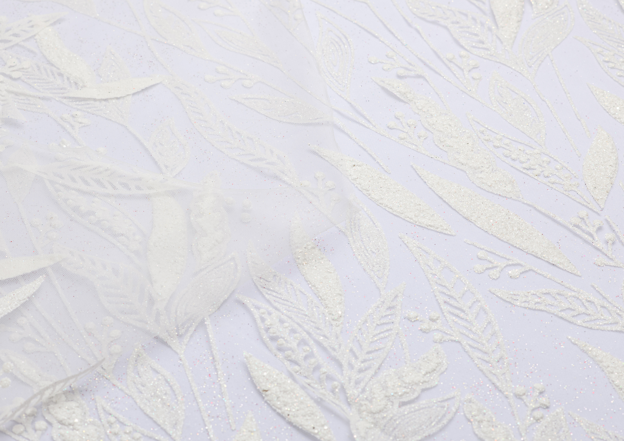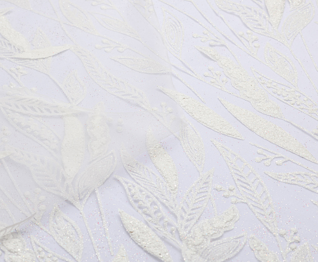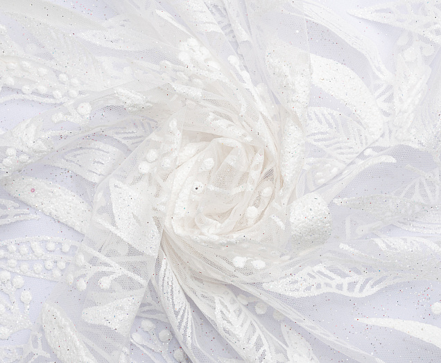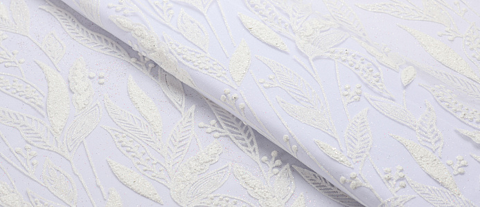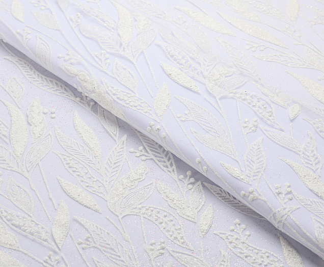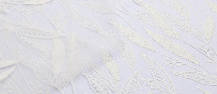 Кружево выполнена на эластичной, тонкой сеточке. По всему полотну равномерно расположен рисунок "Листочки" с серебряным блеском 3d. При пошиве требует подклада. Из кружево шьют нарядные, вечерние, торжественные платья, костюмы.