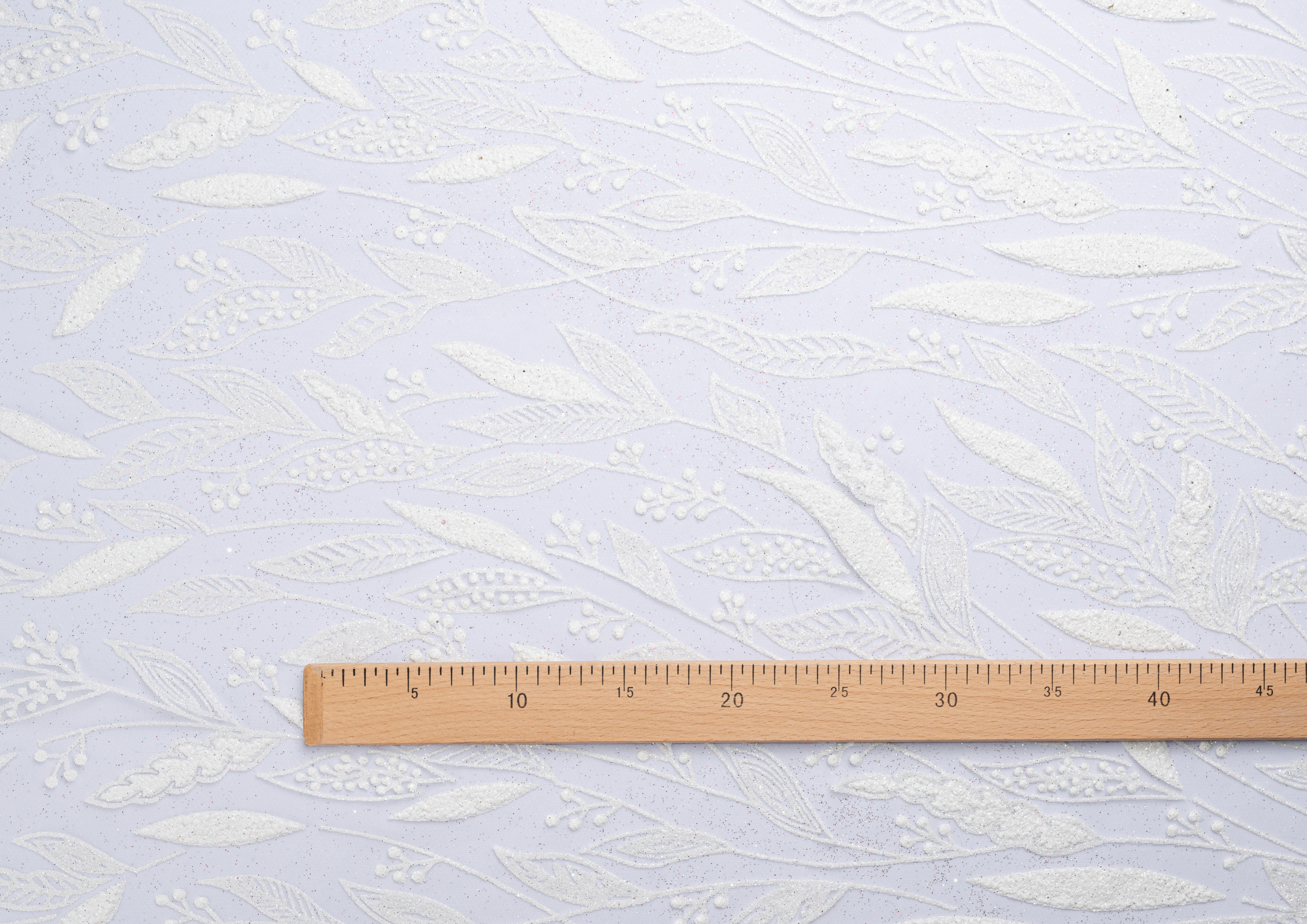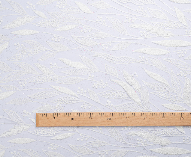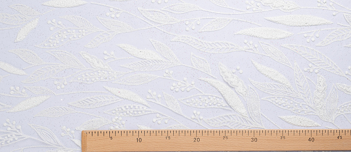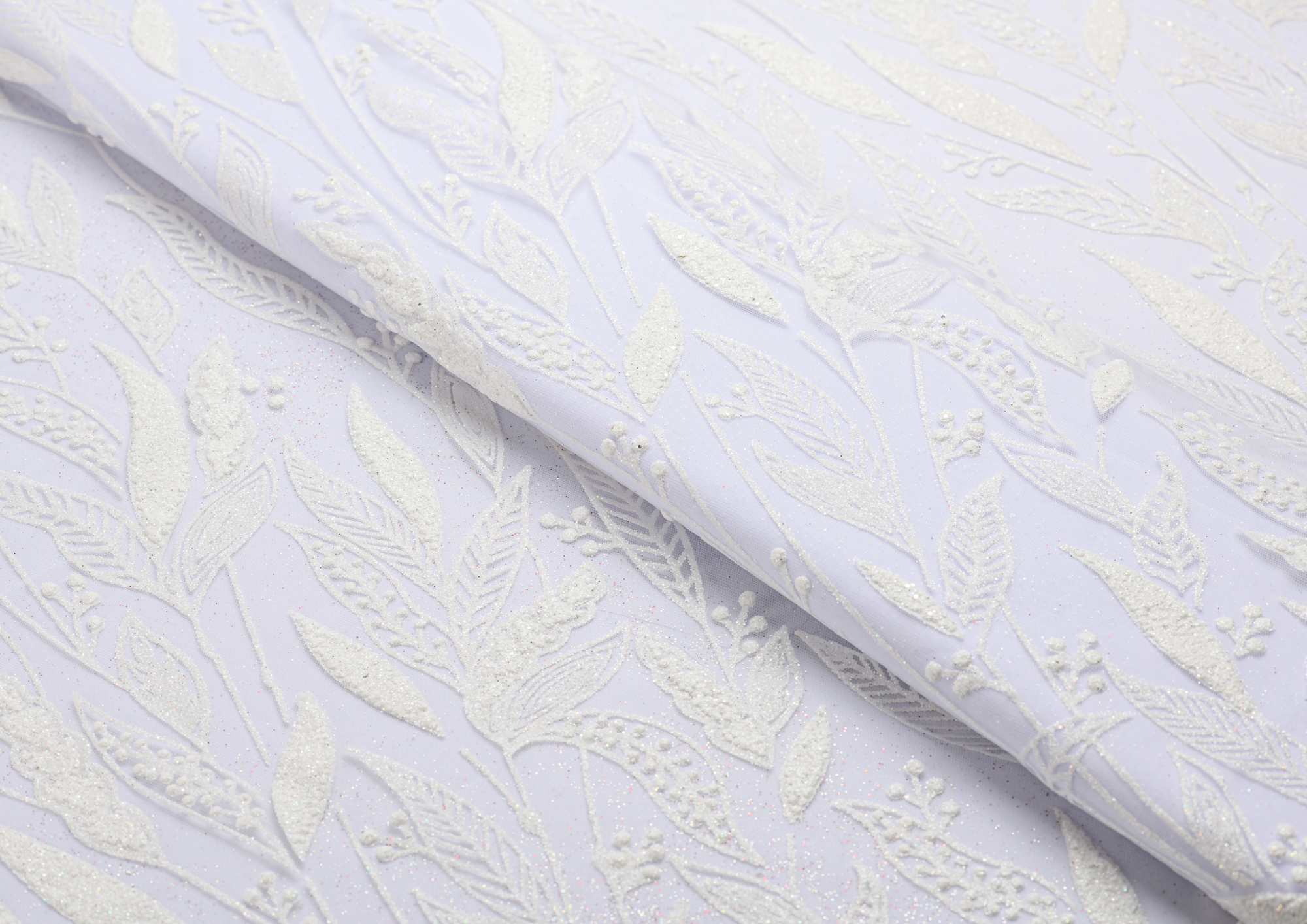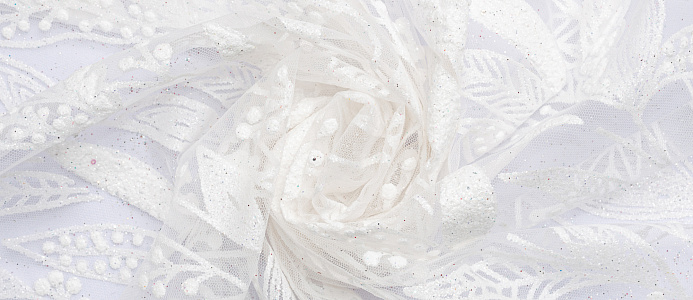 Кружево выполнена на эластичной, тонкой сеточке. По всему полотну равномерно расположен рисунок "Листочки" с серебряным блеском 3d. При пошиве требует подклада. Из кружево шьют нарядные, вечерние, торжественные платья, костюмы.