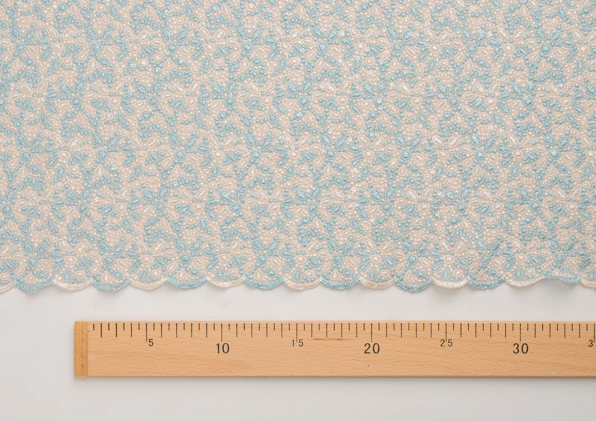 Кружевное полотно , основу которого составляет мелкая стрейчевая сеточка , расшитая мелким узором и пайетками . По краям полотна фигурный фестон.  Используется для изготовления как праздничной, так и повседневной одежды: всевозможных платьев, юбок, жакетов и элементов декора. Такой наряд не останется без внимания!