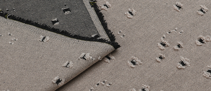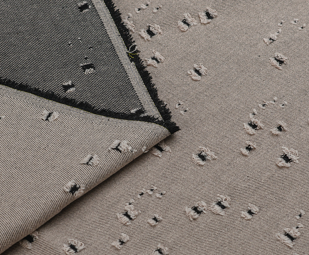 Ткань джинсовая прочная и износостойкая. Характеризуется воздухопроницаемостью, крепостью и устойчивостью к повреждениям. Ткань двухсторонняя, можно любую сторону. По всему полотну декоративные дырки, размер примерно от 5 до 10 мм. Ткань идеальна для пошива не только стильной одежды: платьев, юбок, джинсовых курток, брюк, но и подходит для шитья сумок и рюкзаков.