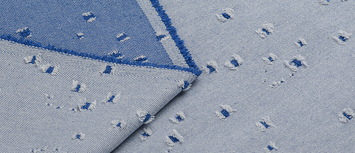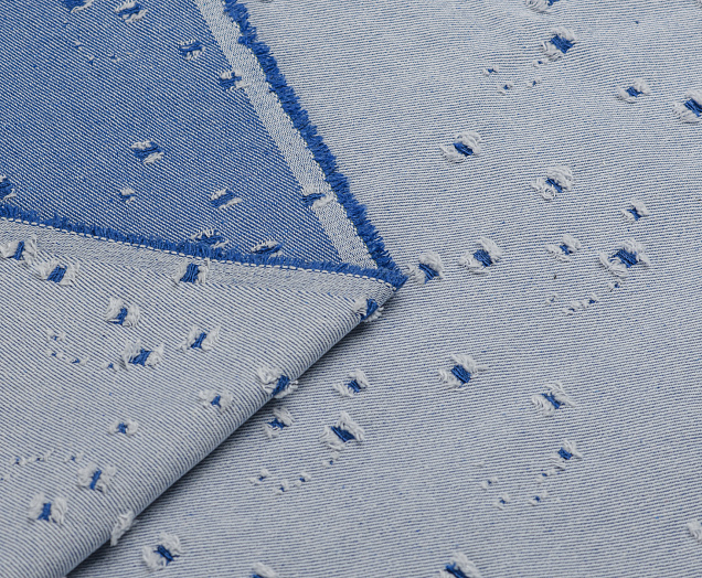 Ткань джинсовая прочная и износостойкая. Характеризуется воздухопроницаемостью, крепостью и устойчивостью к повреждениям. Ткань двухсторонняя, можно любую сторону. По всему полотну декоративные дырки, размер примерно от 5 до 10 мм. Ткань идеальна для пошива не только стильной одежды: платьев, юбок, джинсовых курток, брюк, но и подходит для шитья сумок и рюкзаков.