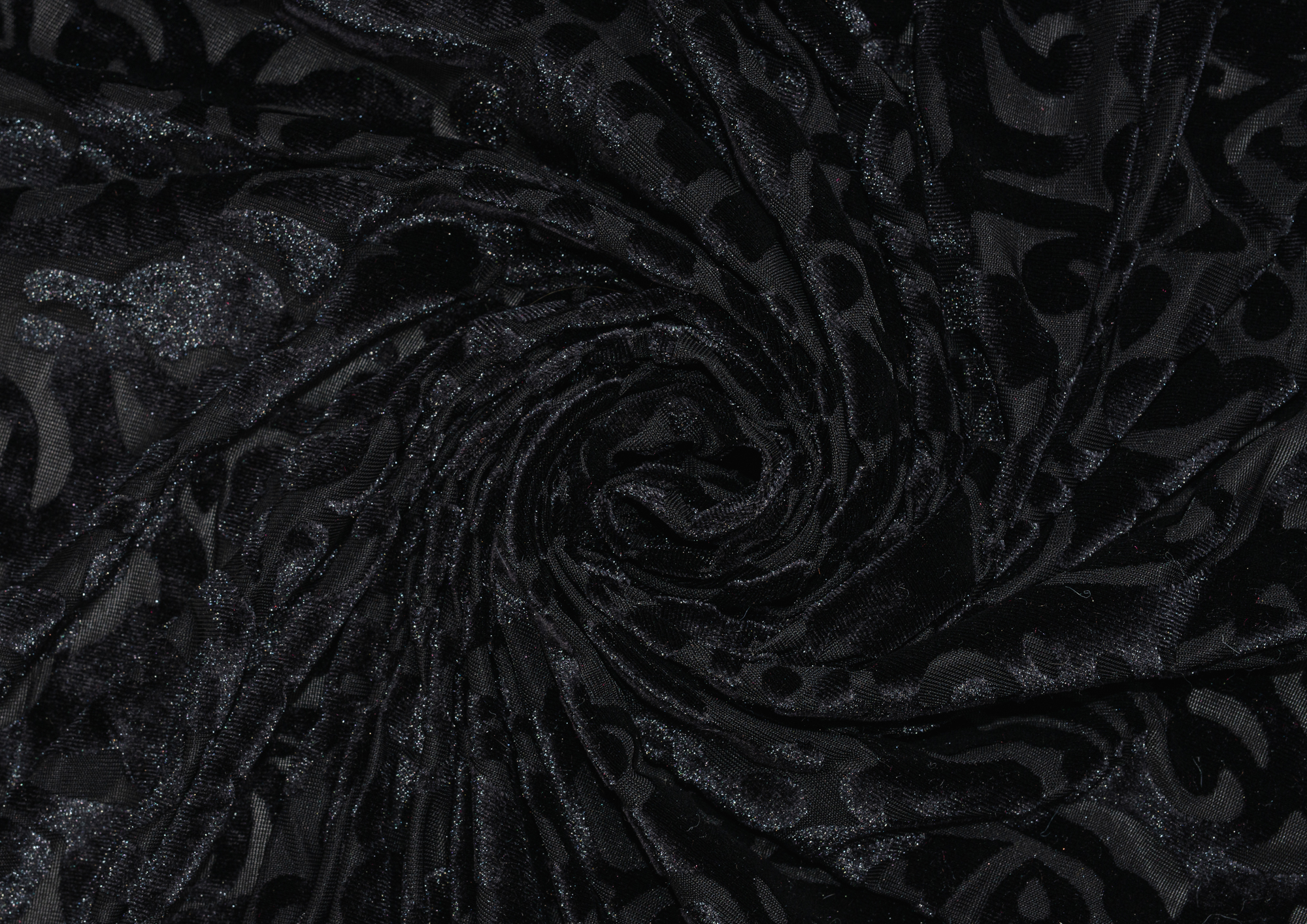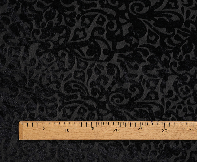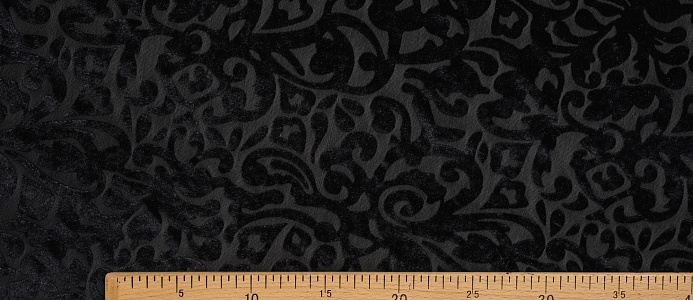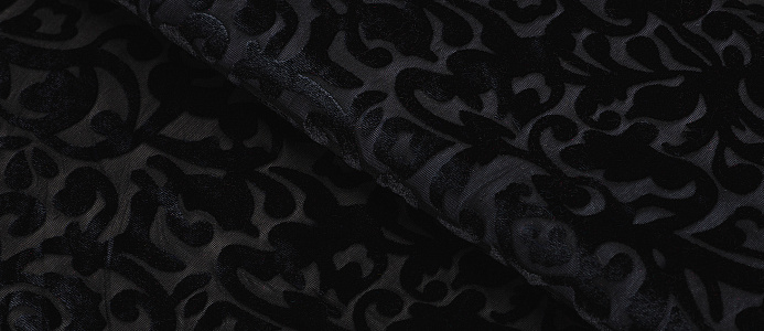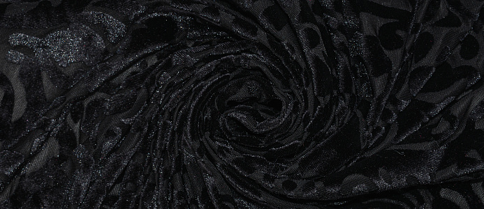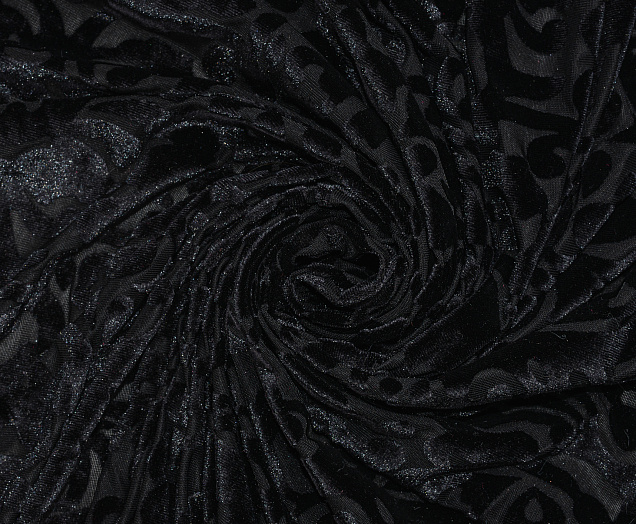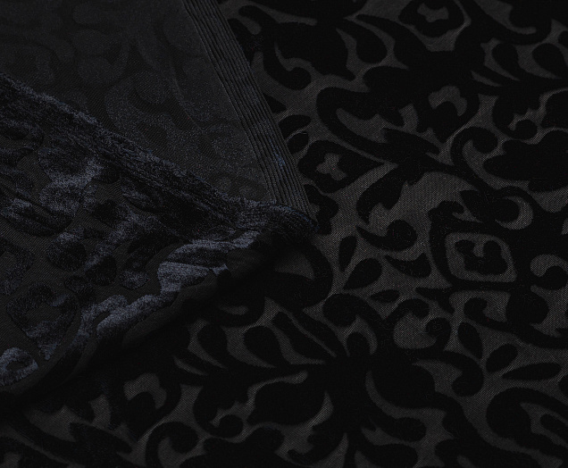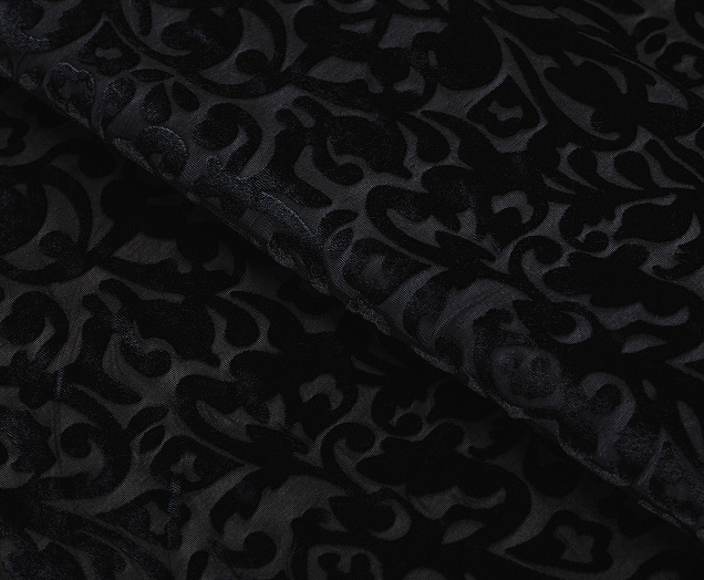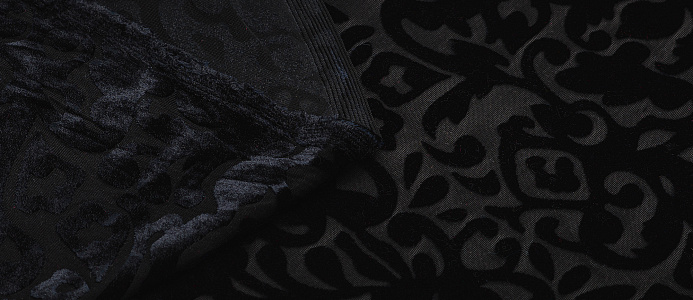 Мягкая приятная и очень уютная ткань. Лицевая сторона с ворсом, вытравленным рисунком, изнанка гладкая трикотажная. Поверхность немного с блеском. При крое обязательно нужно учитывать направление ворса! Платье из бархата всегда выглядит нарядно, отлично подходит для пошива вечернего наряда, а так же для концертных выступлений.