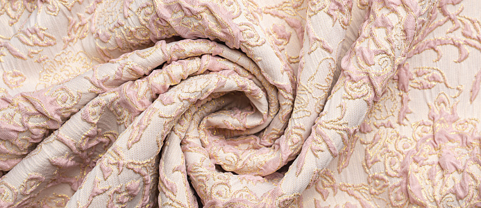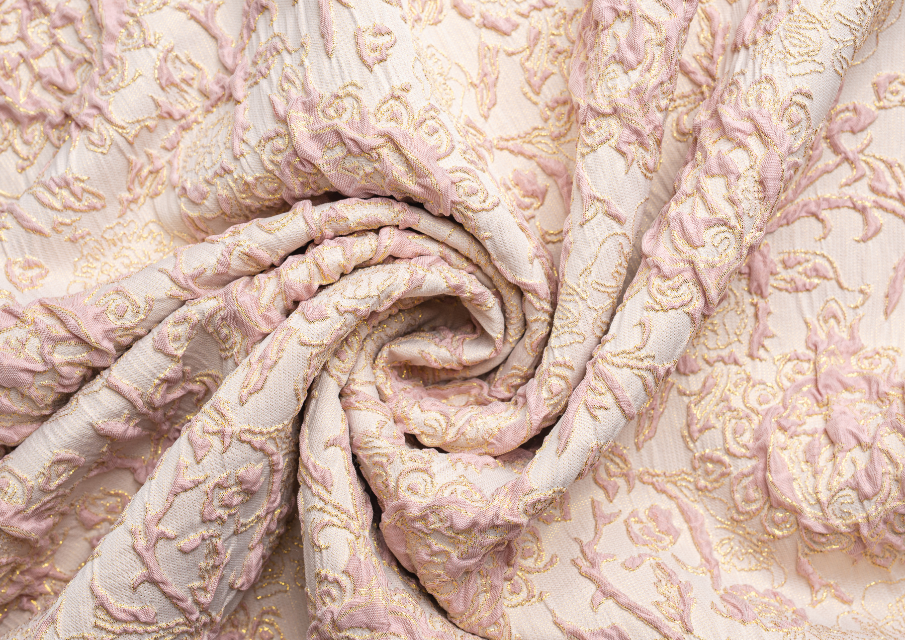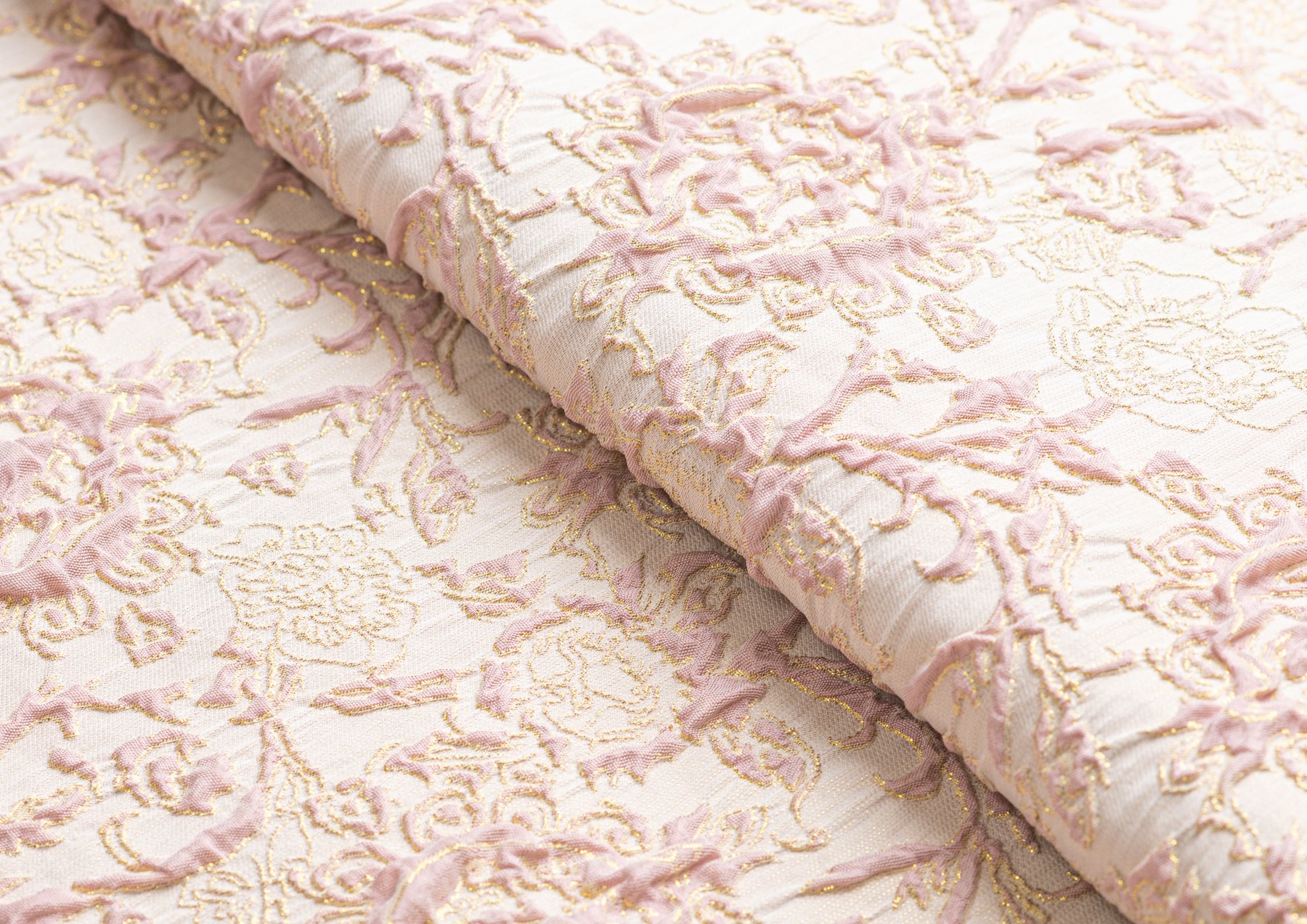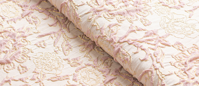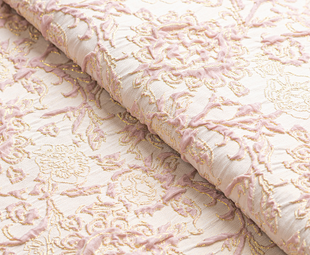 Гладкая ткань с рельефным рисунком . Полотно средней плотности , хорошо держит форму, отлично драпируется . Используется в пошиве праздничных нарядов, театральных костюмов . Ткань переливается на свету ,  в изделии выглядит очень эффектно .