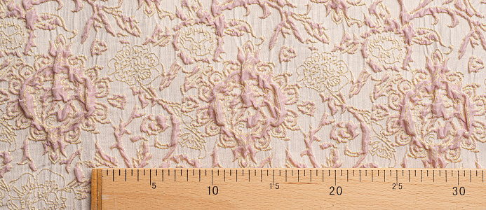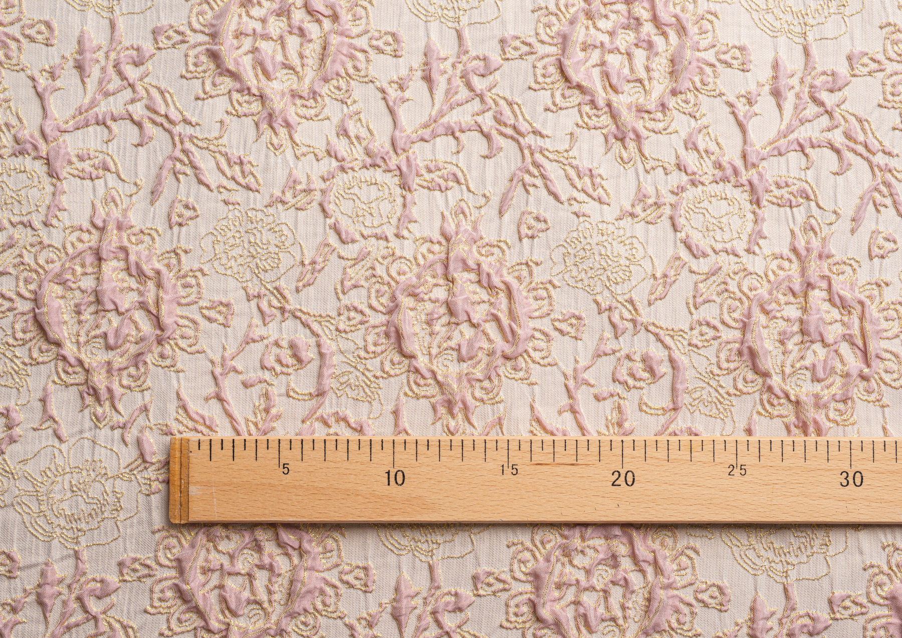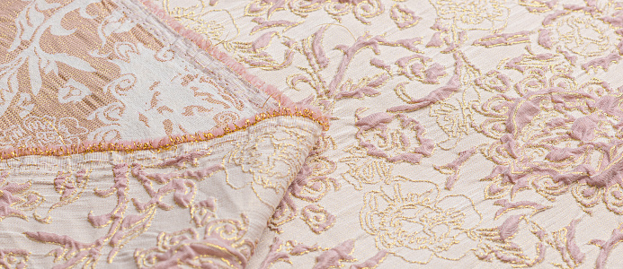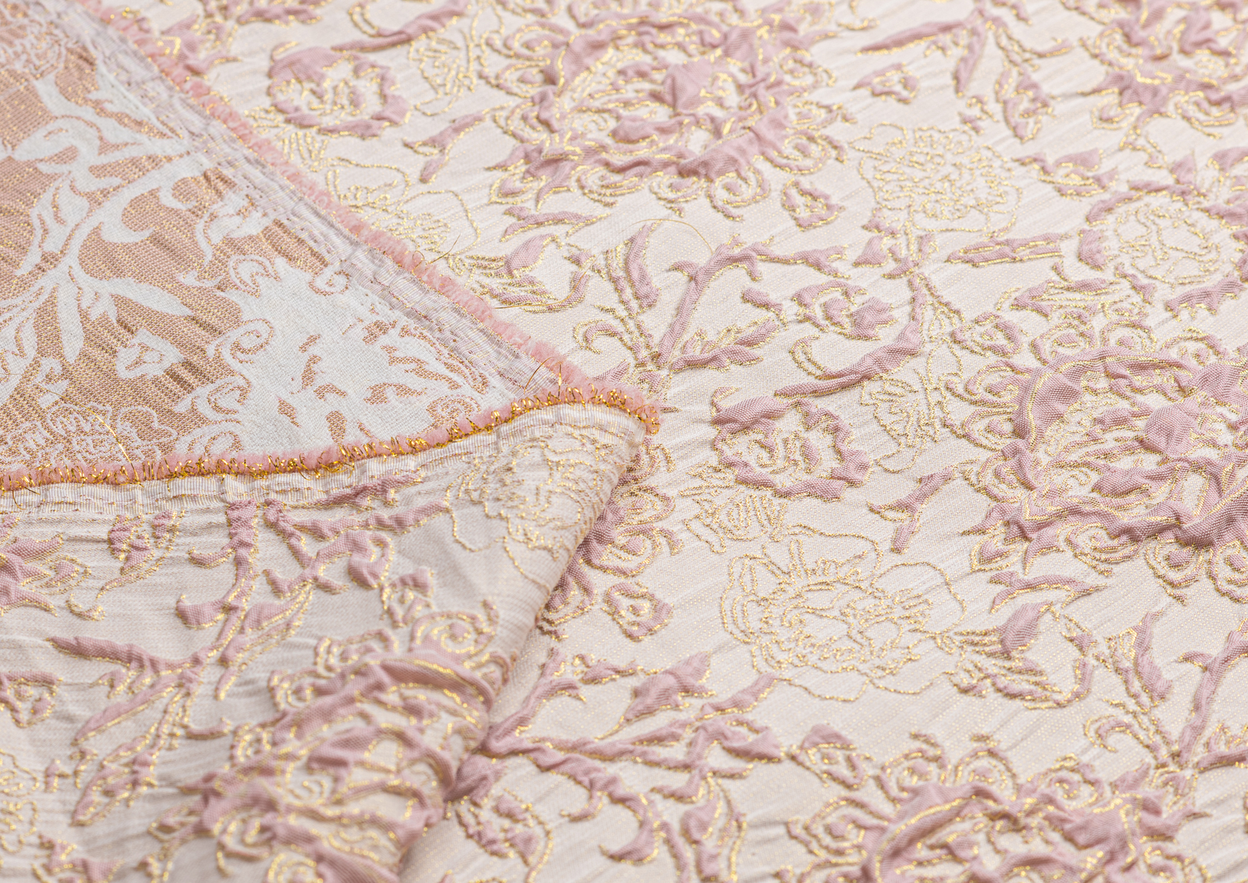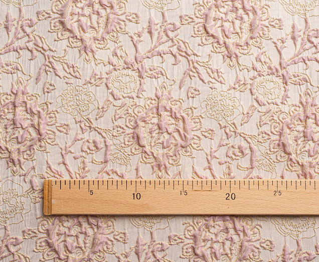 Гладкая ткань с рельефным рисунком . Полотно средней плотности , хорошо держит форму, отлично драпируется . Используется в пошиве праздничных нарядов, театральных костюмов . Ткань переливается на свету ,  в изделии выглядит очень эффектно .
