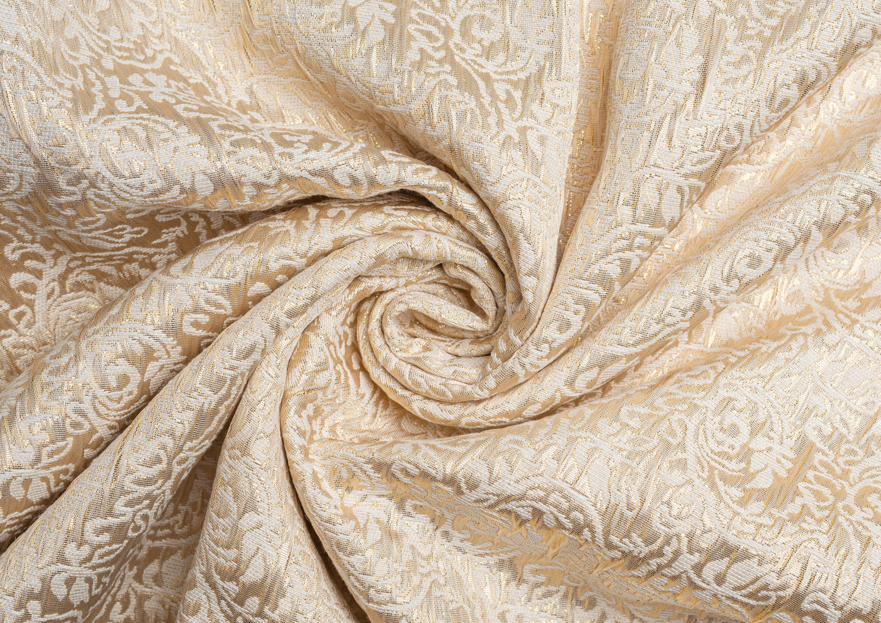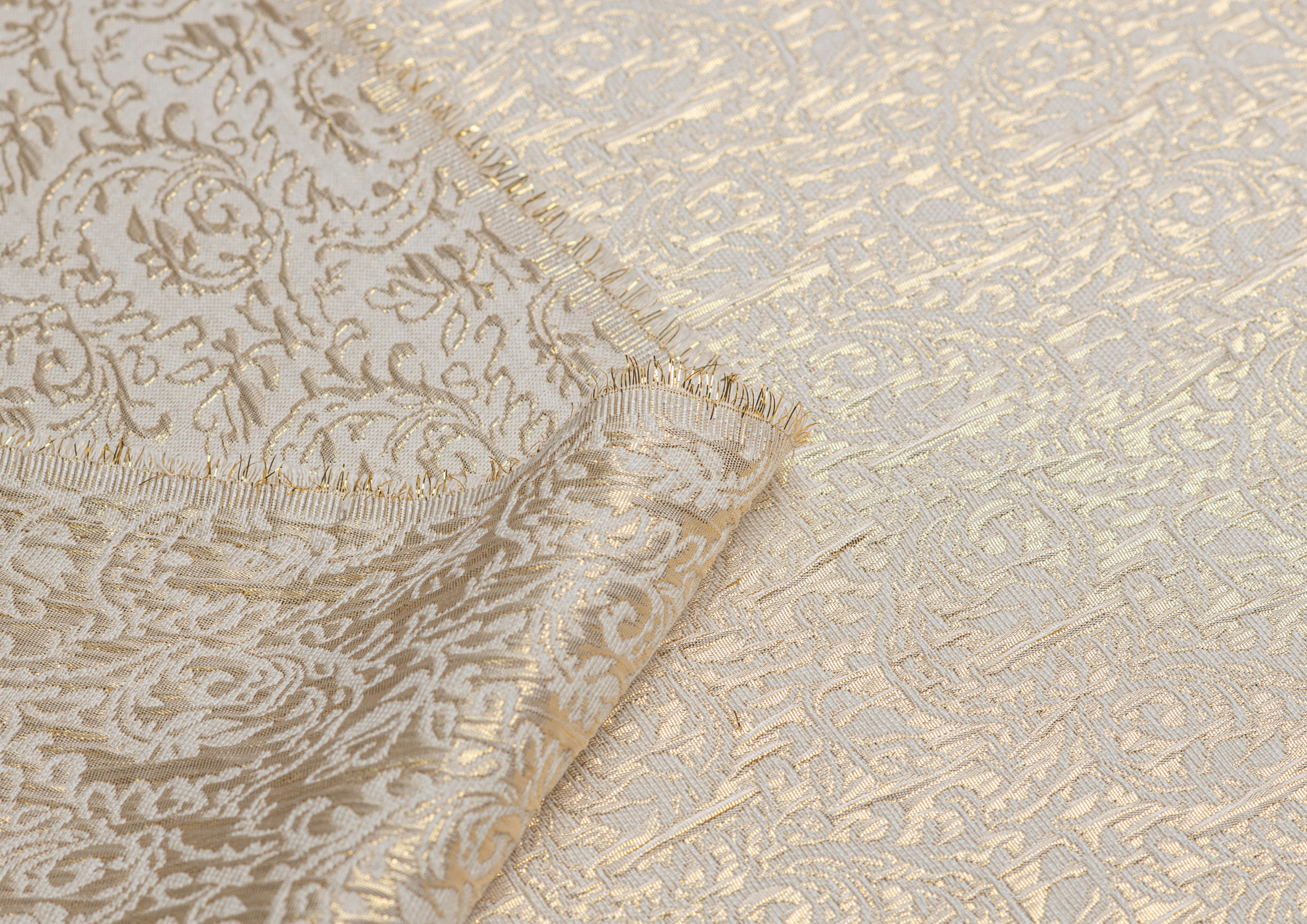 Гладкая ткань с рельефным рисунком . Полотно средней плотности , хорошо держит форму, отлично драпируется . Используется в пошиве праздничных нарядов, театральных костюмов . Ткань переливается на свету ,  в изделии выглядит очень эффектно .