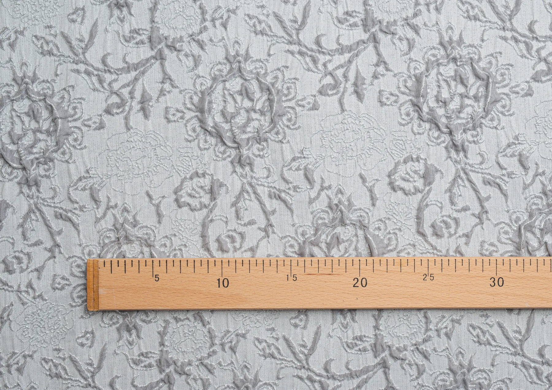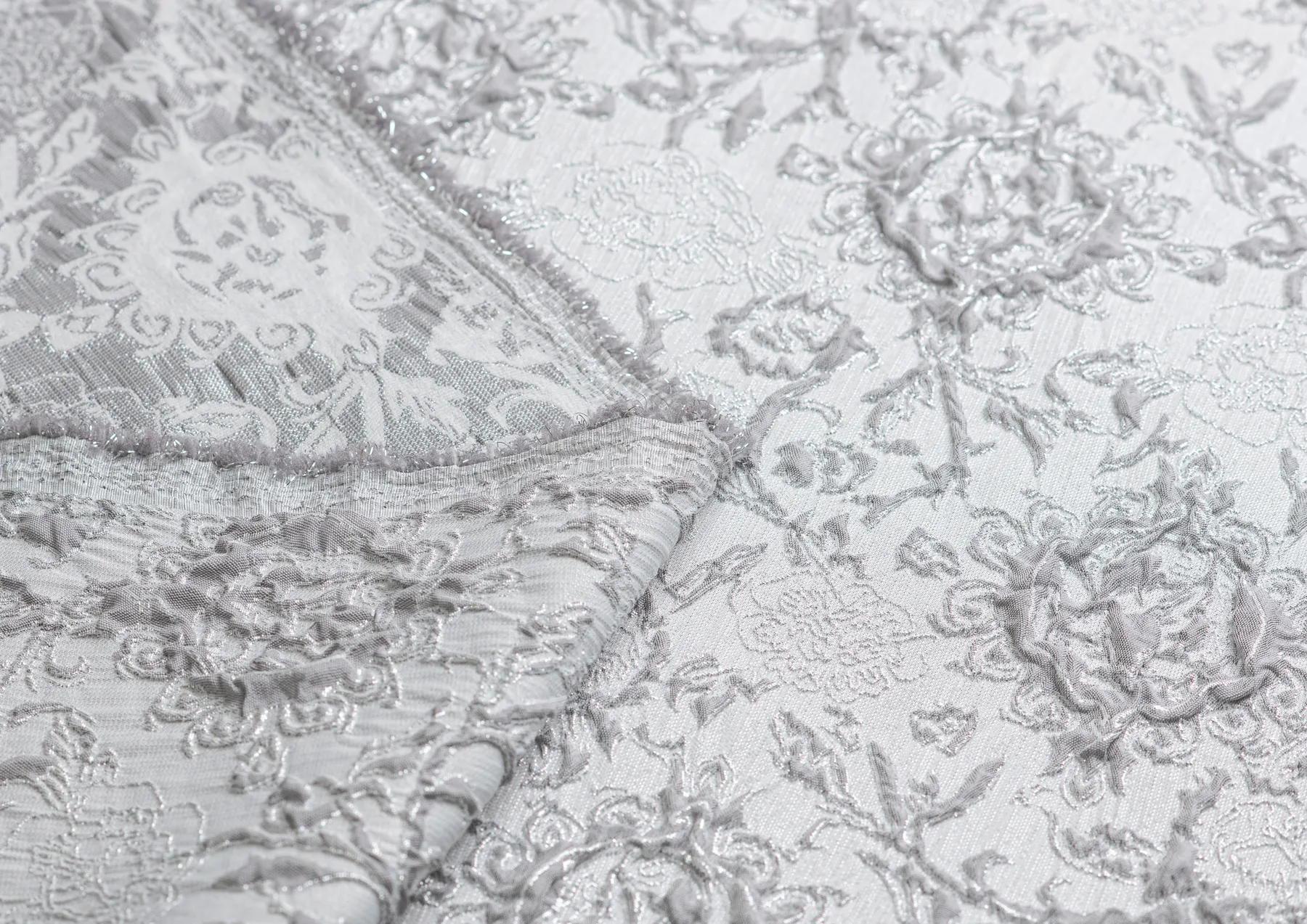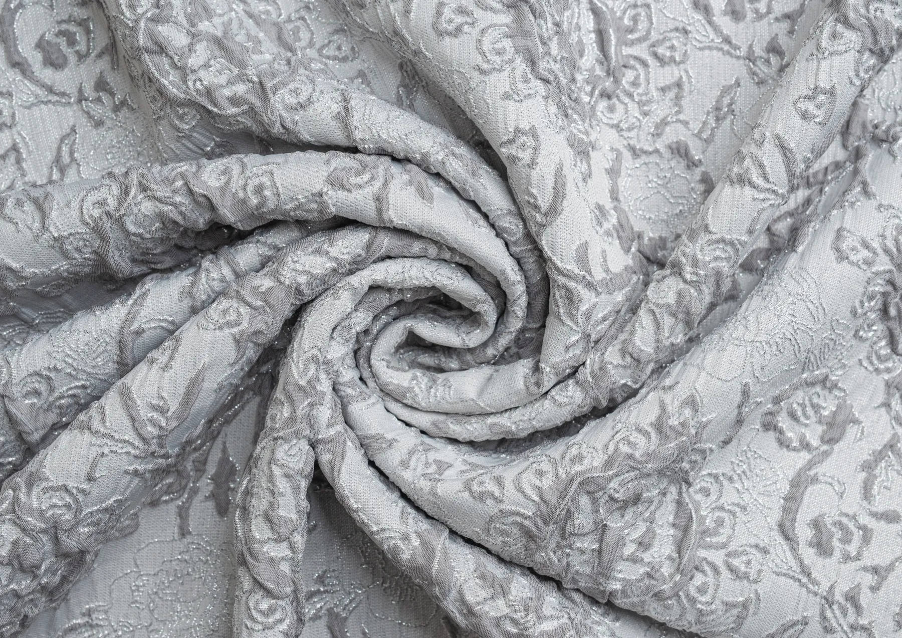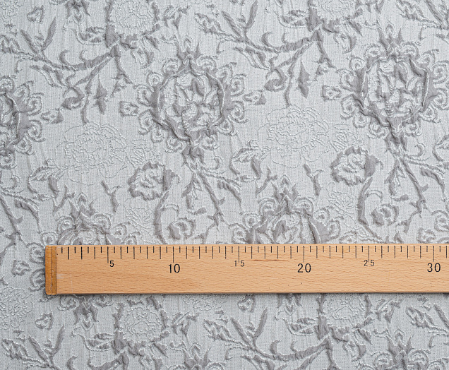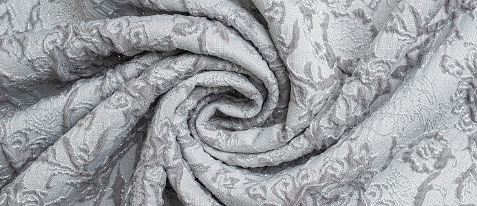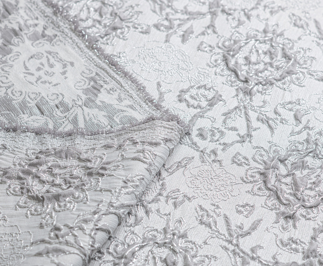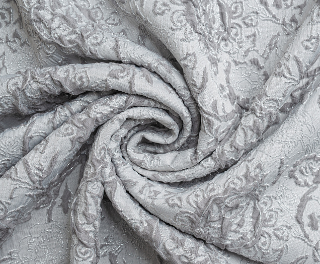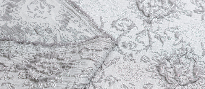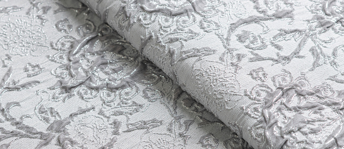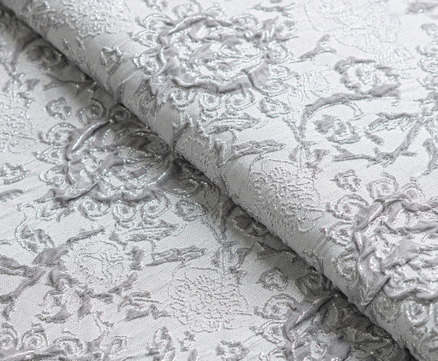 Гладкая ткань с рельефным рисунком . Полотно средней плотности , хорошо держит форму, отлично драпируется . Используется в пошиве праздничных нарядов, театральных костюмов . Ткань переливается на свету ,  в изделии выглядит очень эффектно .