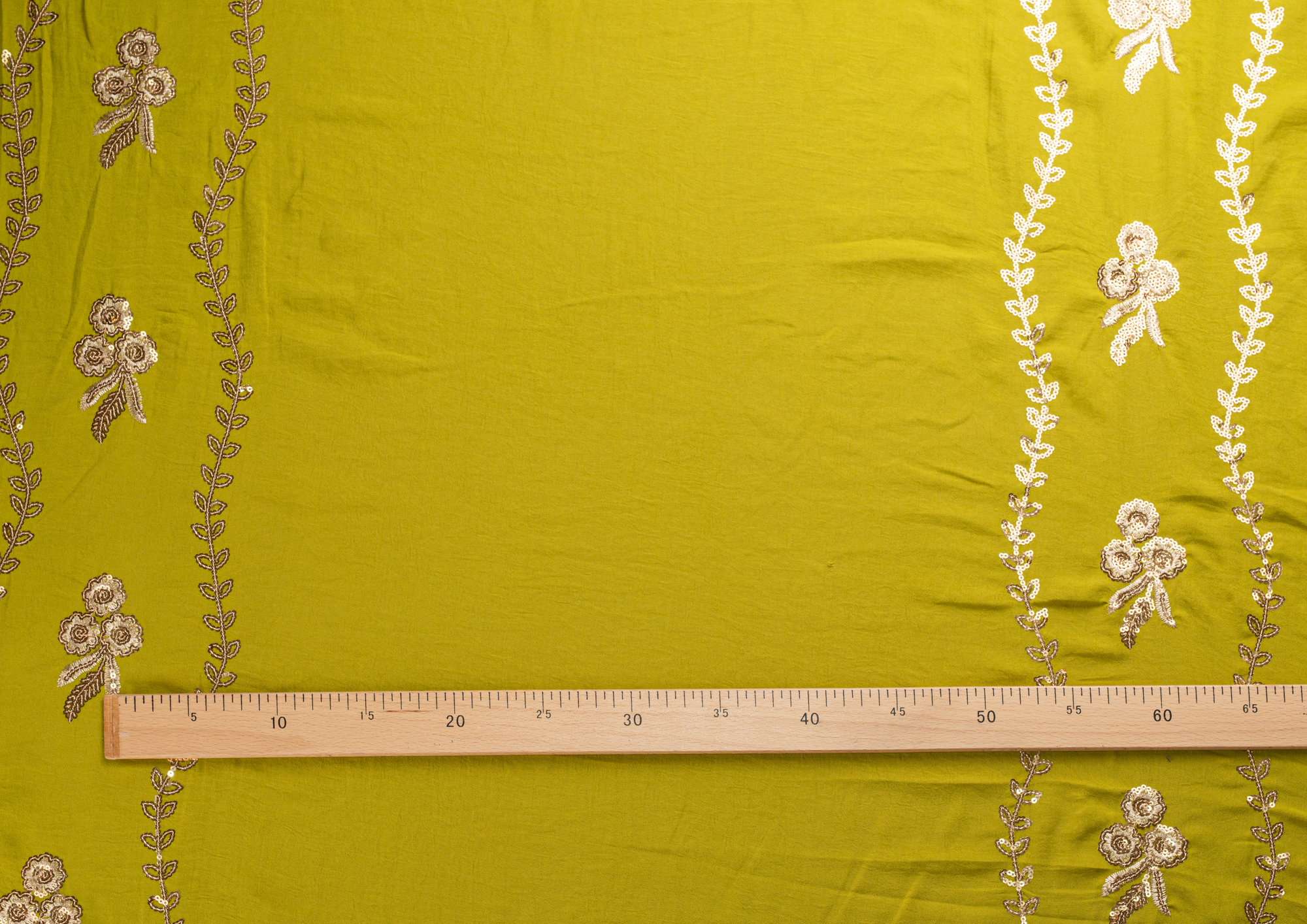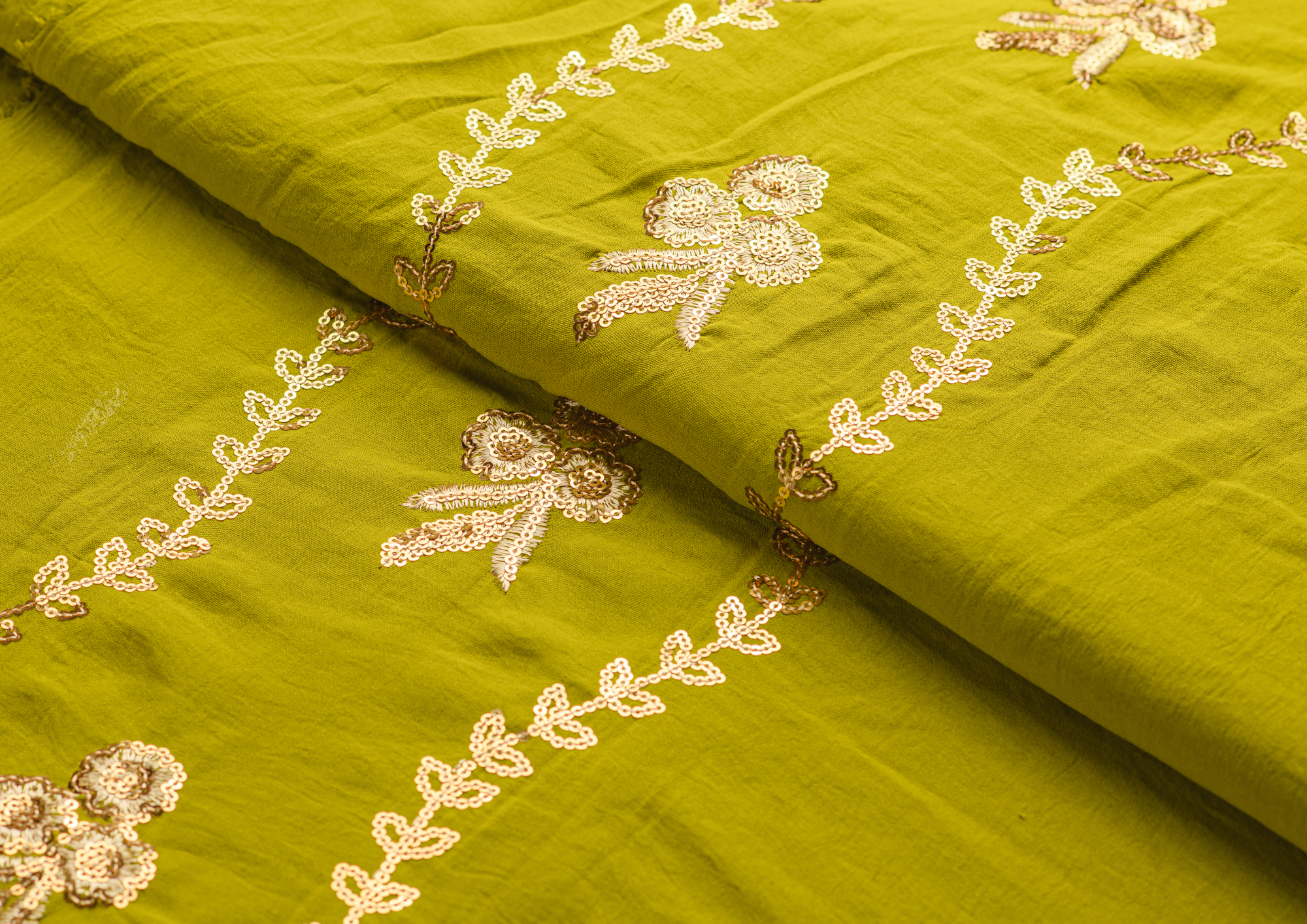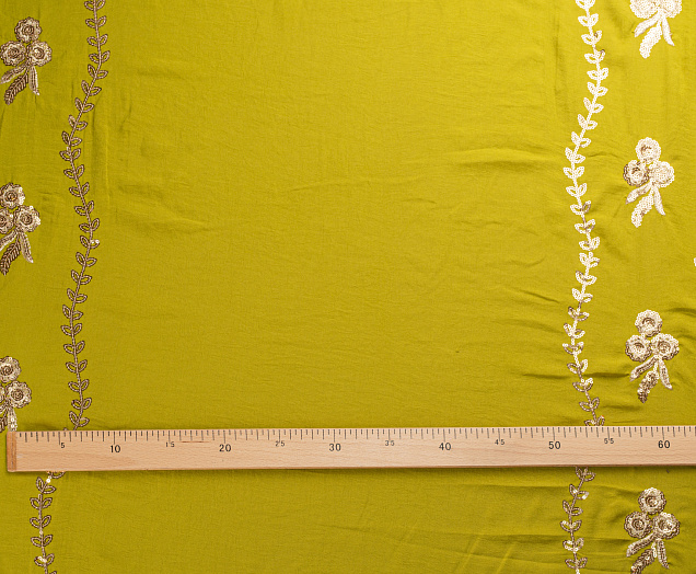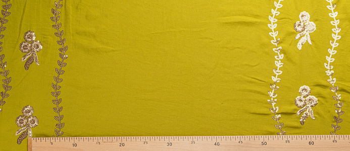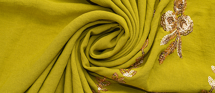 Ткань приятная тактильно, легкая и воздушная, при сминании не оставляет заломов, драпируется, ниспадает. Вышивка выполнена нитью и пайетками под золото. Подходит для пошива легких платьев, сарафанов, легких костюмов.