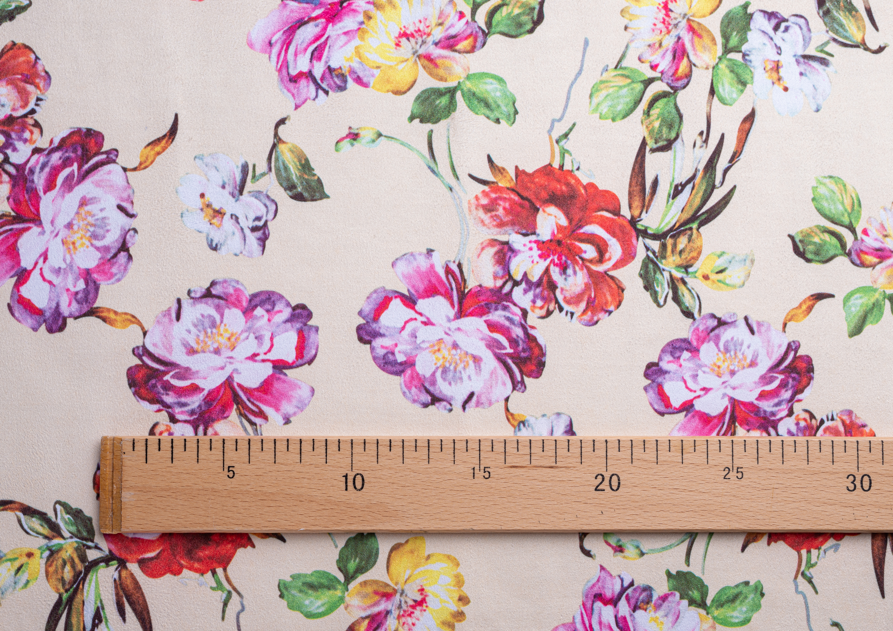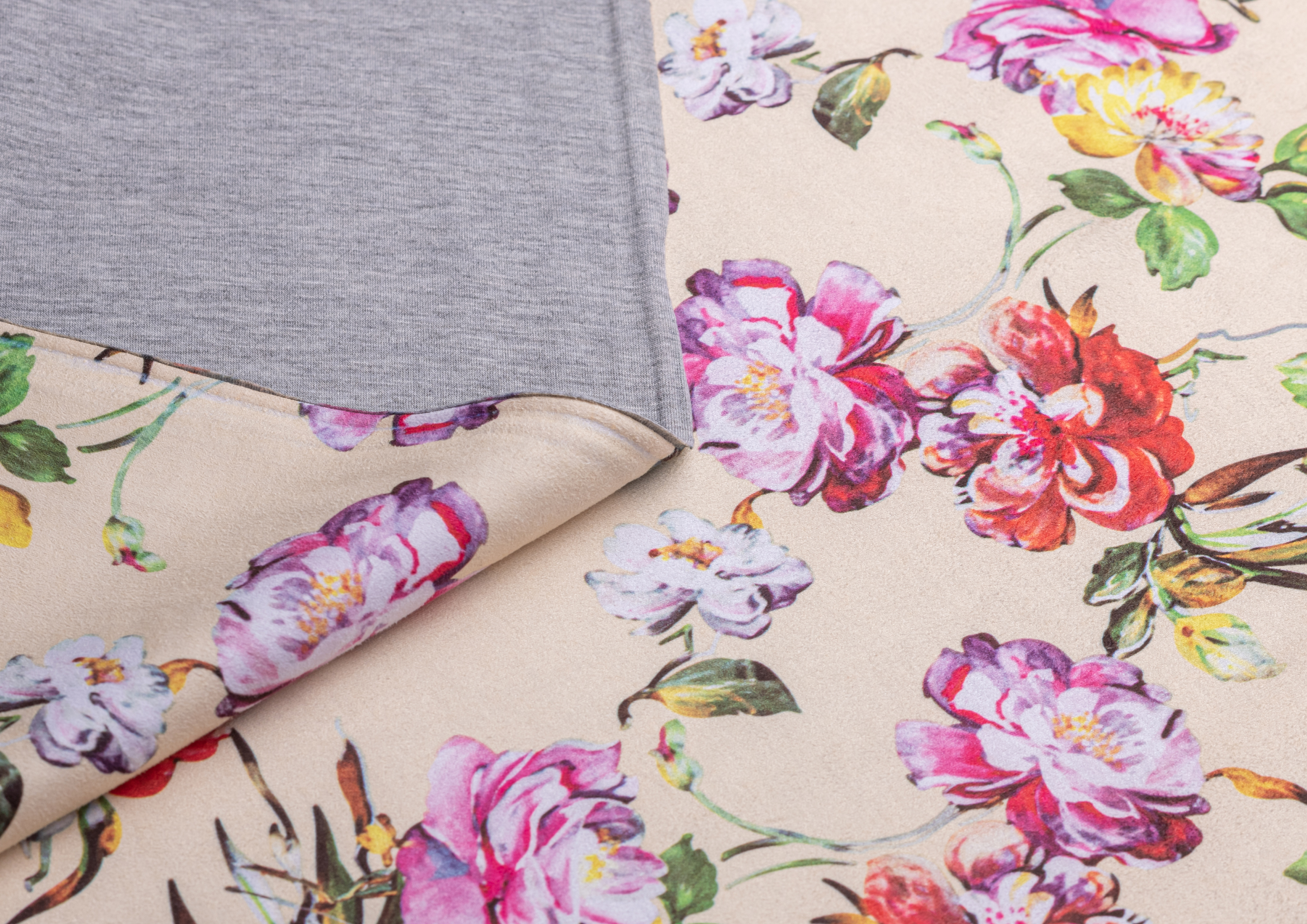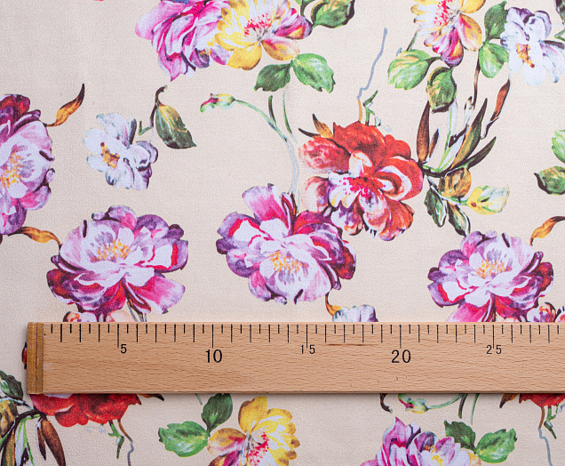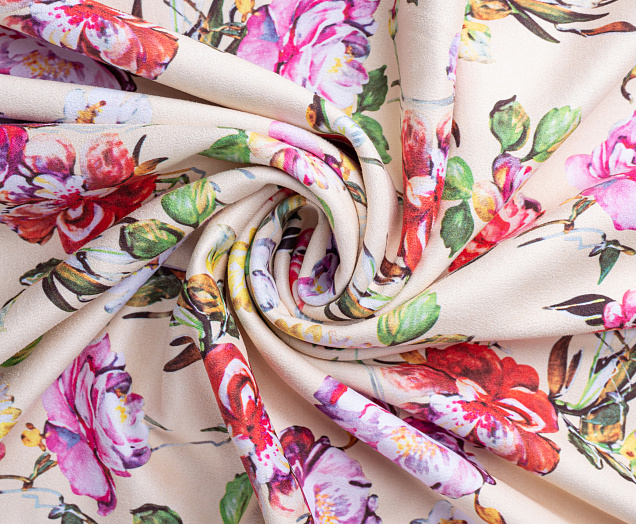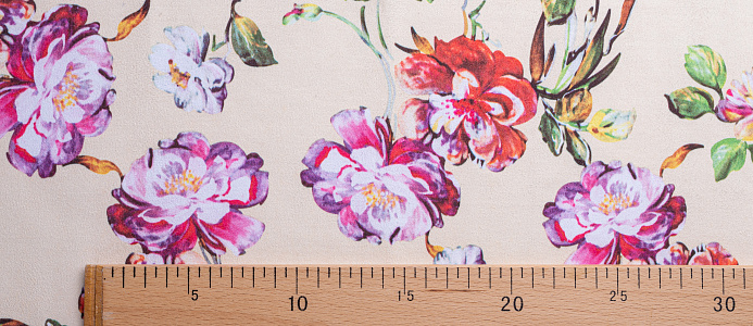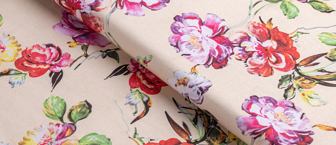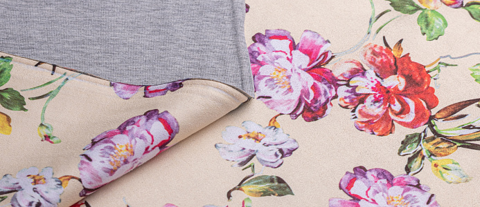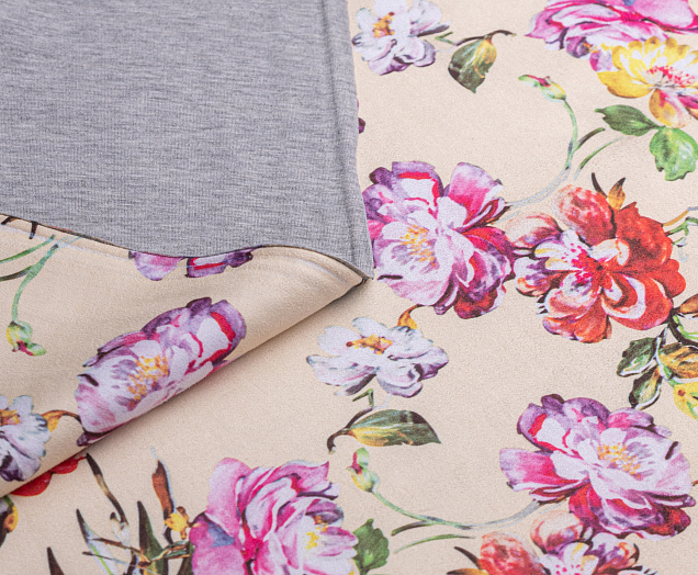 Трикотажное полотно. Лицевая сторона имитирует замшевую поверхность с принтом, изнанка гладкая, однотонная. Применяют для пошива юбок, платьев, брюк, кардиганов, легких пальто .