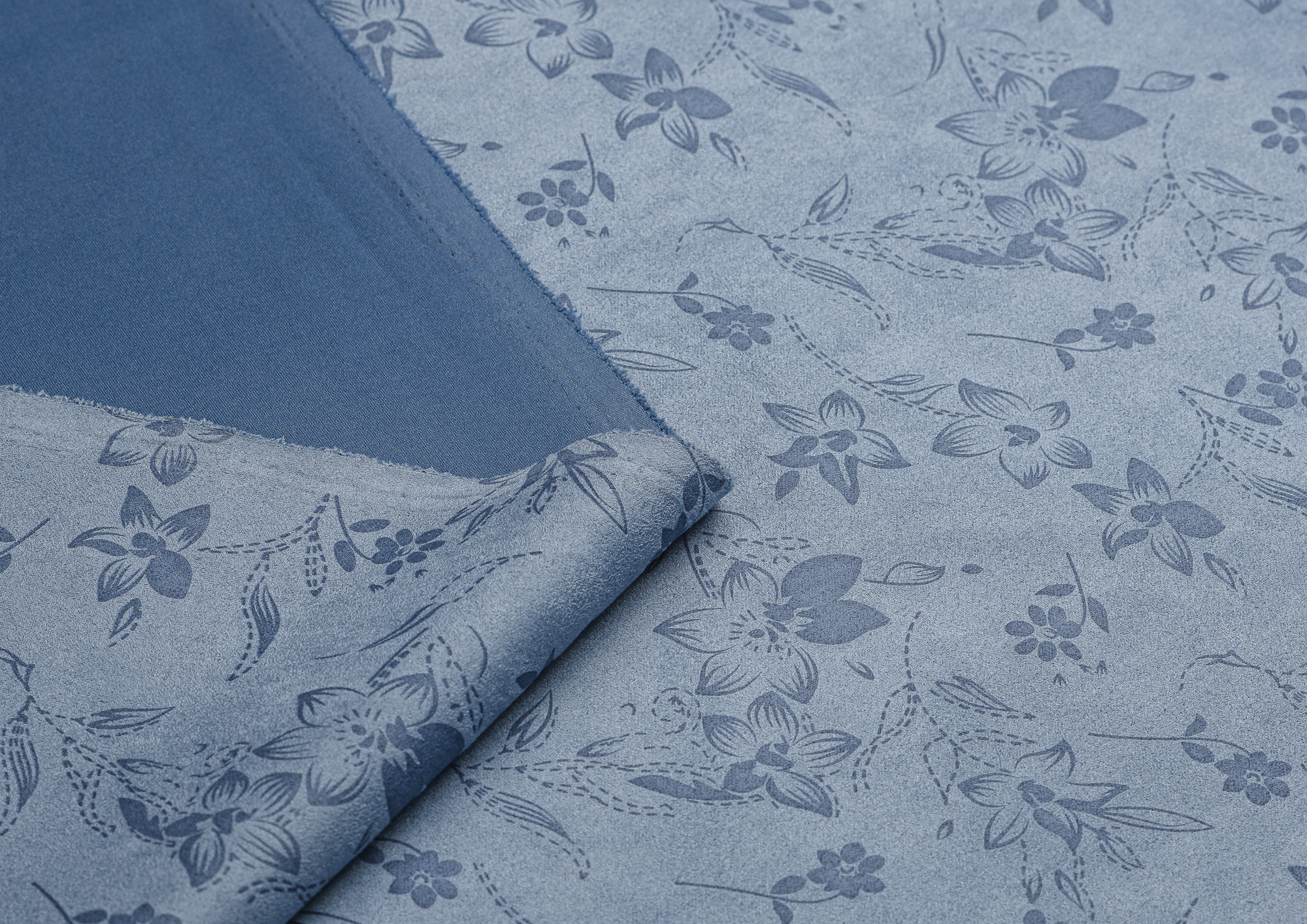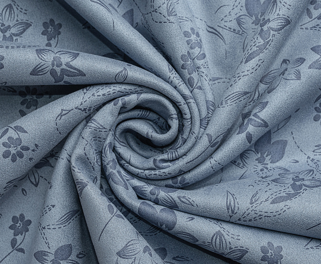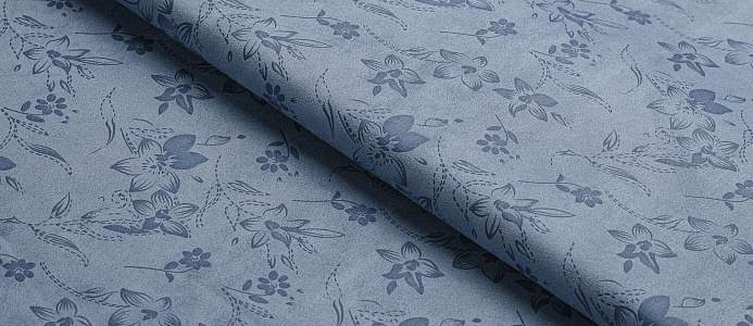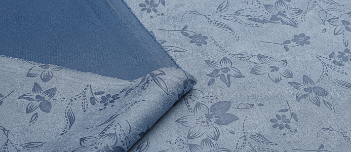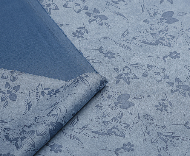 Трикотажное полотно. Лицевая сторона имитирует замшевую поврхность с нежным цветочным принтом, изнанка гладкая, однотонная. Применяют для пошива юбок, платьев, брюк, кардиганов, легких пальто.