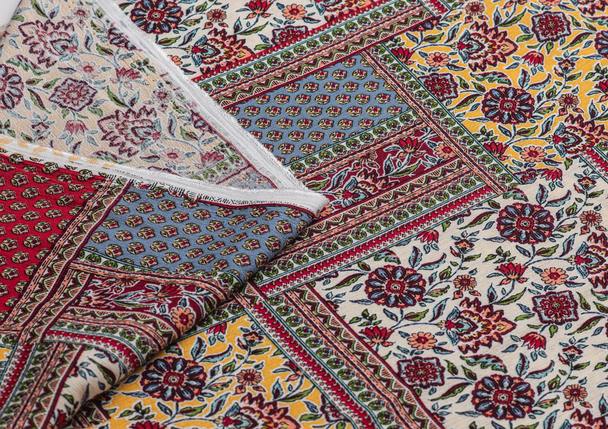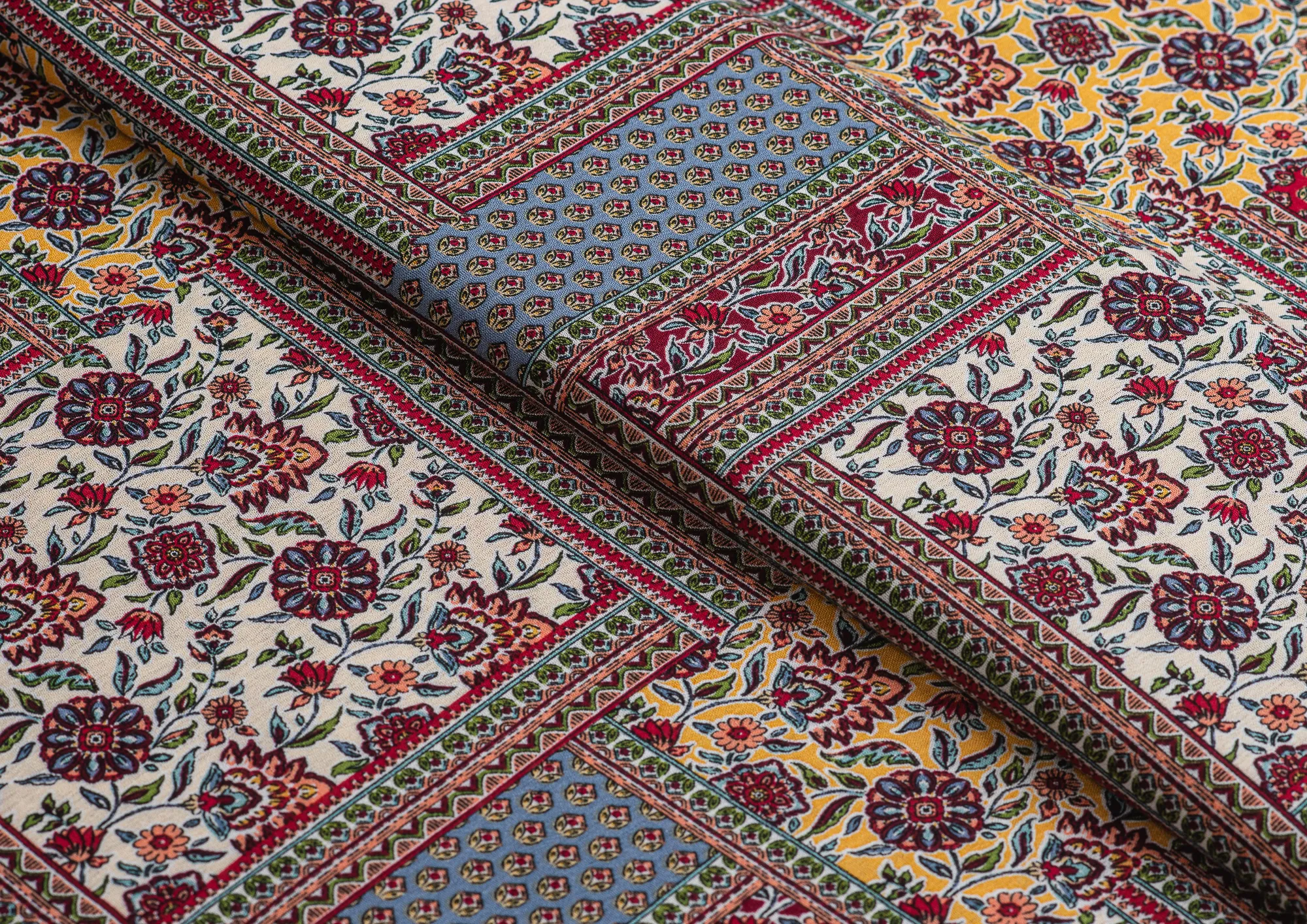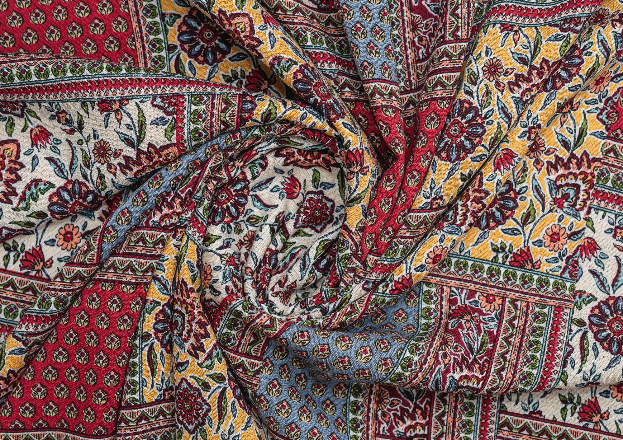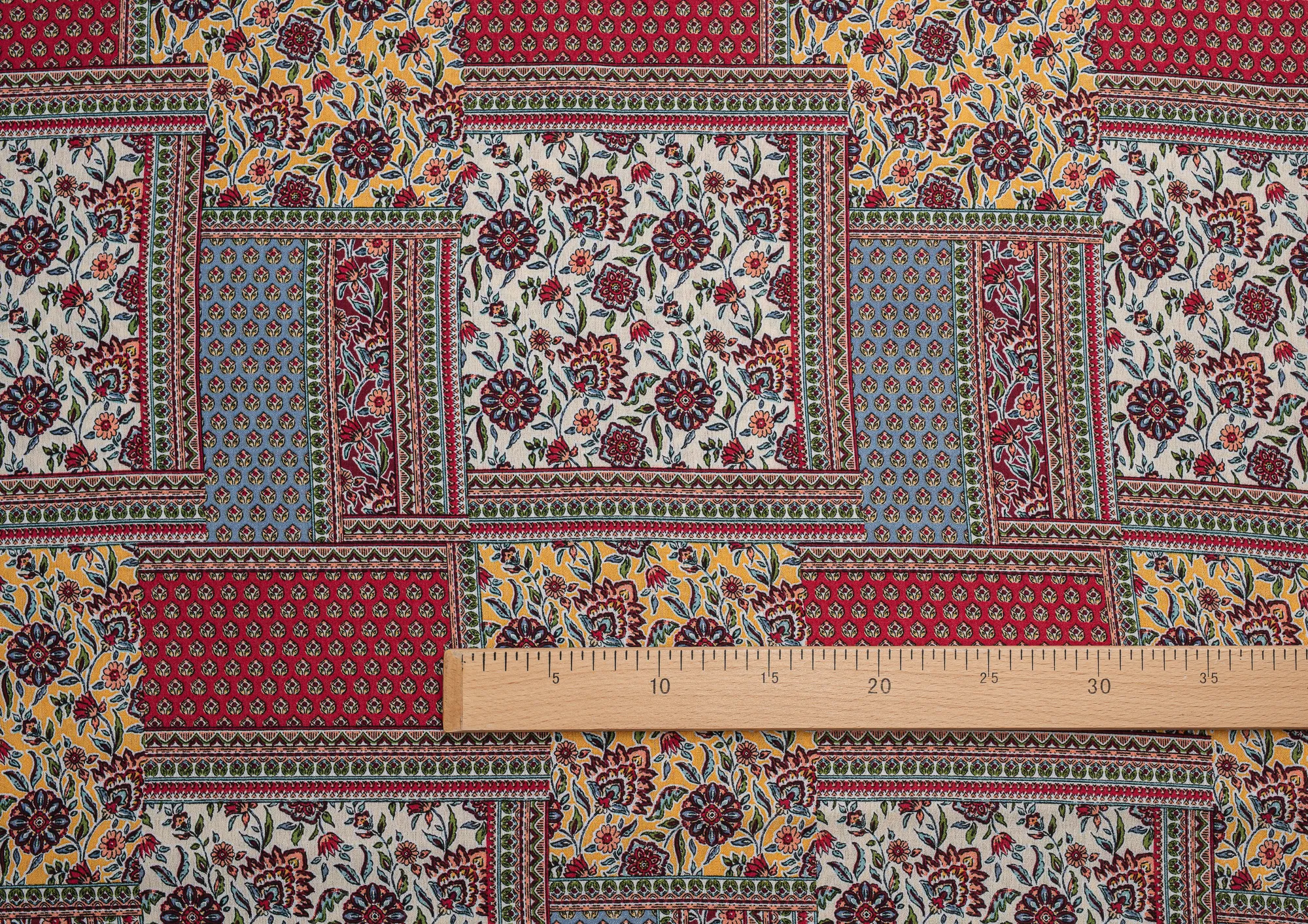 Мягкая , приятная на ощупь натуральная ткань. Само полотно немного креш . Ткань не просвечивает , подклад не требуется. Эластан в составе придаст вашему изделию комфорта. По всему плотну нанесен принт пейчворк. Ткань хорошо подходит для пошива платьев, сарафанов, летних костюмов , юбок, блузок , халатов.