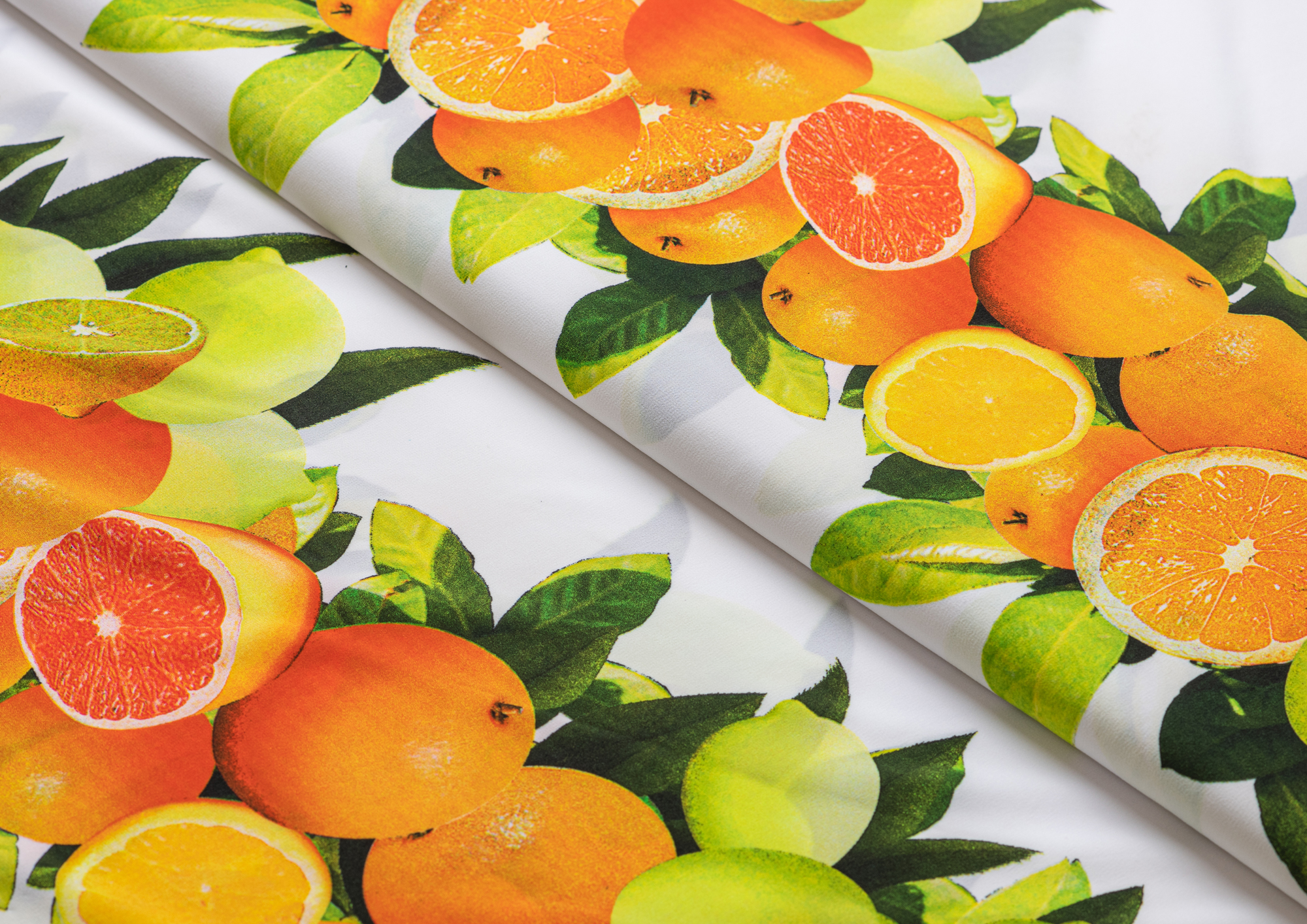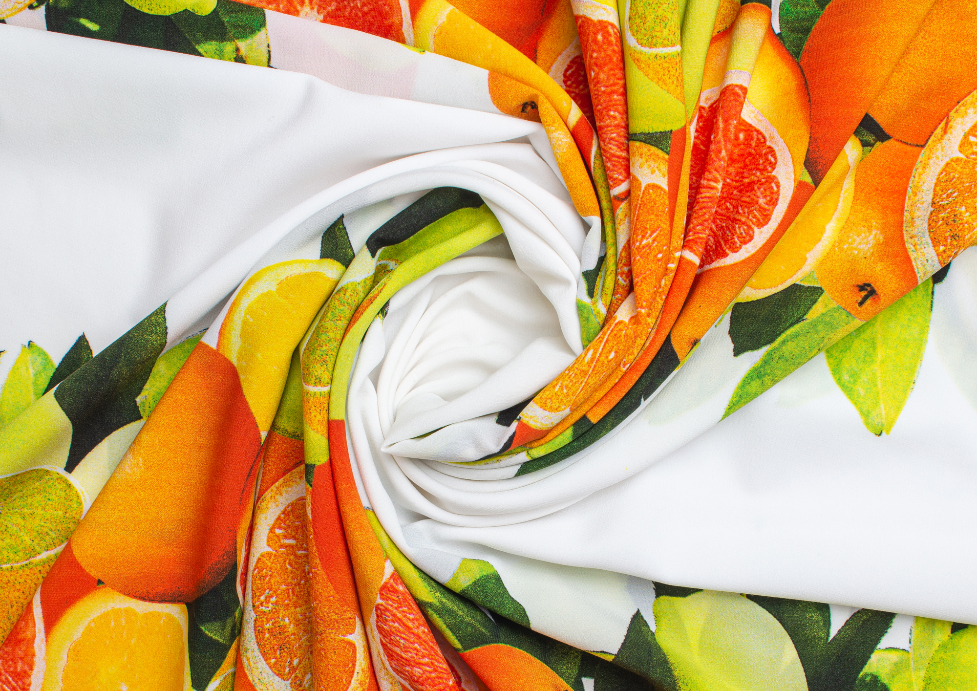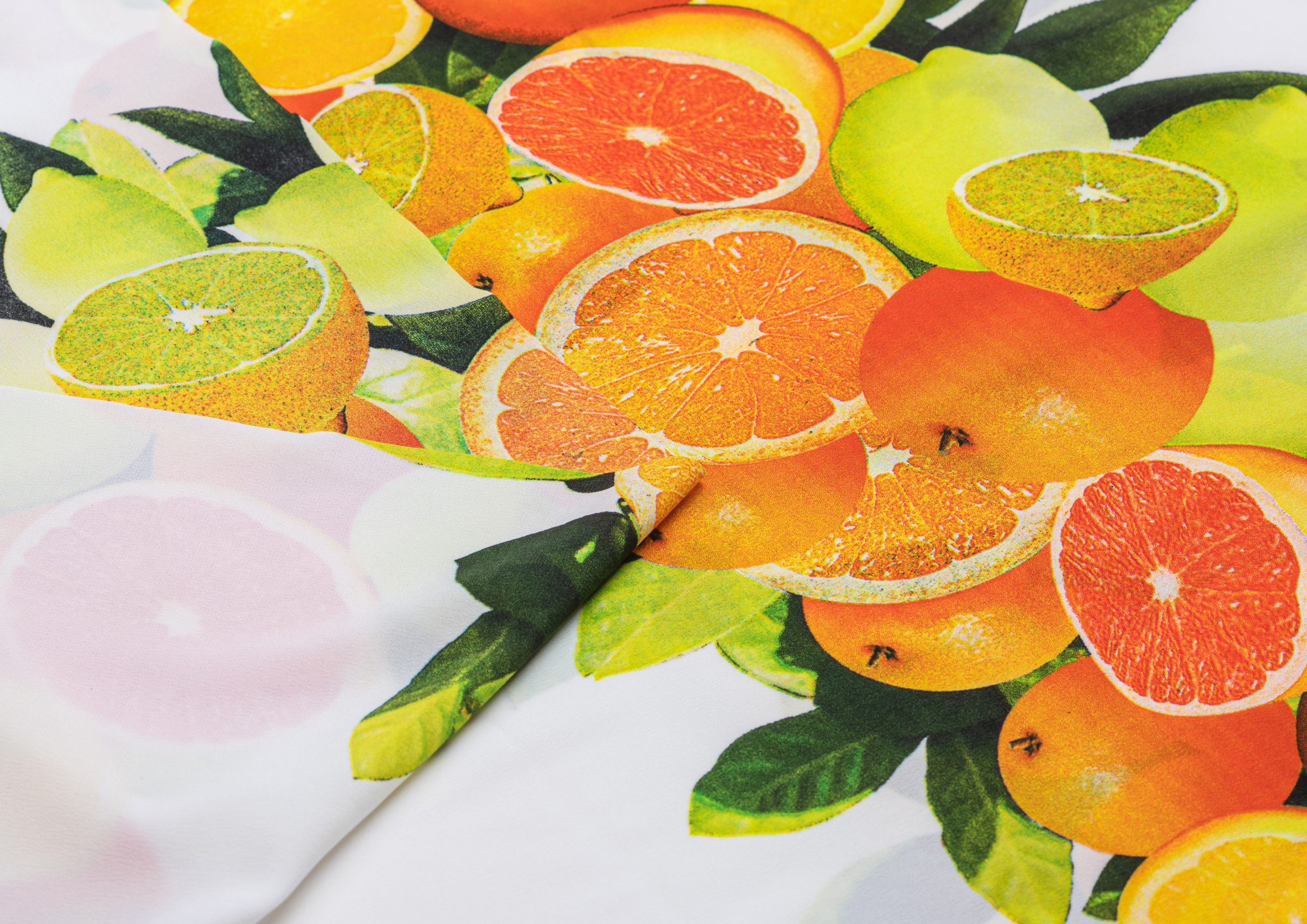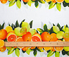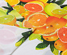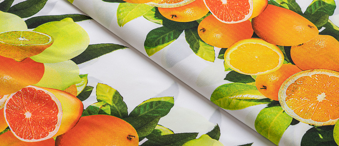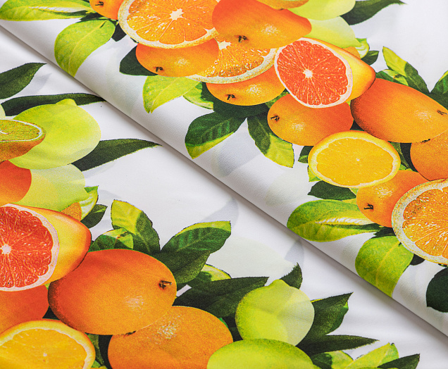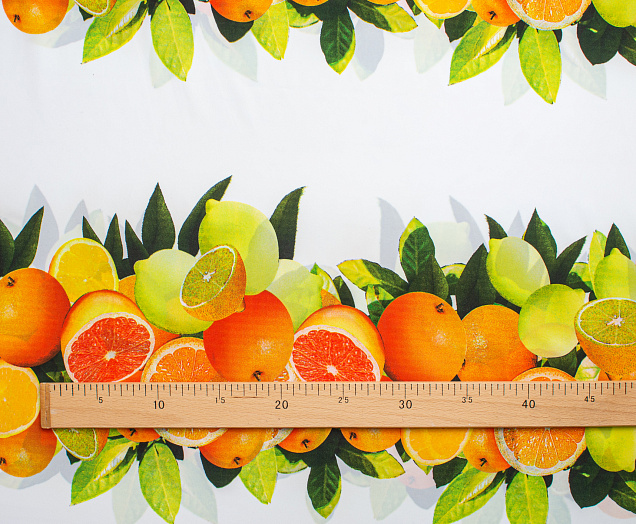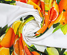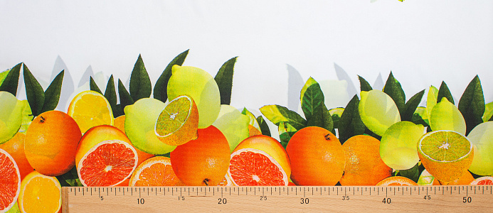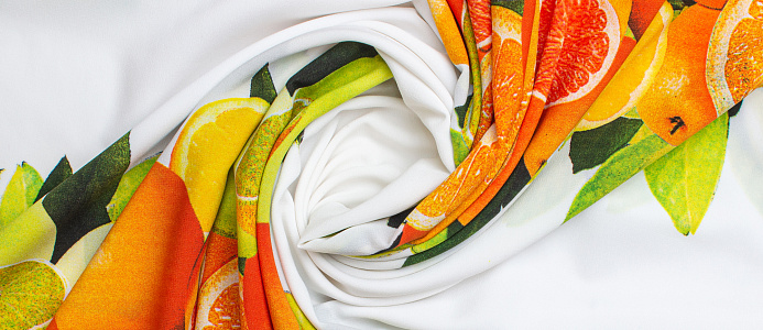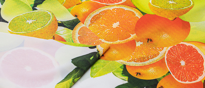 Тонкий французский шифон Пикассо легкий , воздушный , практически не прозрачный . Принт апельсины и лимоны  расположен полосами, которые идут вдоль ткани. Из шифона получаются женственные и романтичные наряды. Отлично подходит для блузок, платьев, сарафанов и юбок .