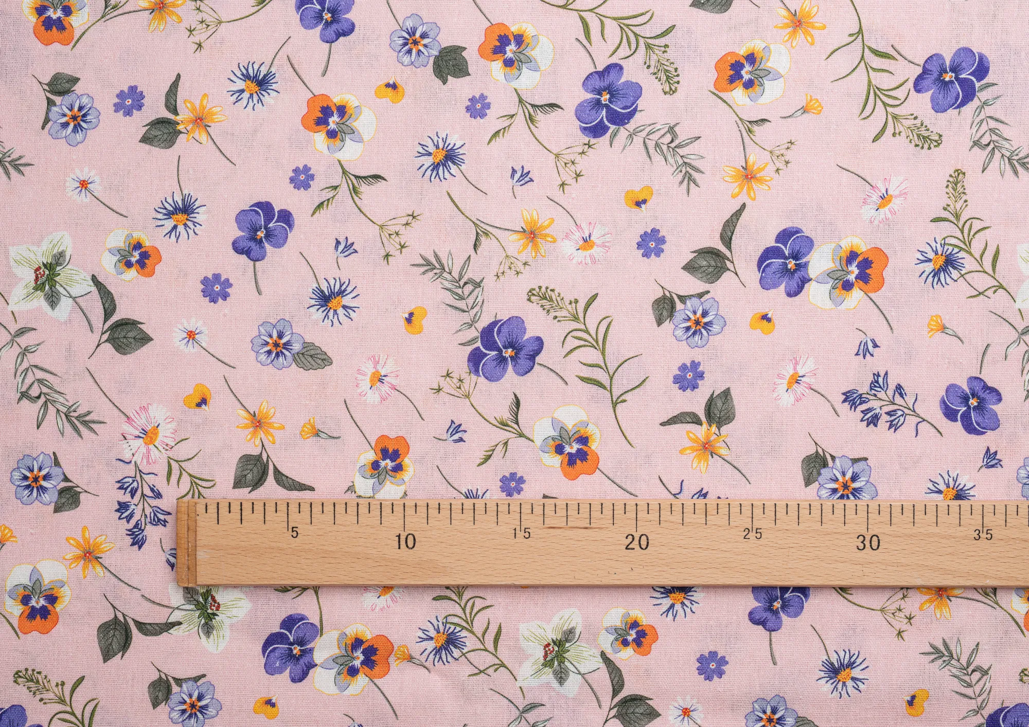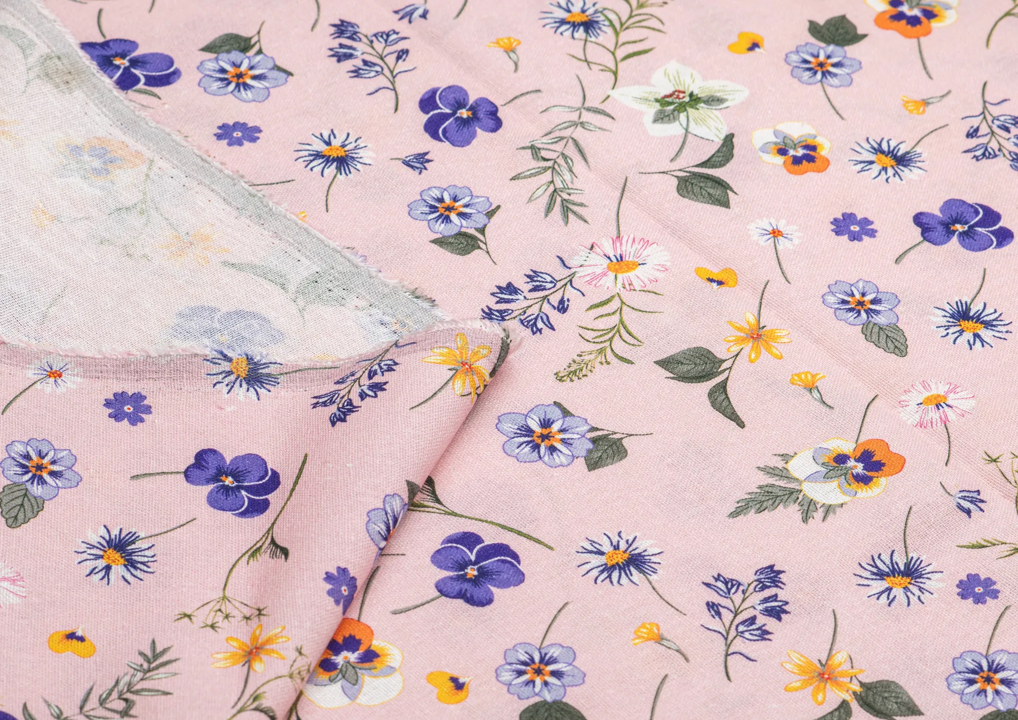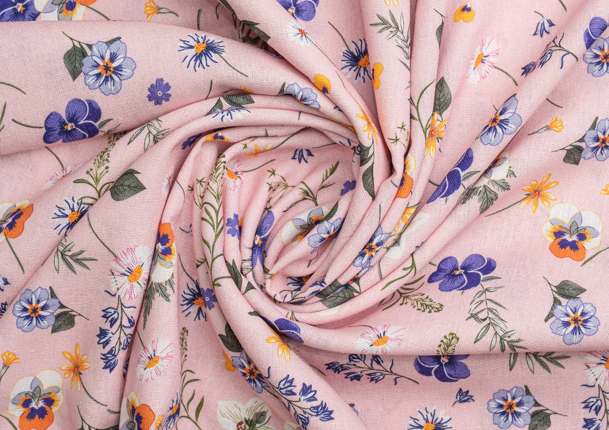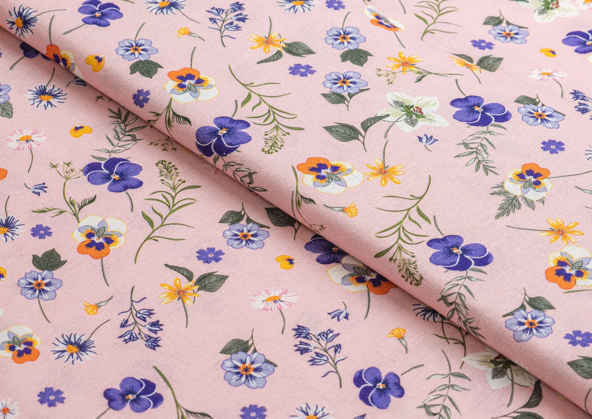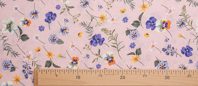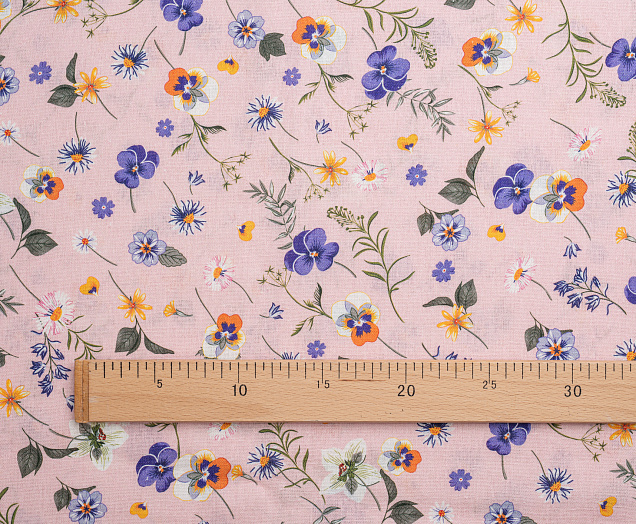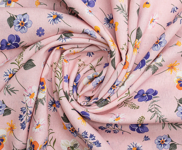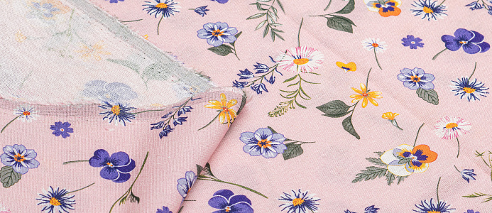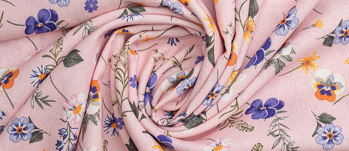 Ткань Лен Принт Анютины глазки на розовом