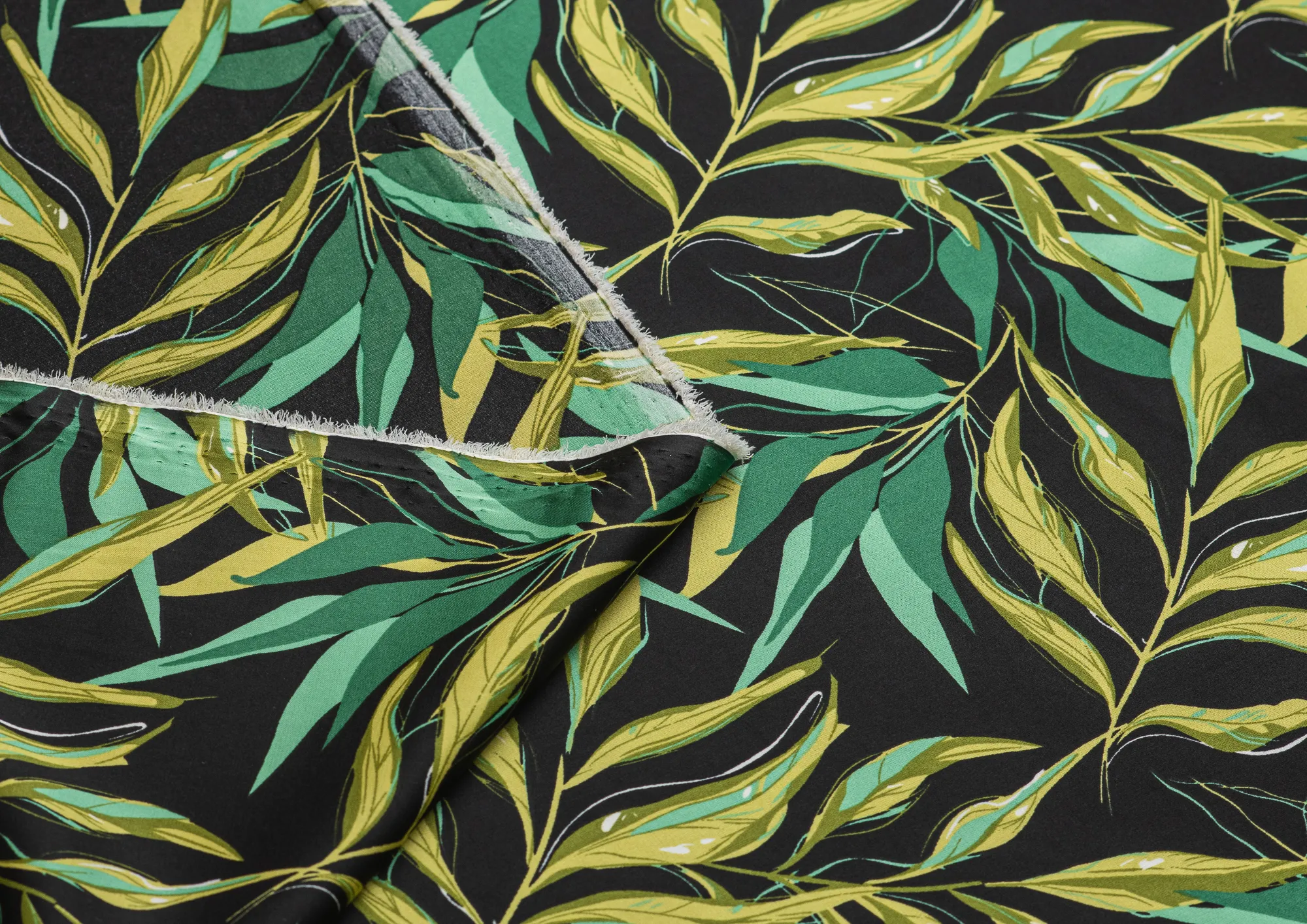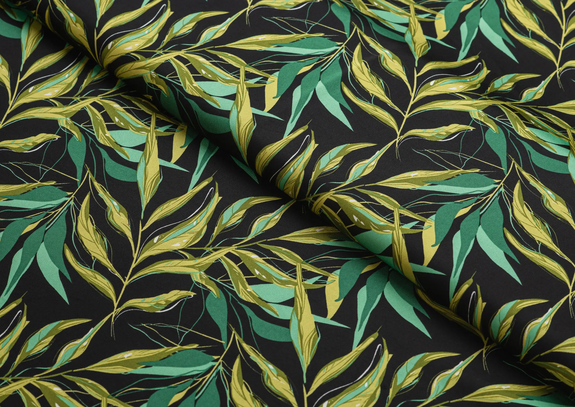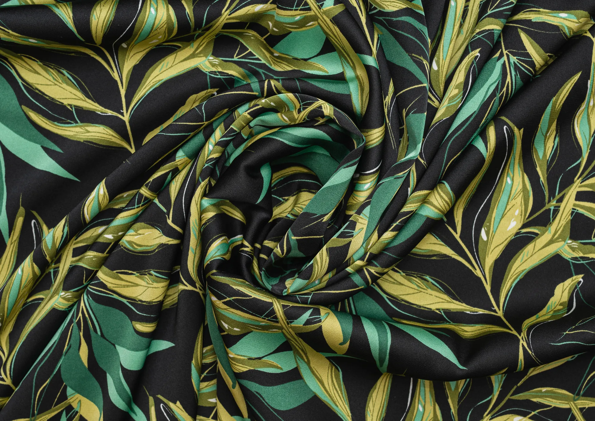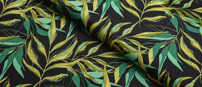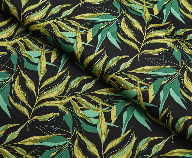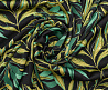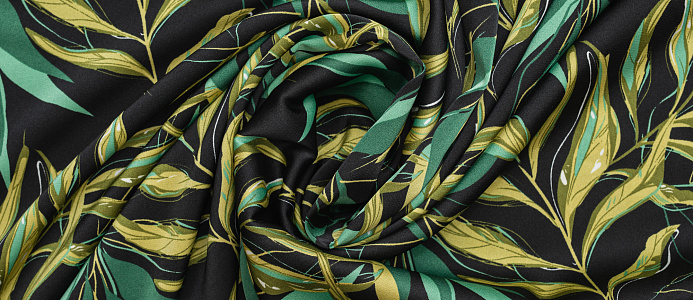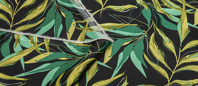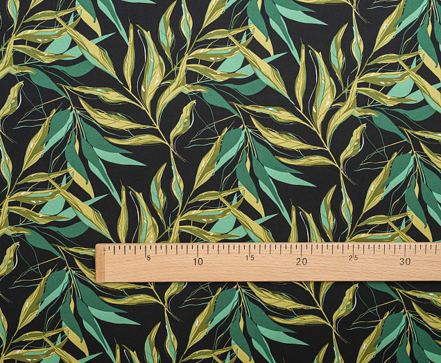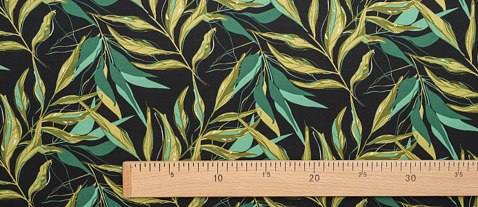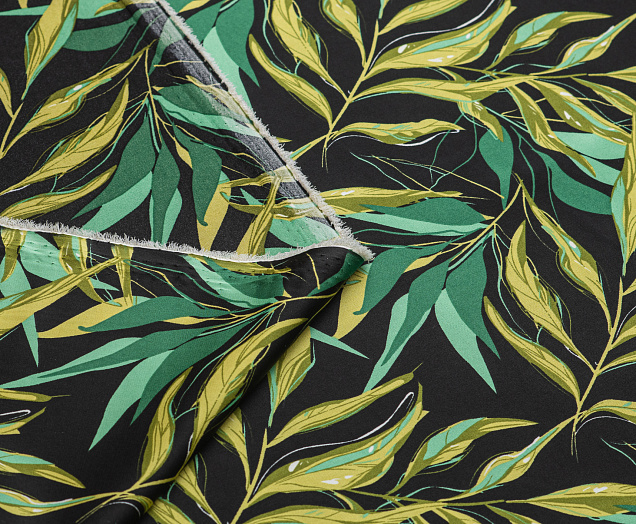 Ткань шелк Бавария принт № 41 Зеленые веточки на черном фоне