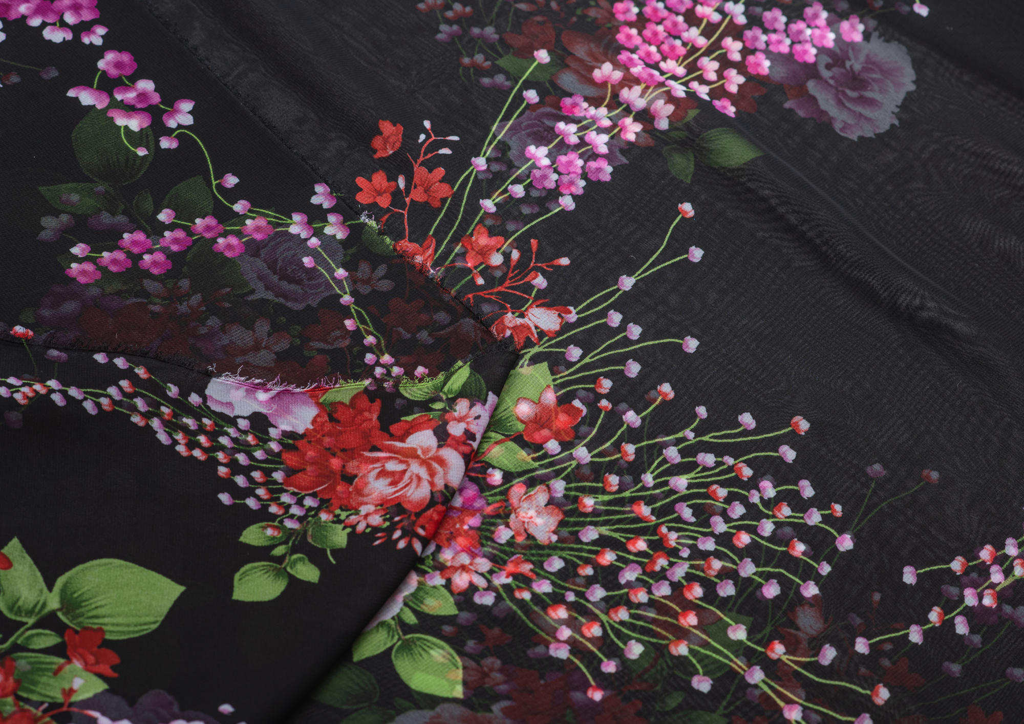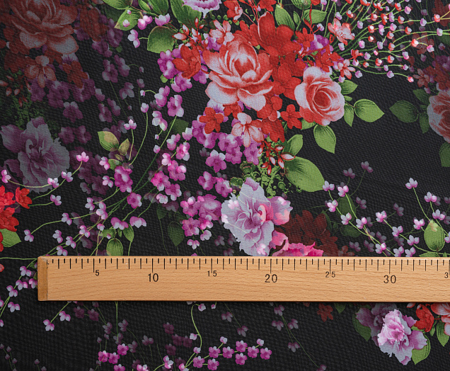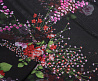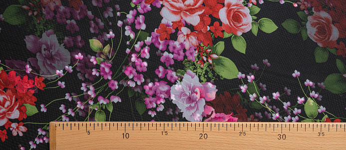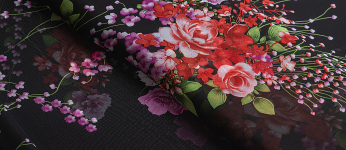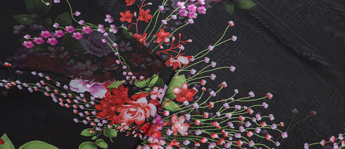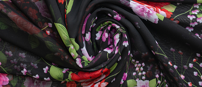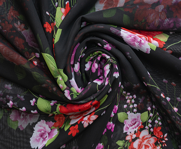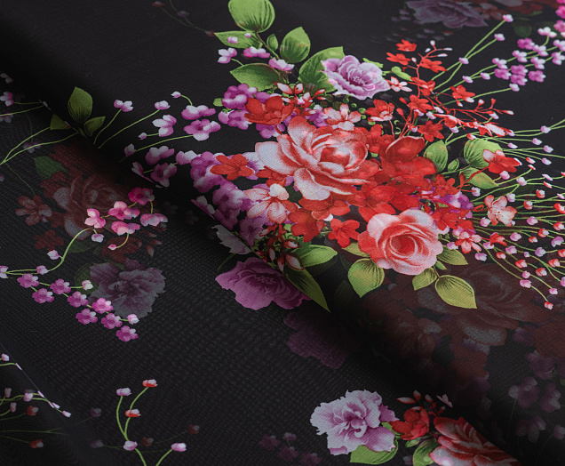 Ткань Шифон принт Розовые цветы на черном фоне № 53