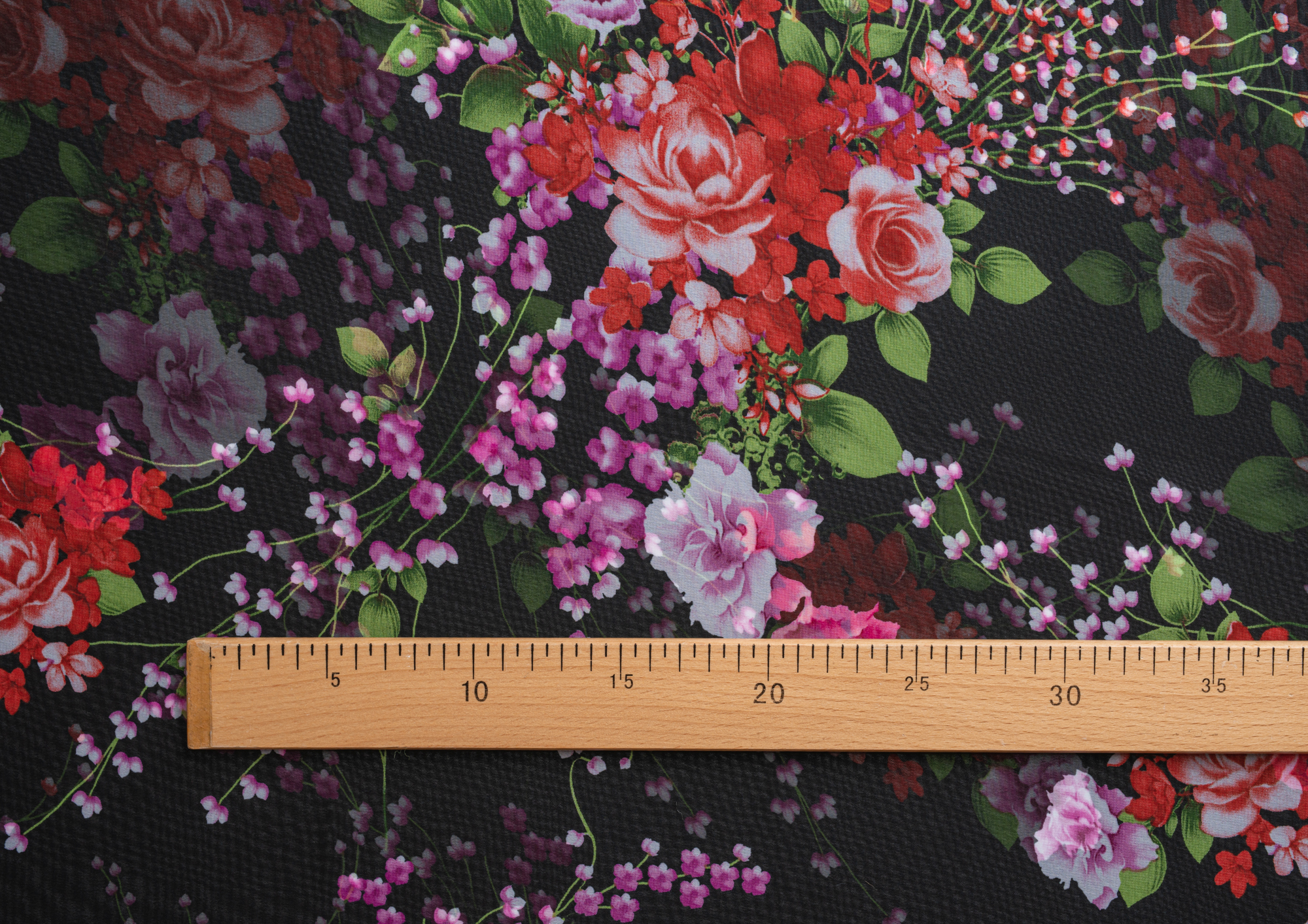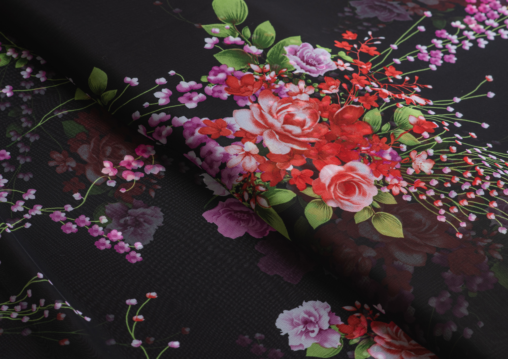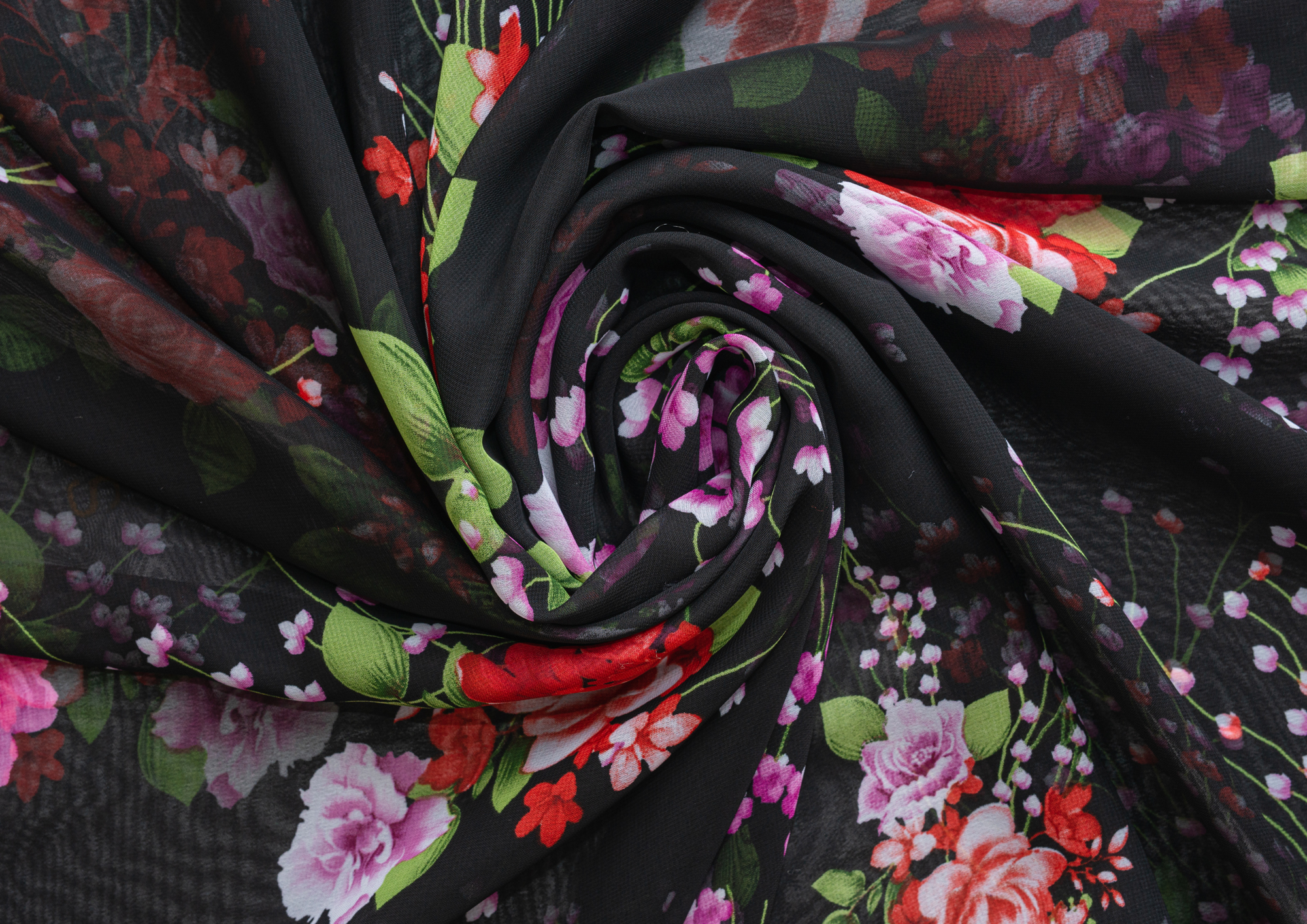 Ткань Шифон принт Розовые цветы на черном фоне № 53