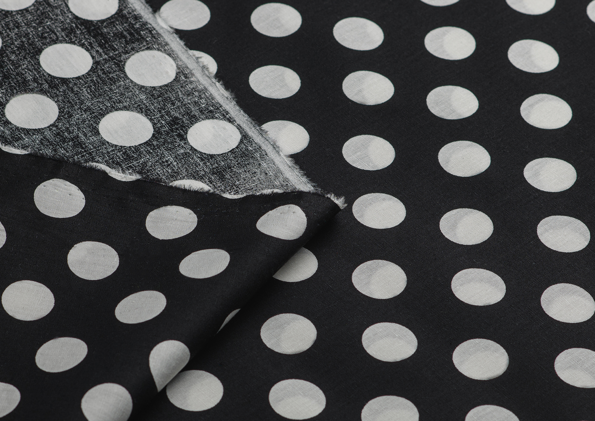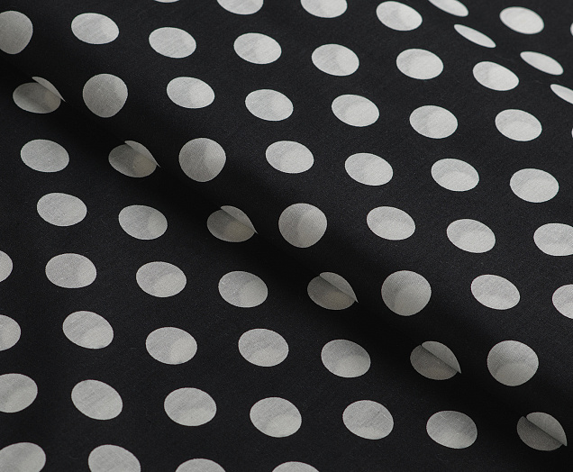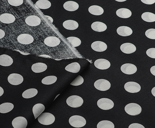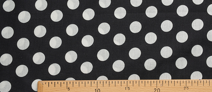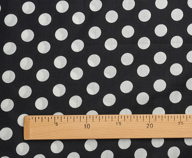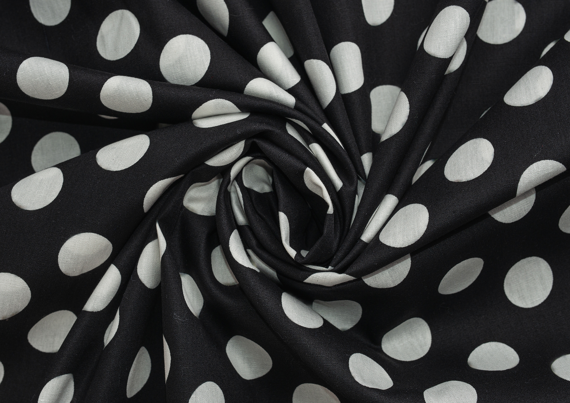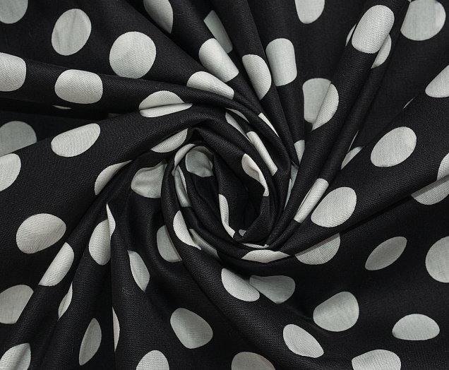 Хлопковая, средней плотности ткань. По всей поверхности полотна расположен принт горох d 1.8см. Ткань тонкая, при этом прочная, хорошо держит форму. Отлично подходит для пошива платьев, сарафанов, мужских и женских рубашек .