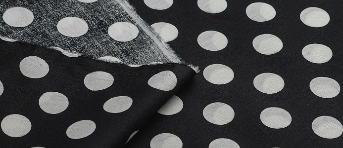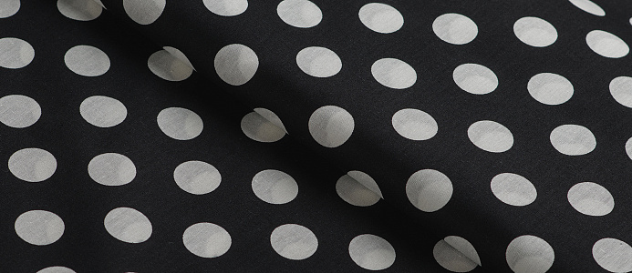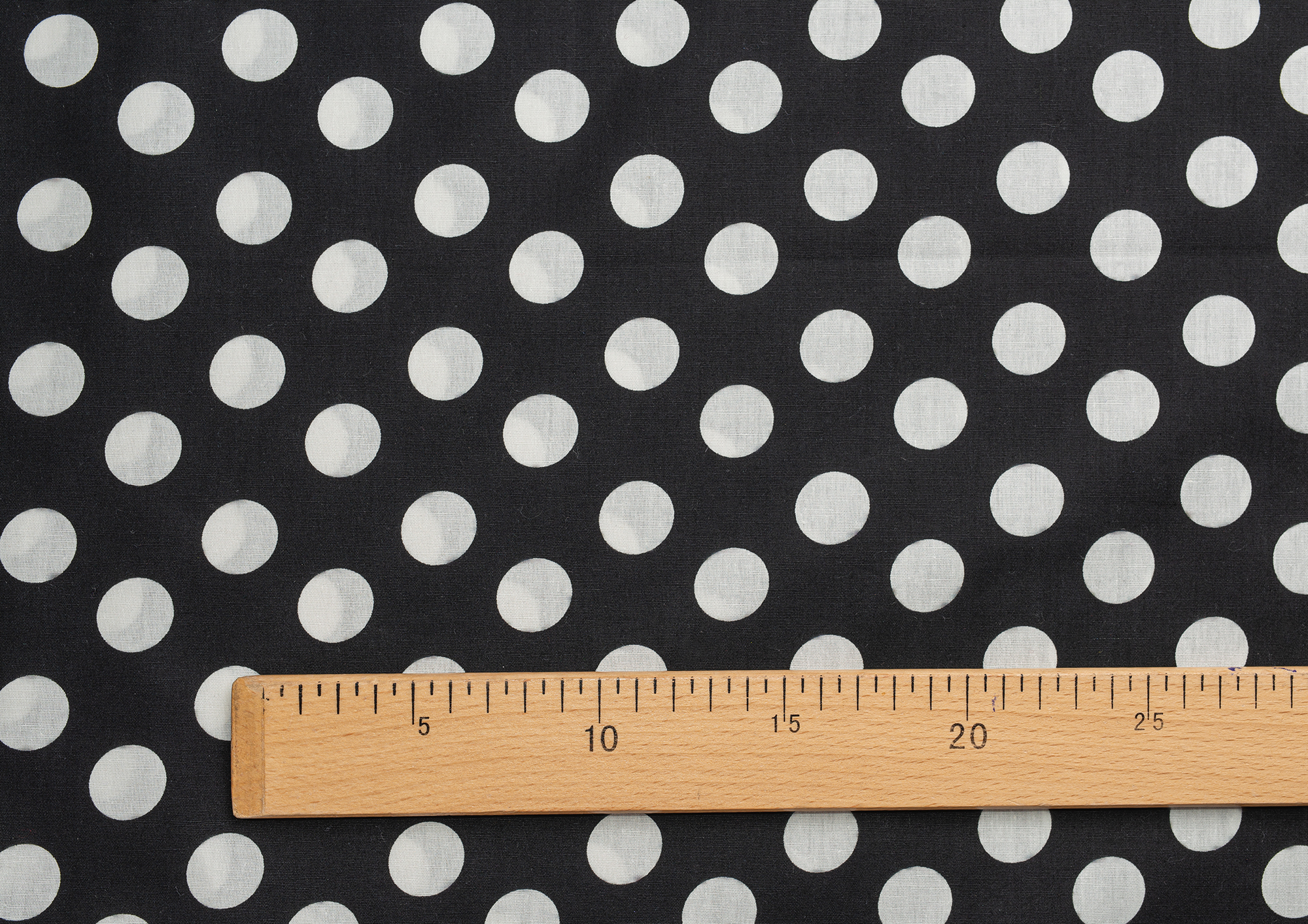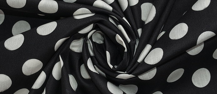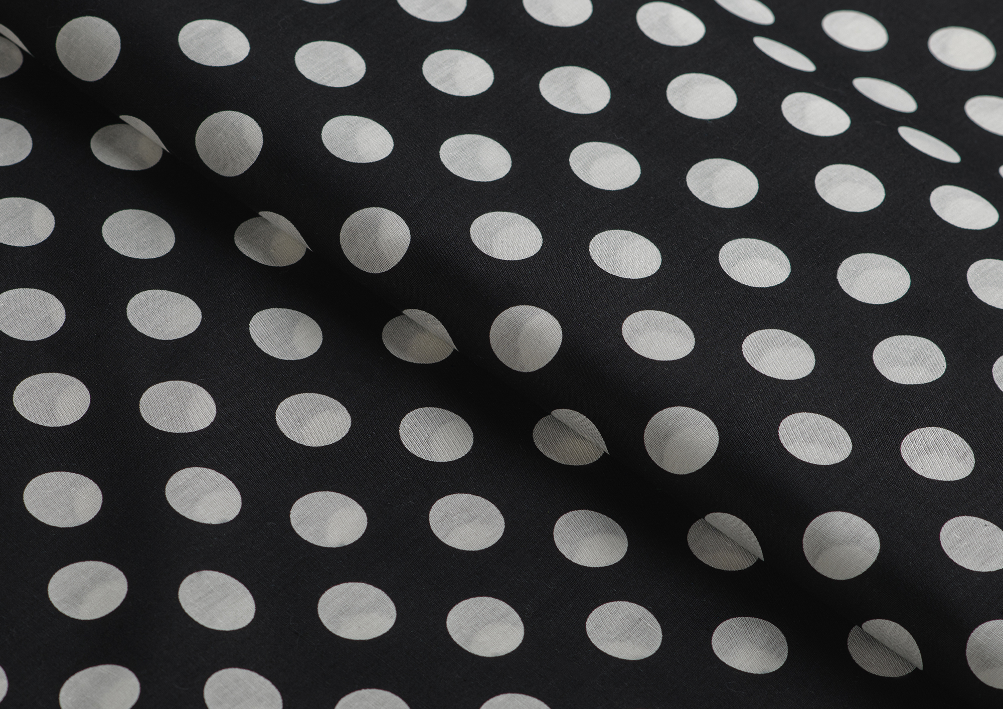 Хлопковая, средней плотности ткань. По всей поверхности полотна расположен принт горох d 1.8см. Ткань тонкая, при этом прочная, хорошо держит форму. Отлично подходит для пошива платьев, сарафанов, мужских и женских рубашек .