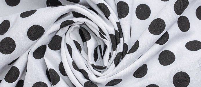 Хлопковая, средней плотности ткань. По всей поверхности полотна расположен принт горох d 1.8см. Ткань тонкая, при этом прочная, хорошо держит форму. Отлично подходит для пошива платьев, сарафанов, мужских и женских рубашек .