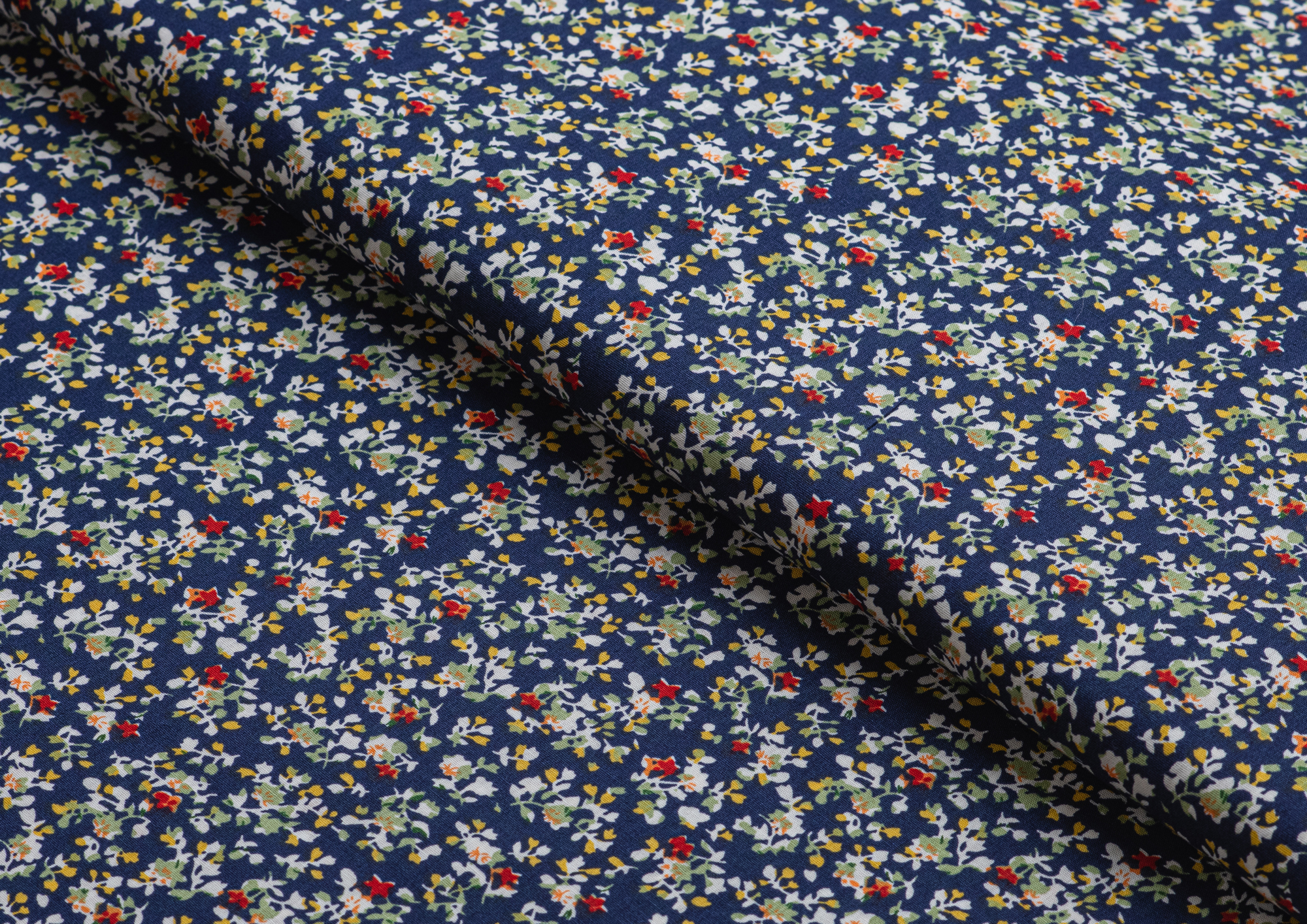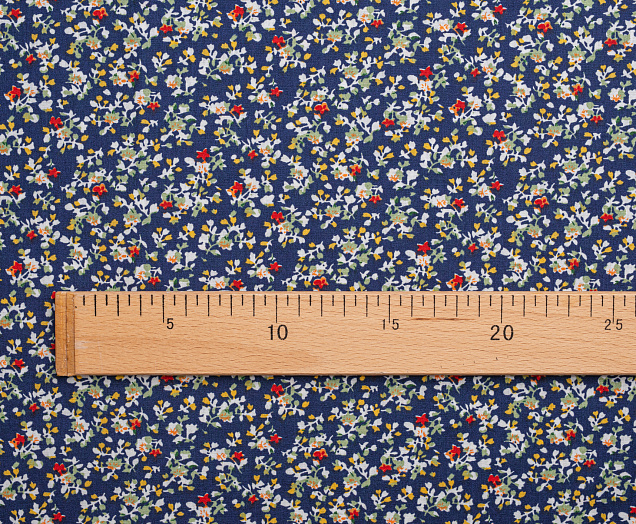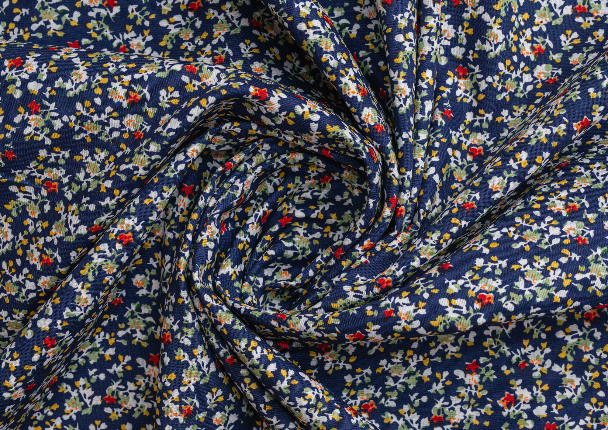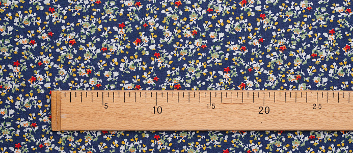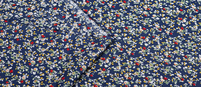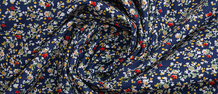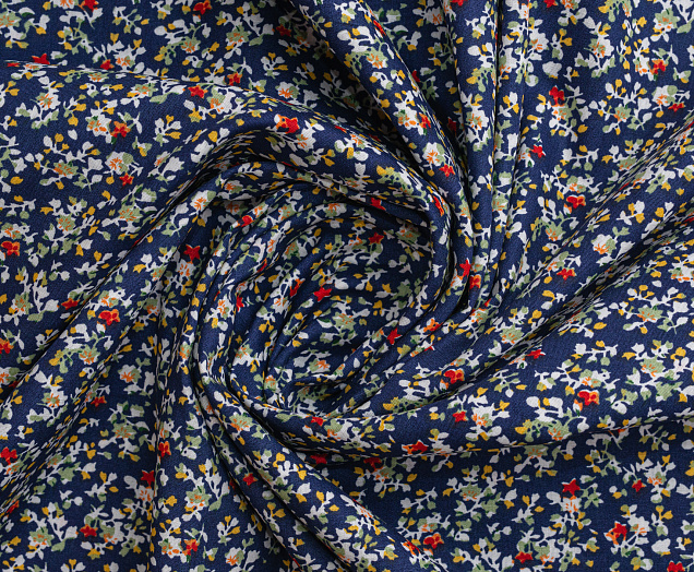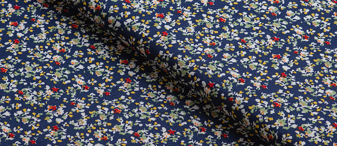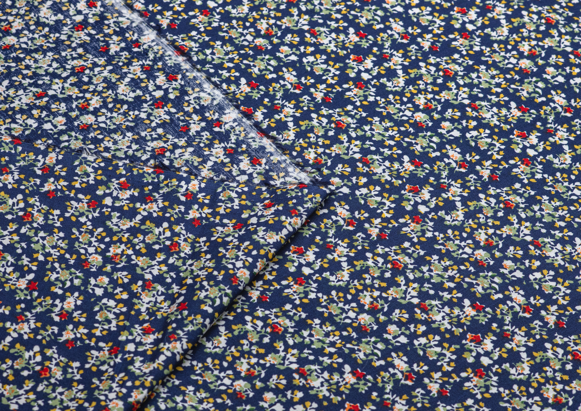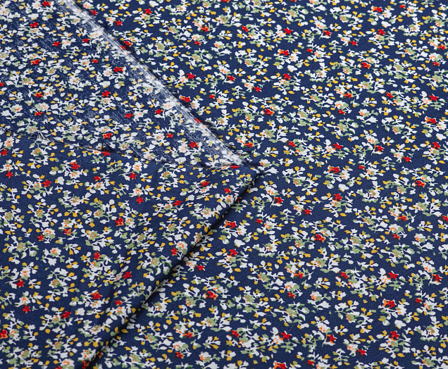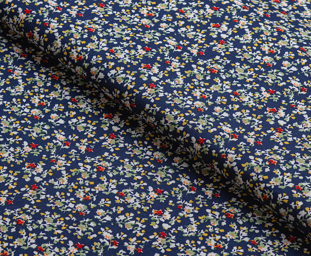 Хлопковая средней плотности ткань с матовой поверхностью. По всей поверхности полотна расположен мелкий цветочный принт. Материал тонкий,при этом прочный, держит форму. Это оптимальная  ткань для пошива  платьев, сарафанов, блуз и рубашек. Отличное решение для жаркой погоды.