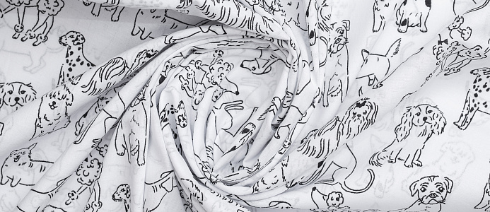 Хлопковая ткань по всей поверхности которой расположен принт- собачки. Рисунок расположен в одном направлении !!! Материал тонкий, эластичный, но при этом прочный и формоустойчивый. Подходит для пошива легких блуз и рубашек, платьев и сарафанов.