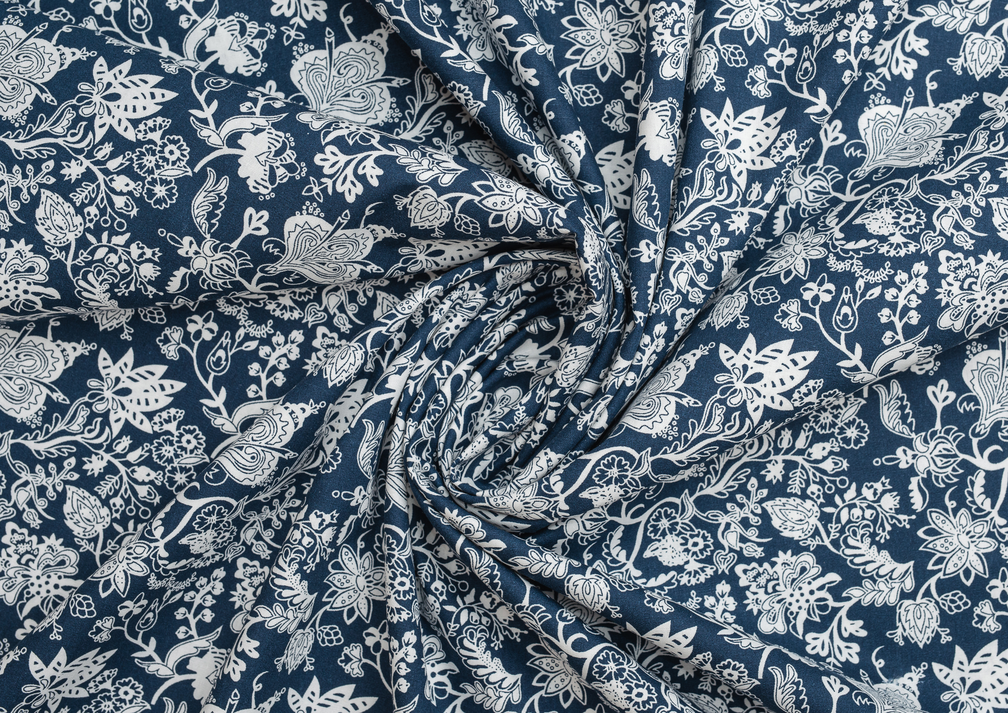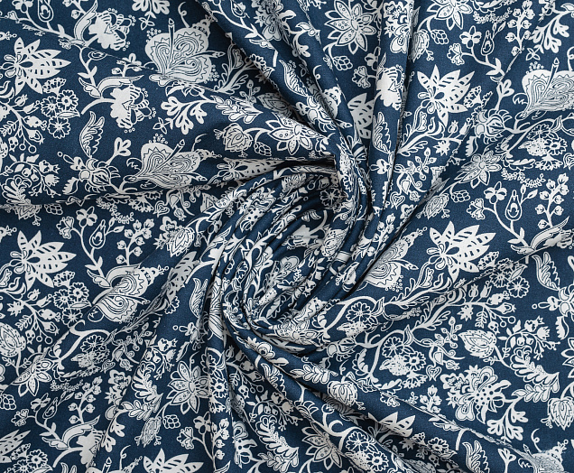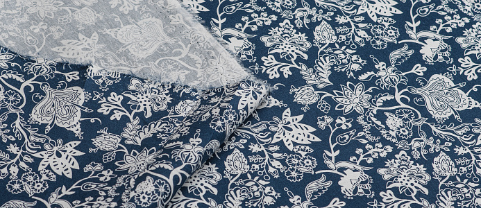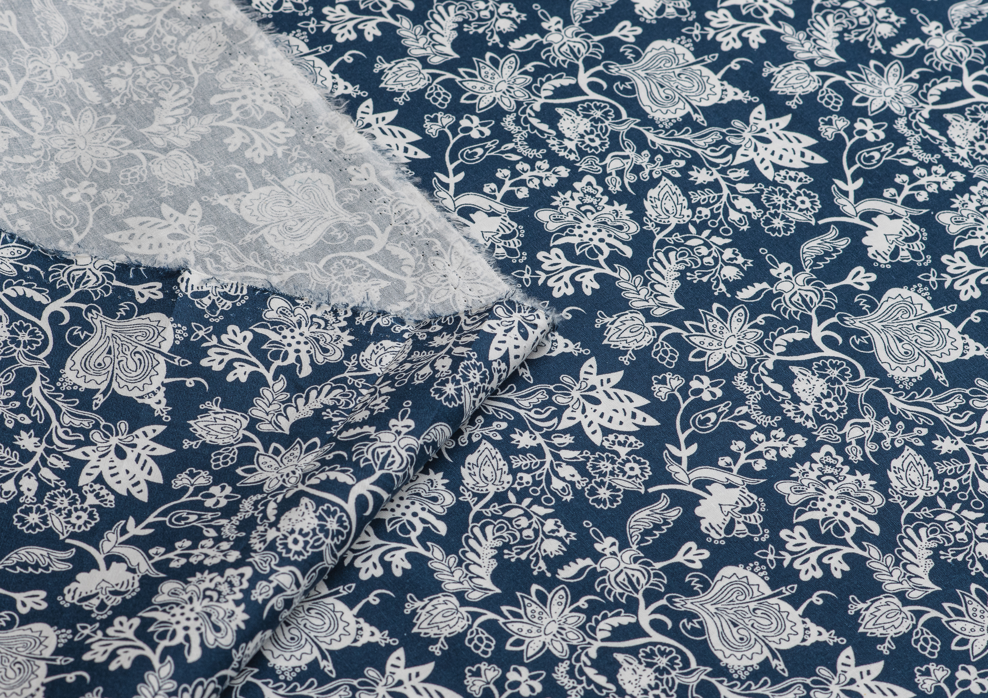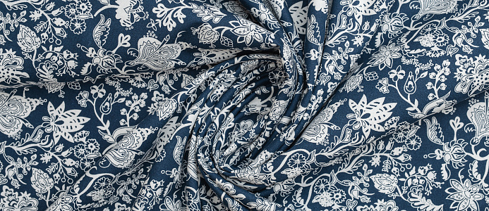 Хлопковая , средней плотности ткань с эластаном. По всей поверхности полотна расположен растительны принт. Ткань тонкая, при этом прочная , хорошо держит форму . Отлично подходит для пошива платьев , сарафанов , мужских и женских рубашек .