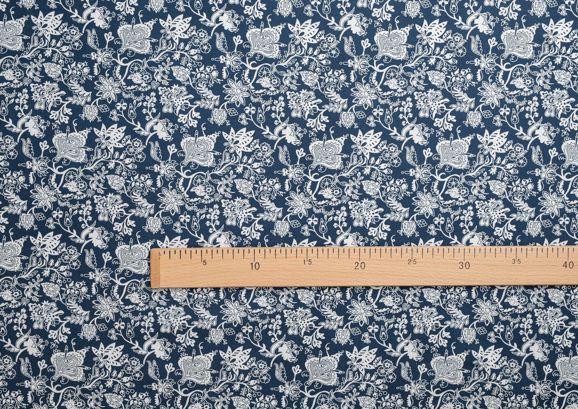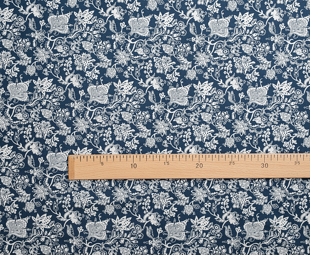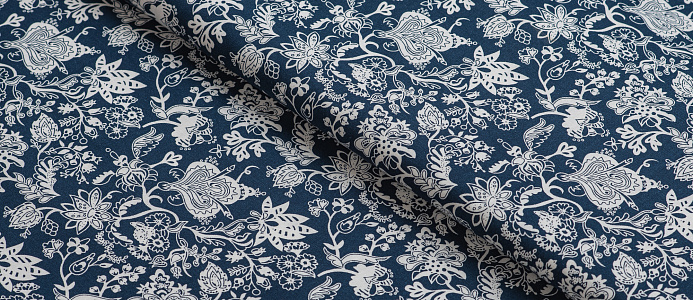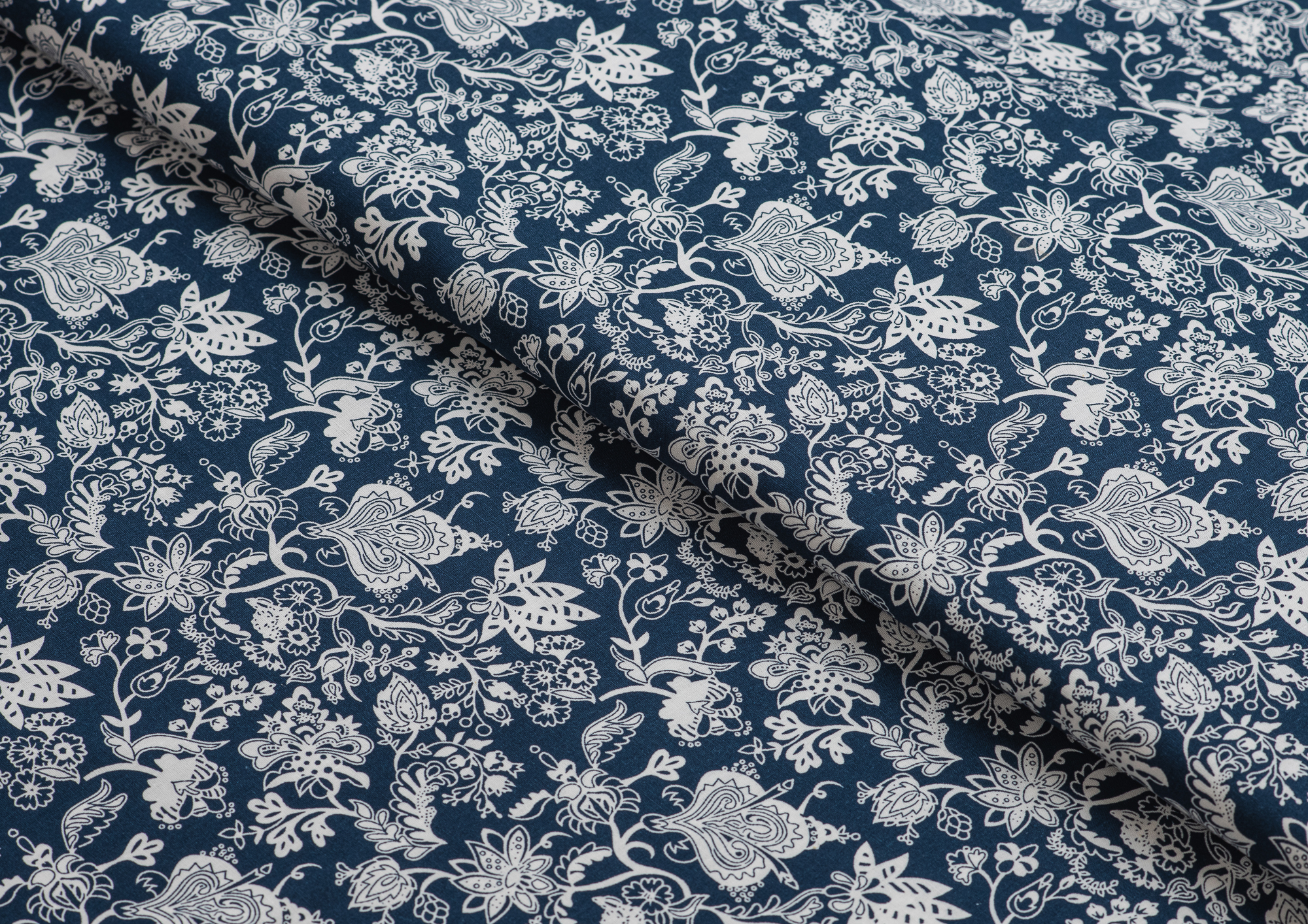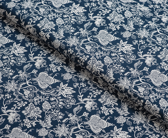 Хлопковая , средней плотности ткань с эластаном. По всей поверхности полотна расположен растительны принт. Ткань тонкая, при этом прочная , хорошо держит форму . Отлично подходит для пошива платьев , сарафанов , мужских и женских рубашек .