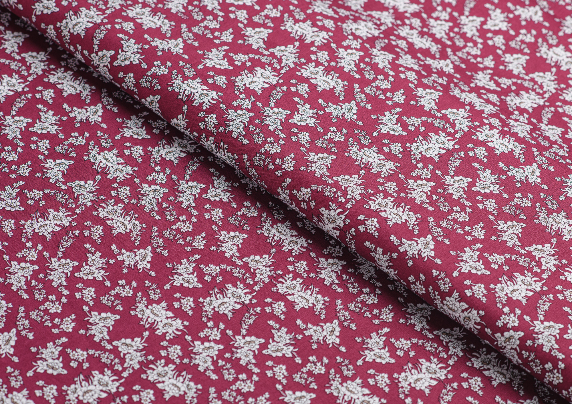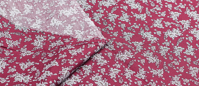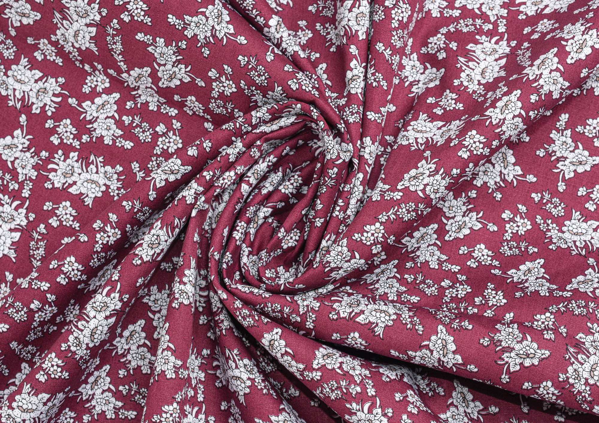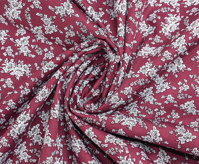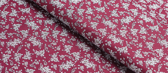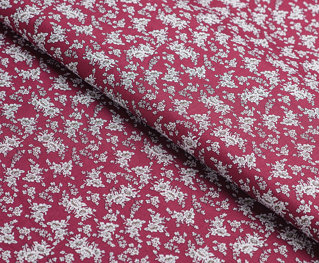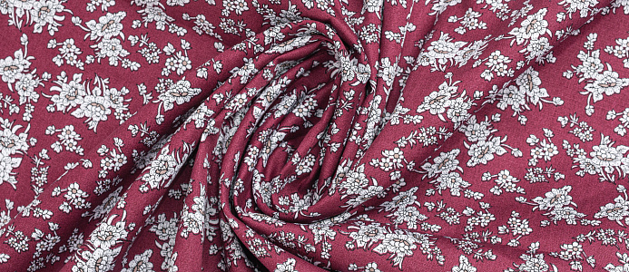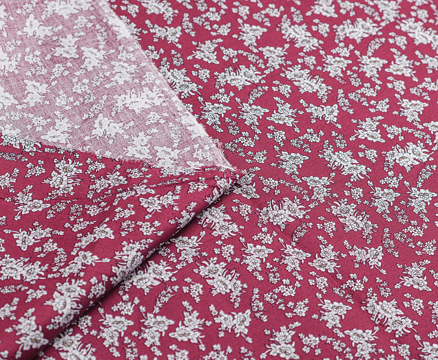 Хлопковая плотная ткань по всей поверхности которой расположен мелкий цветочный принт. Материал тонкий, эластичный, но при этом прочный и формоустойчивый. Подходит для пошива легких блуз и рубашек, платьев и сарафанов.