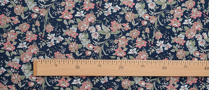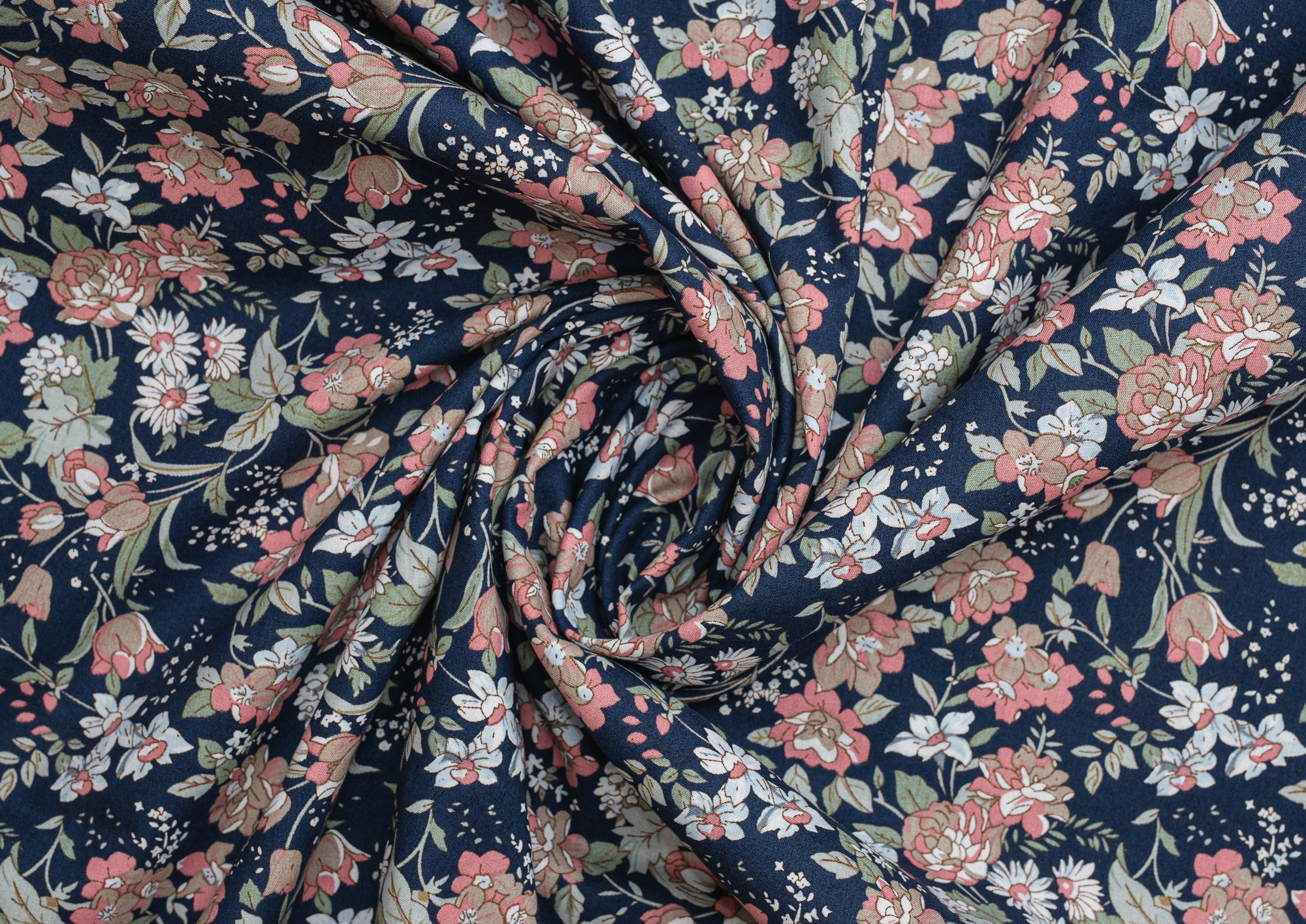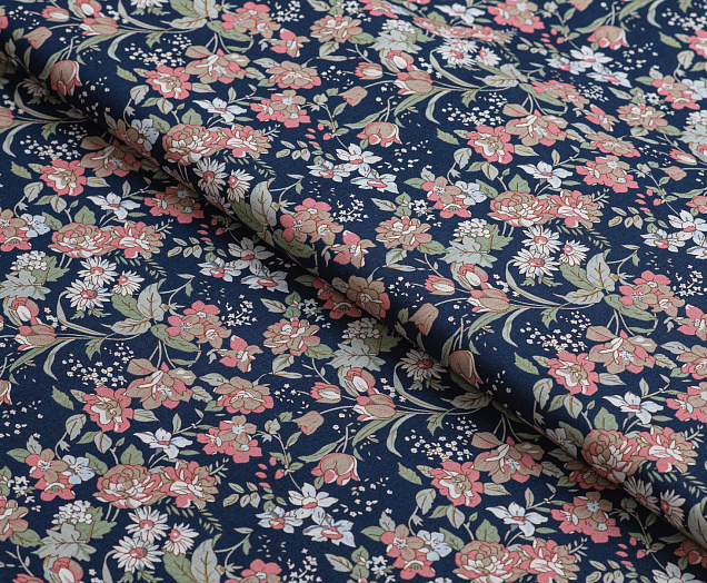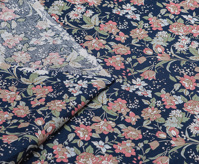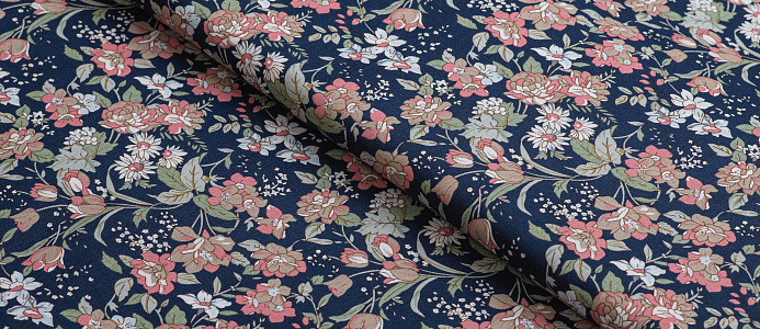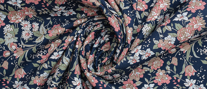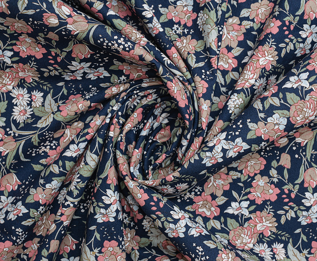 Хлопковая плотная ткань по всей поверхности которой расположен мелкий цветочный принт. Материал тонкий, эластичный, но при этом прочный и формоустойчивый. Подходит для пошива легких блуз и рубашек, платьев и сарафанов.