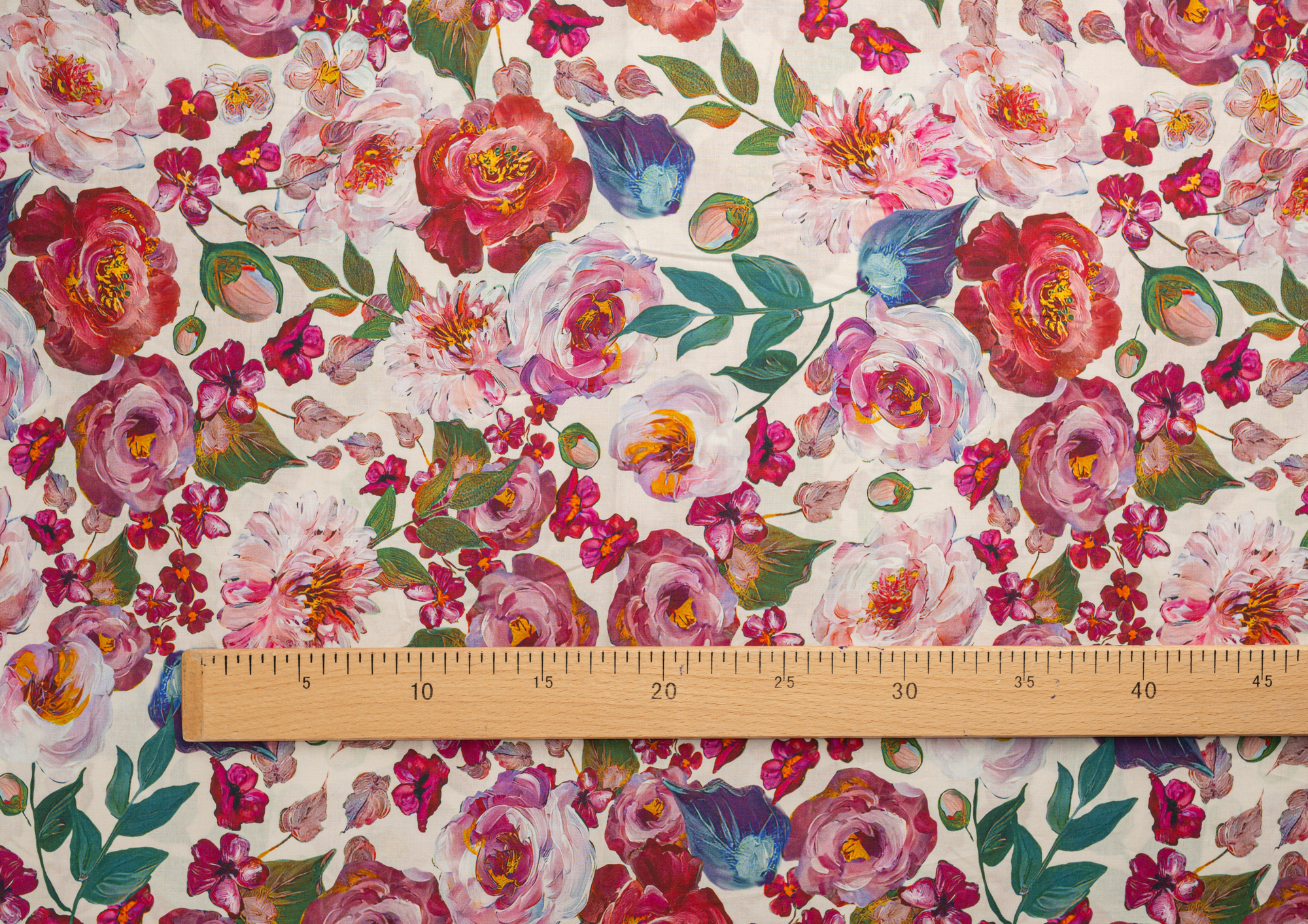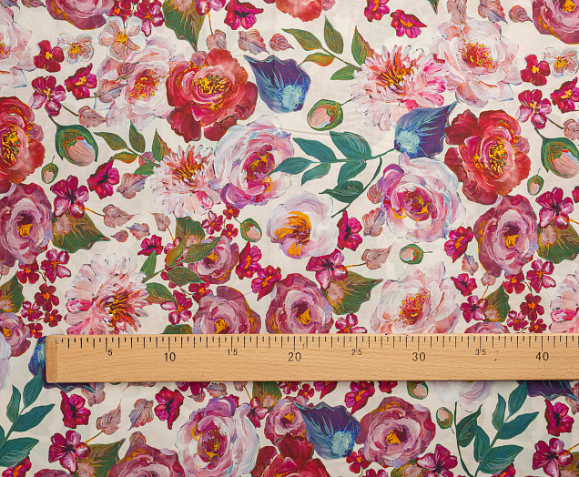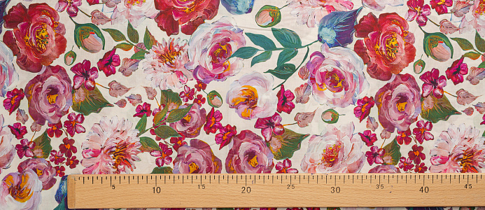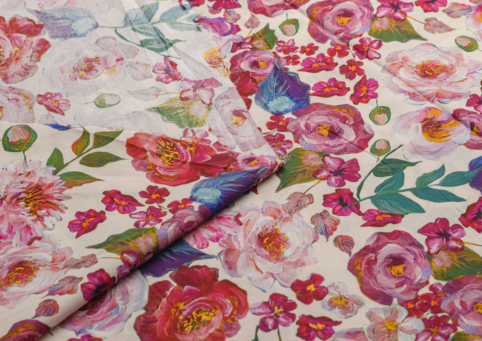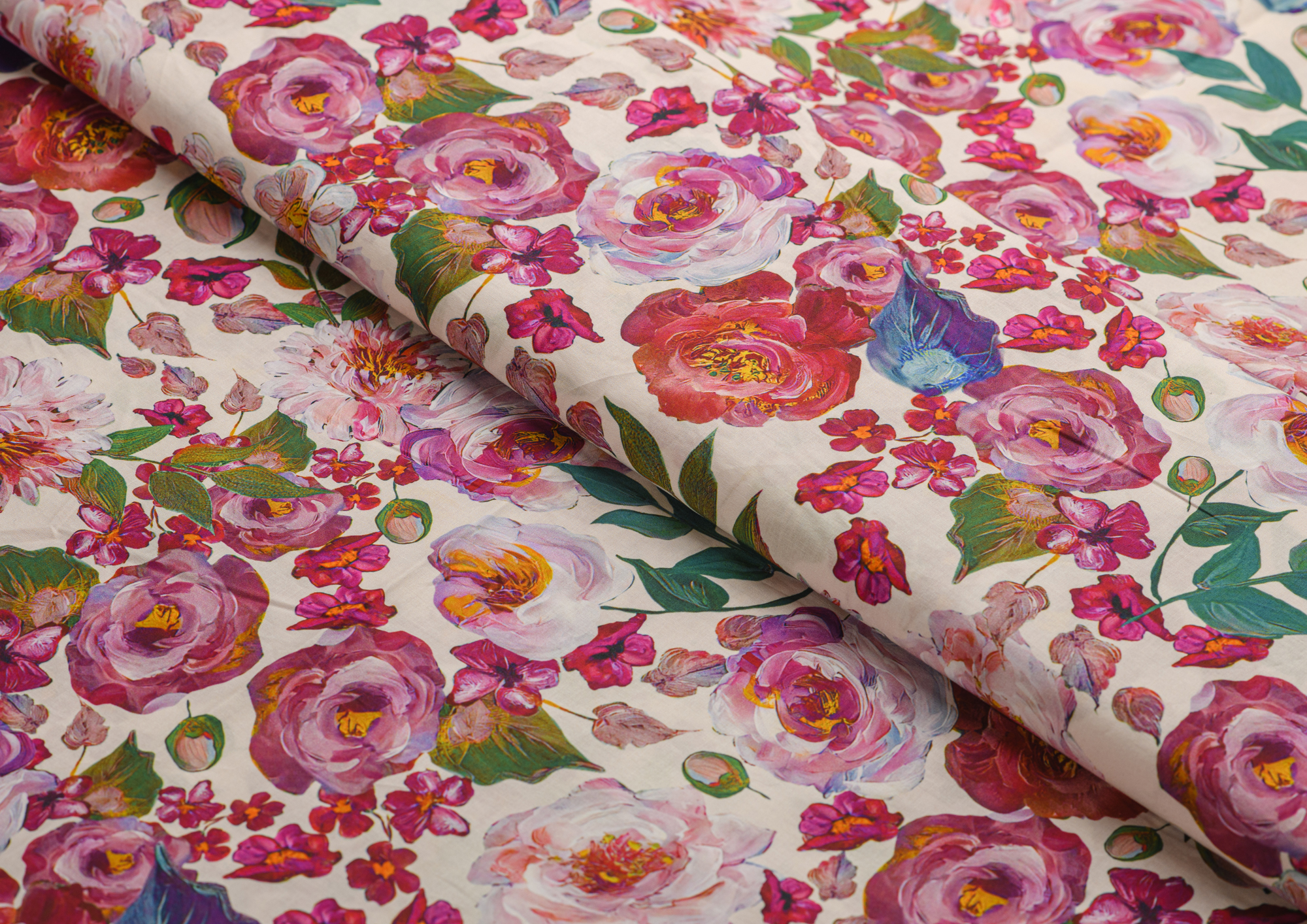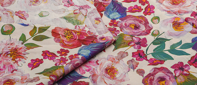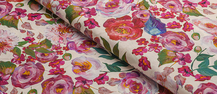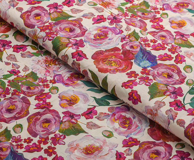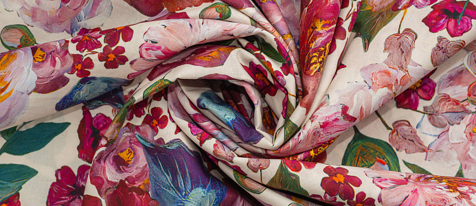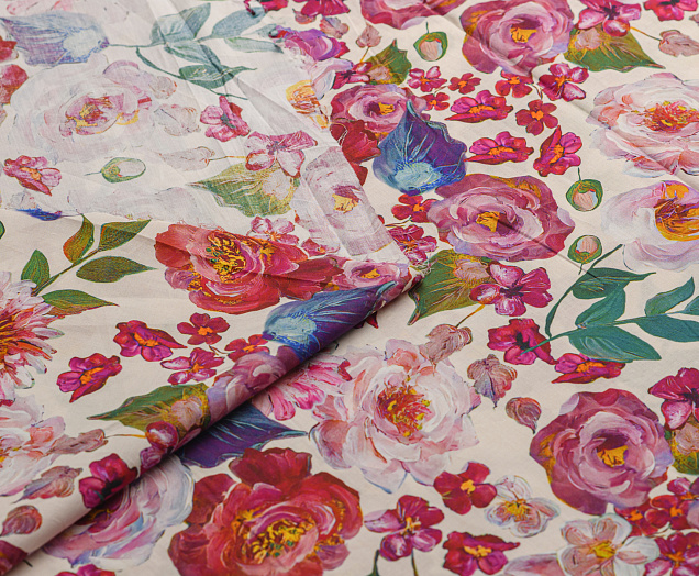 Хлопковая, средней плотности ткань с эластаном. По всей поверхности полотна расположен принт. Ткань тонкая, при этом прочная, хорошо держит форму. Отлично подходит для пошива платьев, сарафанов, мужских и женских рубашек .