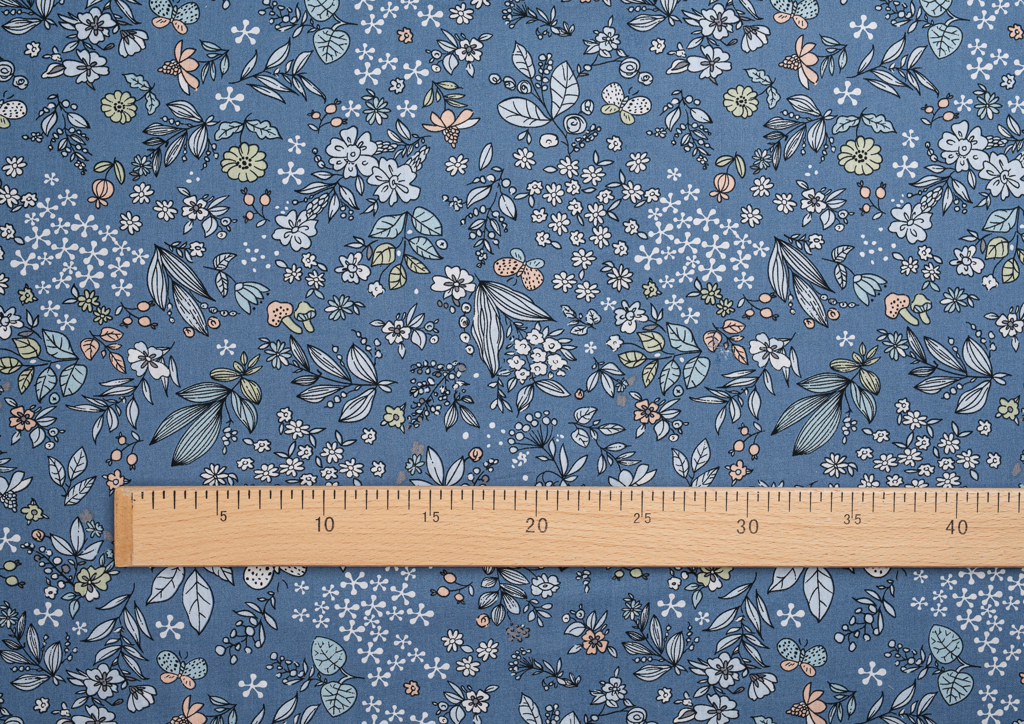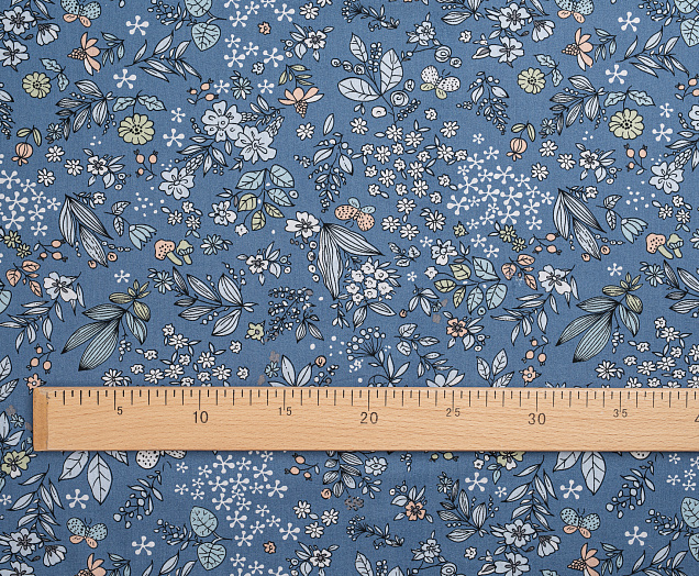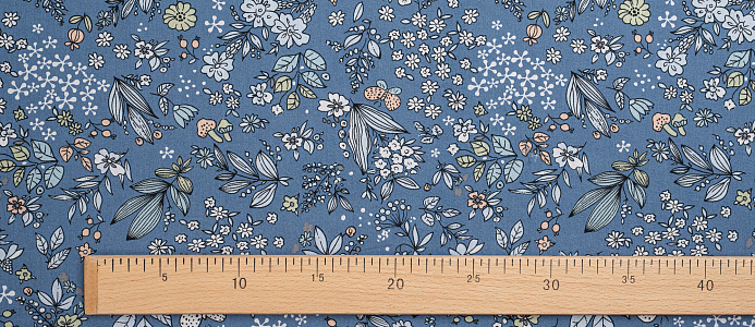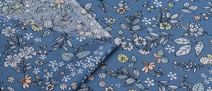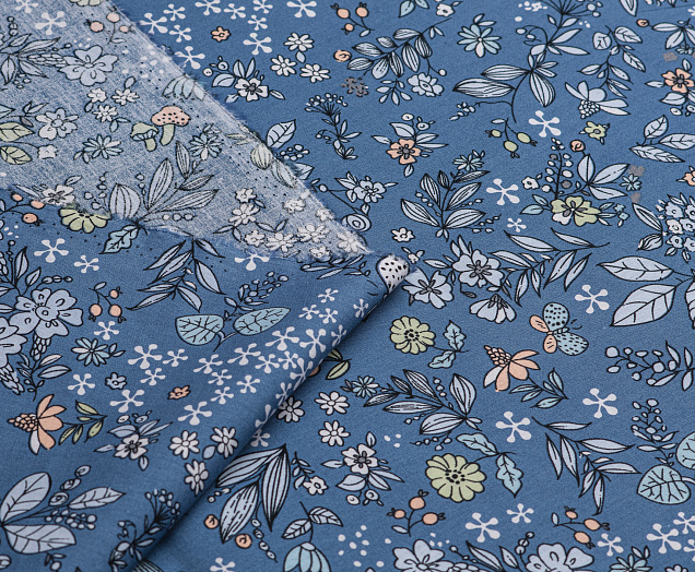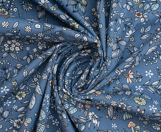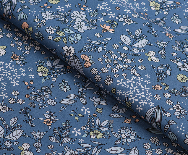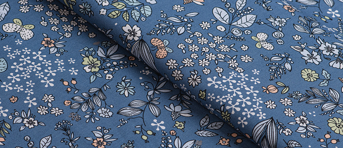 Ткань Поплин стрейч принт Синие букеты на синем